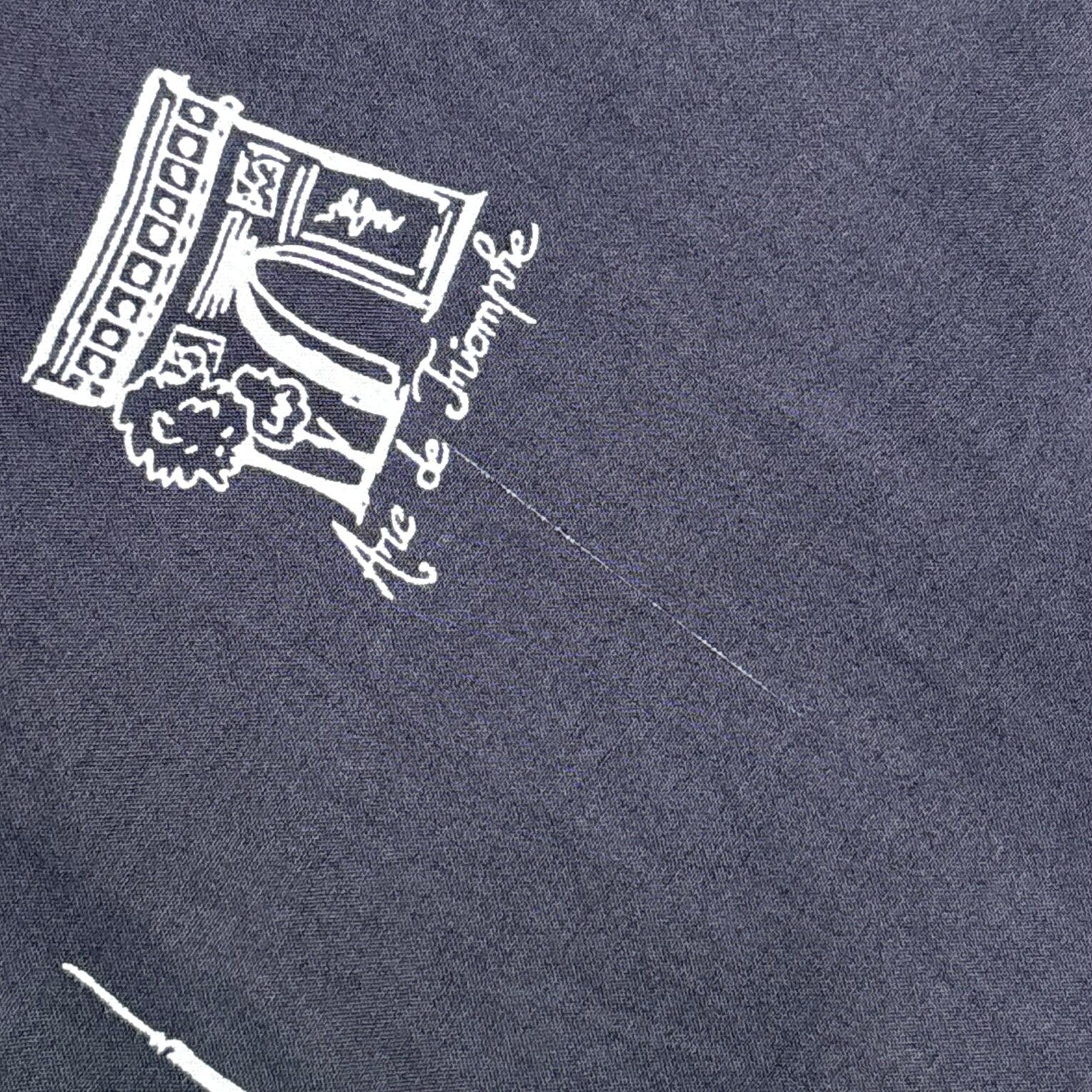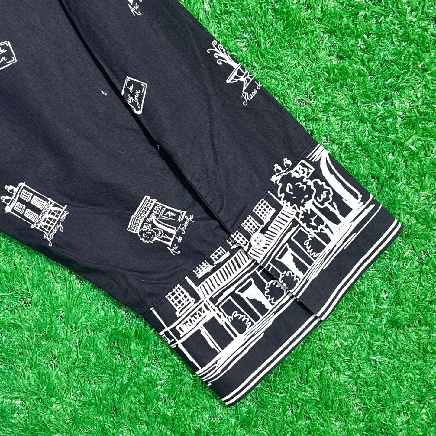 ブラックベースに白のイラストで、パリの街並みが描かれた総柄デザインが目を惹きます。裾と袖のイラストもアクセントに。さらっとしたポリエステル系の素材感で、軽やかな着心地も魅力です。