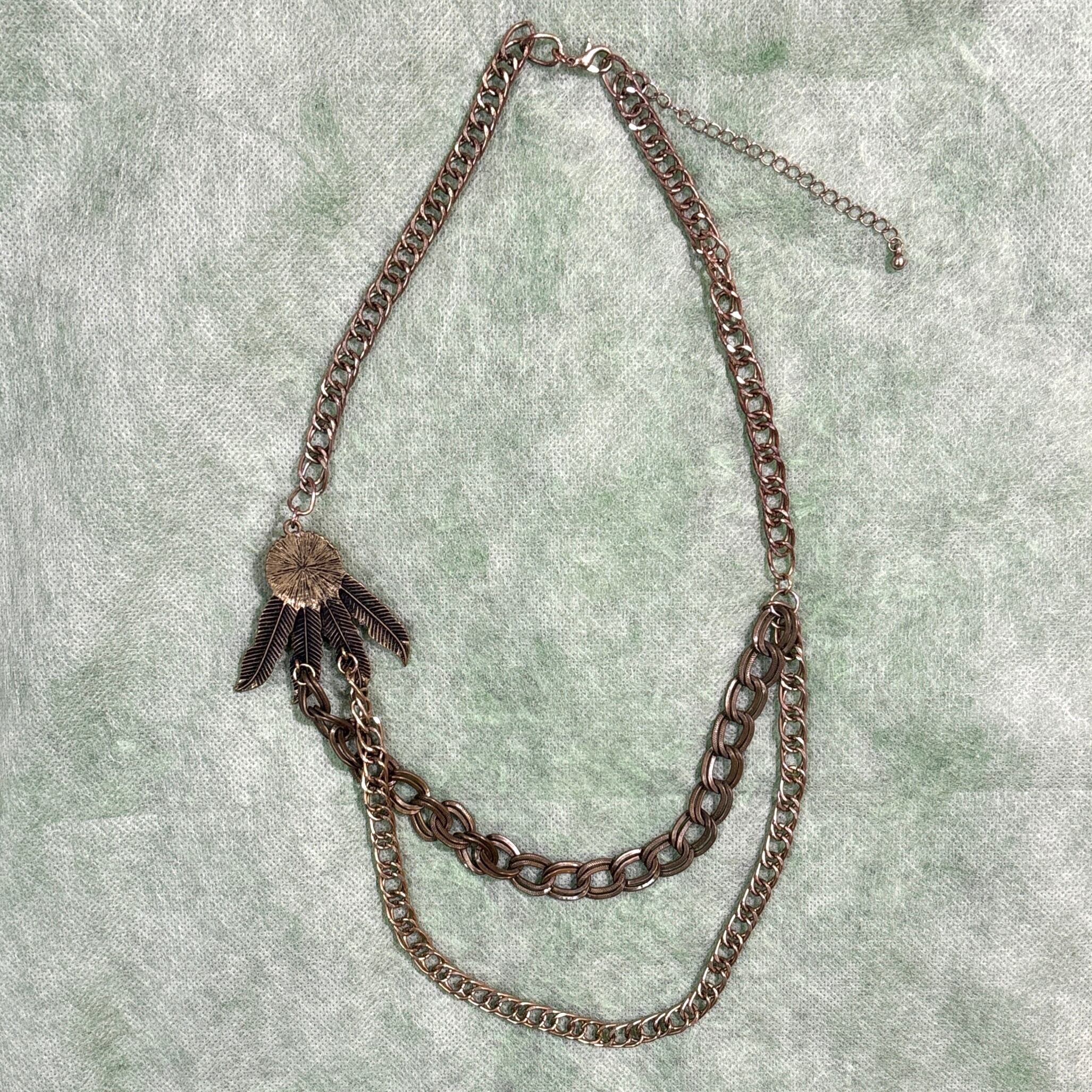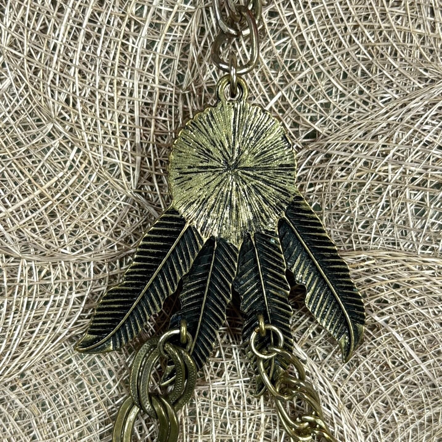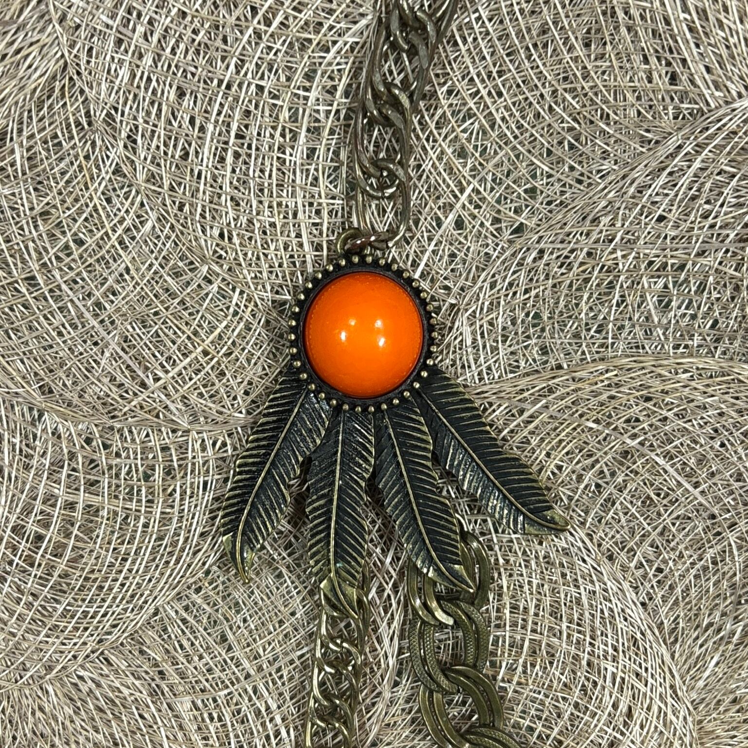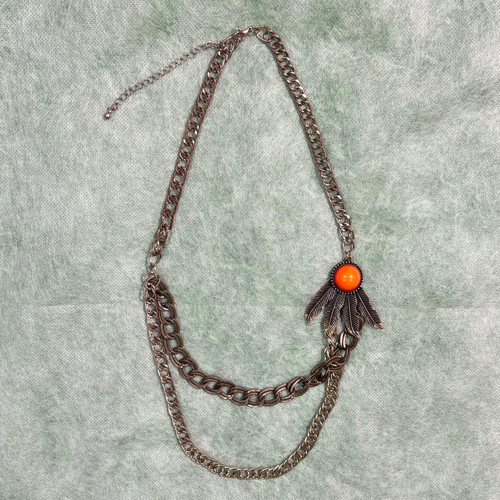 重厚感のあるアンティークゴールド調のチェーンに、オレンジビーズとフェザーモチーフがアクセントになったネックレスです。二連風のチェーンデザインで、胸元に立体感と存在感をプラス。ネイティブやボヘミアン、ヴィンテージライクなコーディネートにぴったりの一品です。