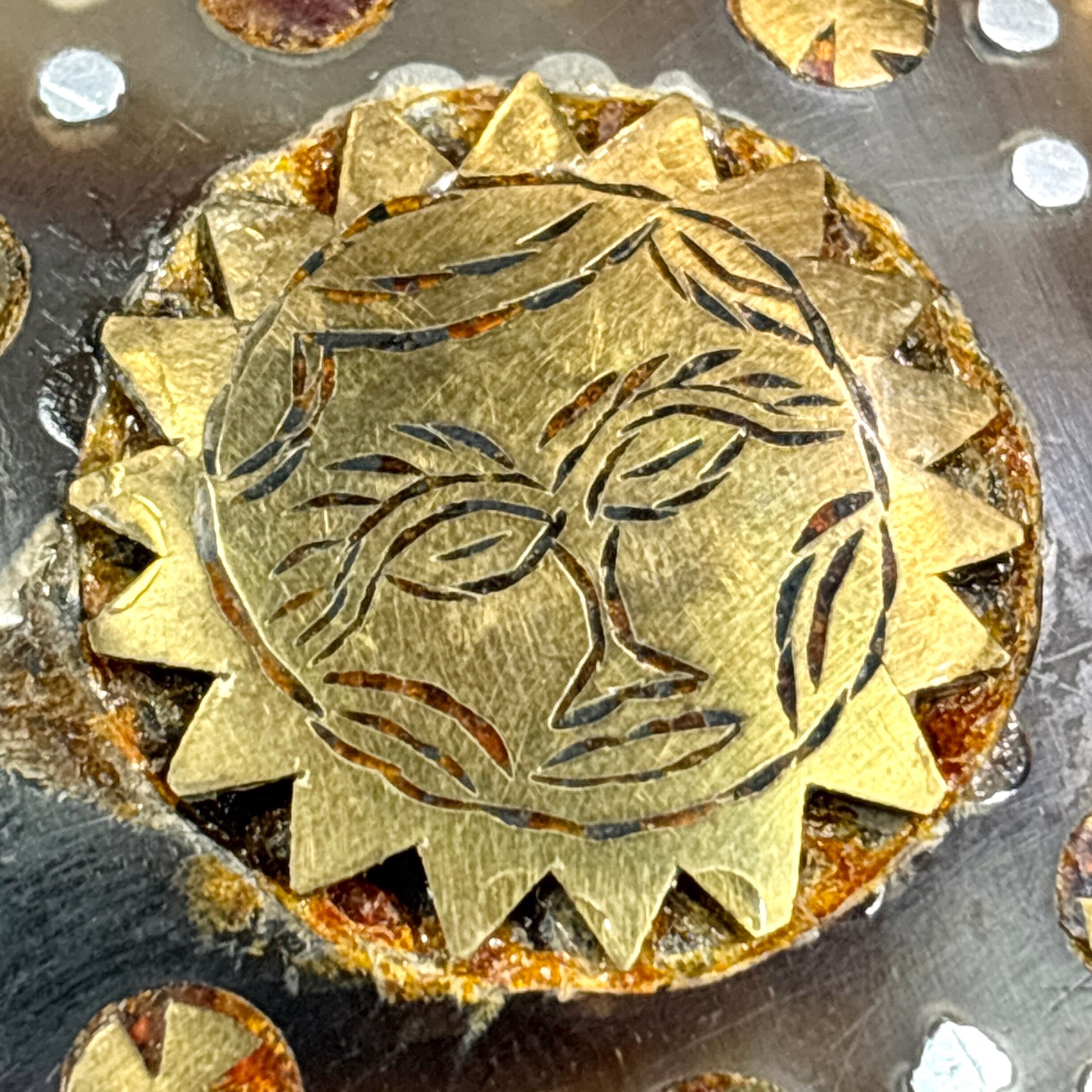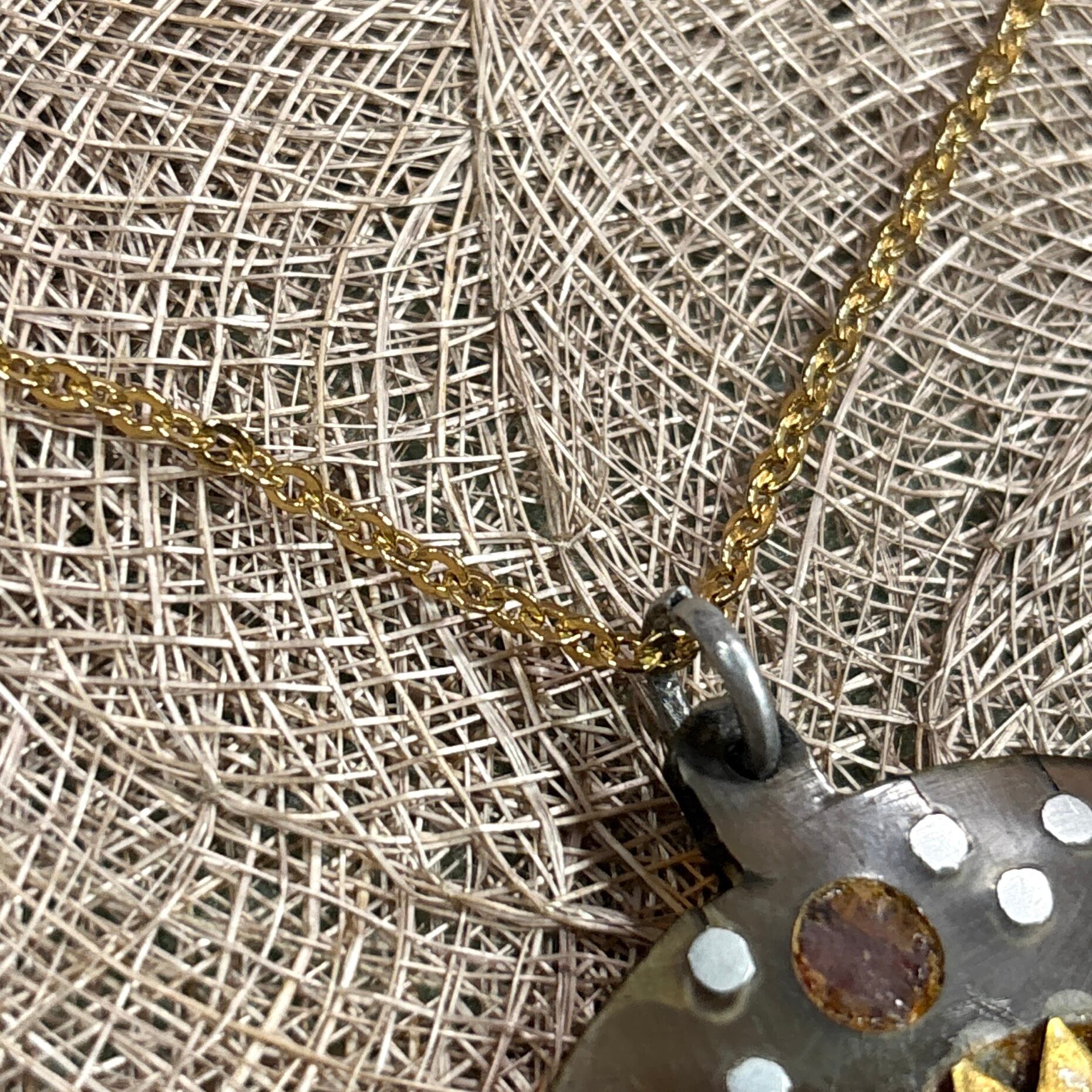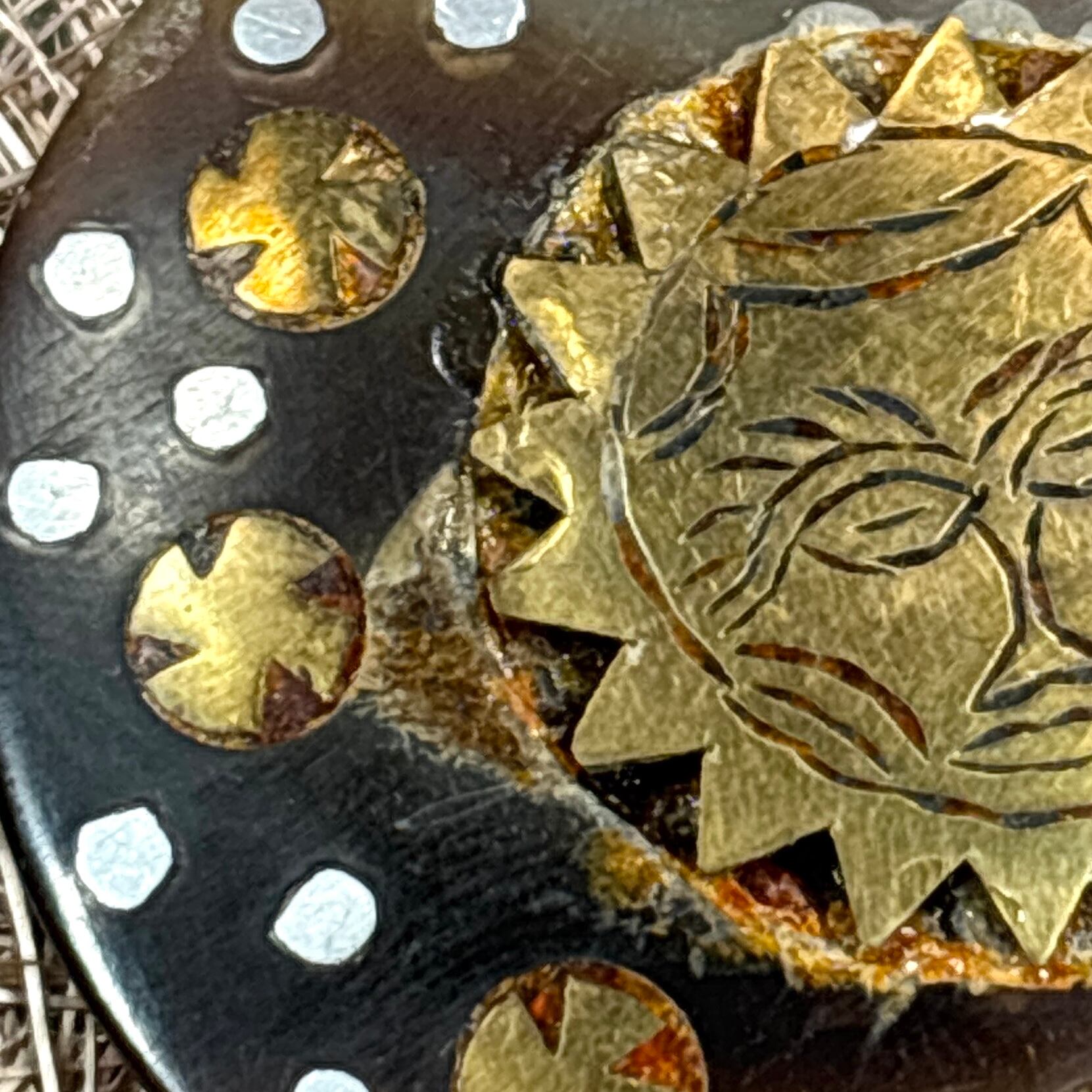 太陽モチーフが印象的なペンダントネックレスです。大ぶりなトップが存在感抜群。ネイティブや民族調の雰囲気を持ちつつ、ヒッピーやボヘミアンスタイルにも馴染むアート性の高いアクセサリーです。チェーンは長めで、コーディネートのアクセントとして使いやすい一本です。