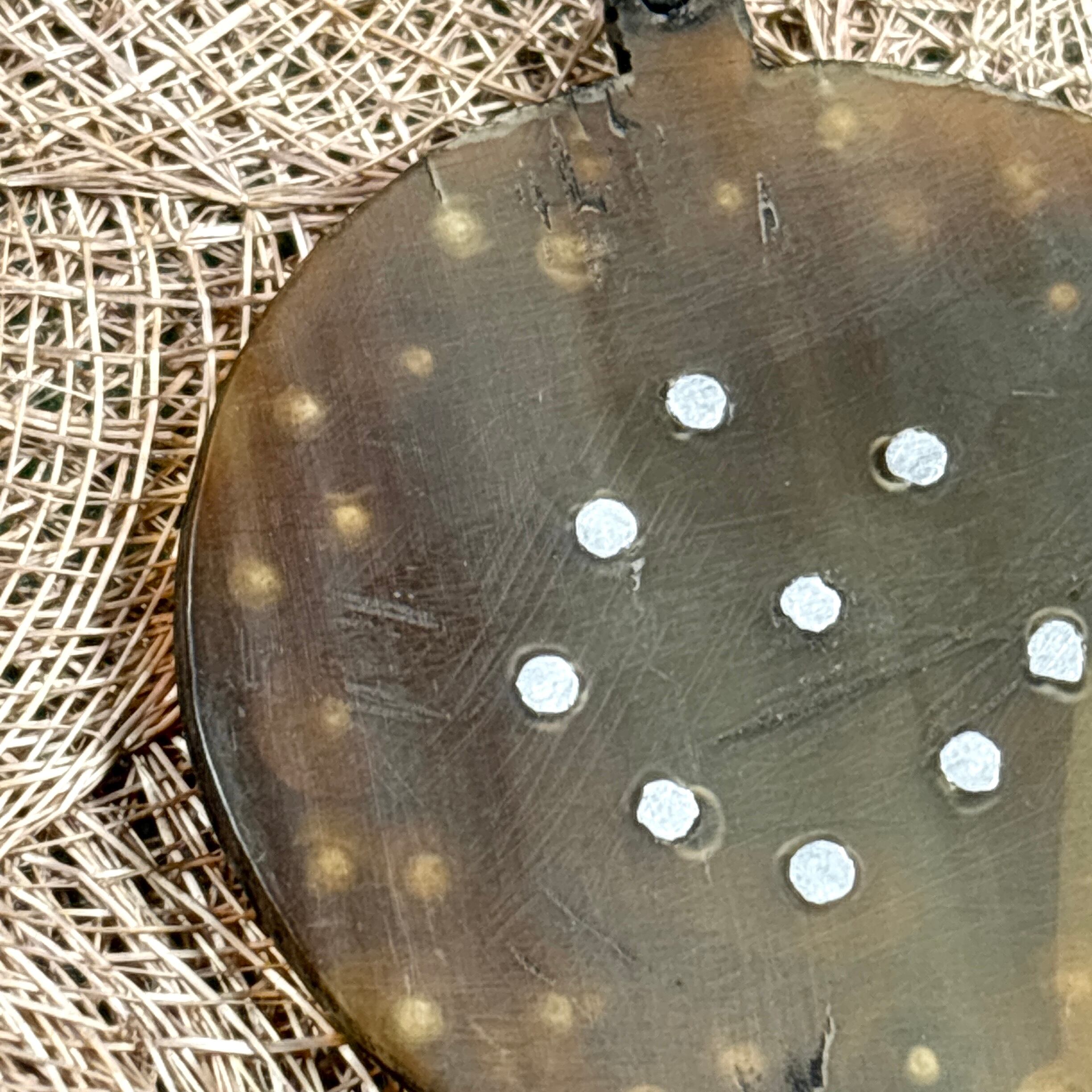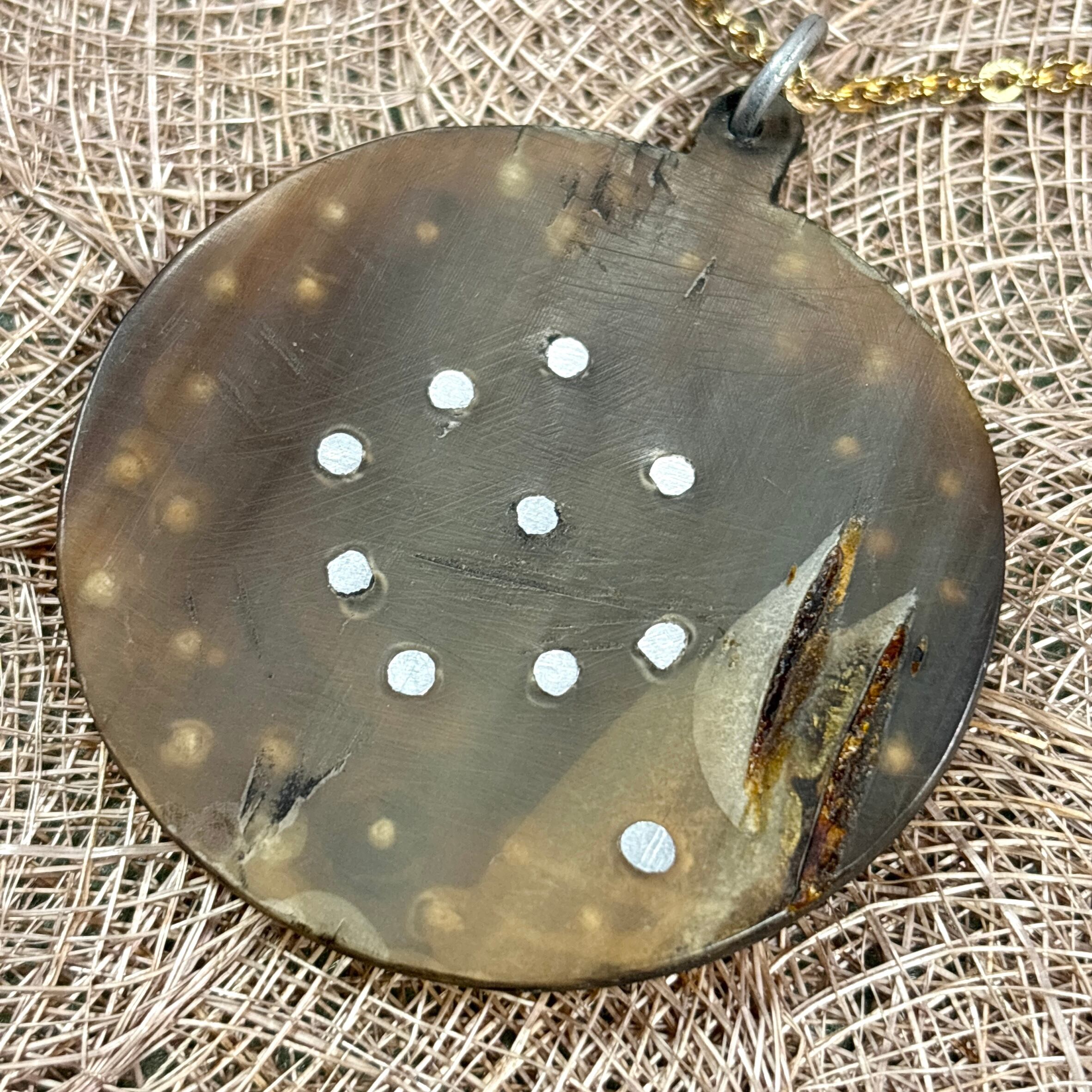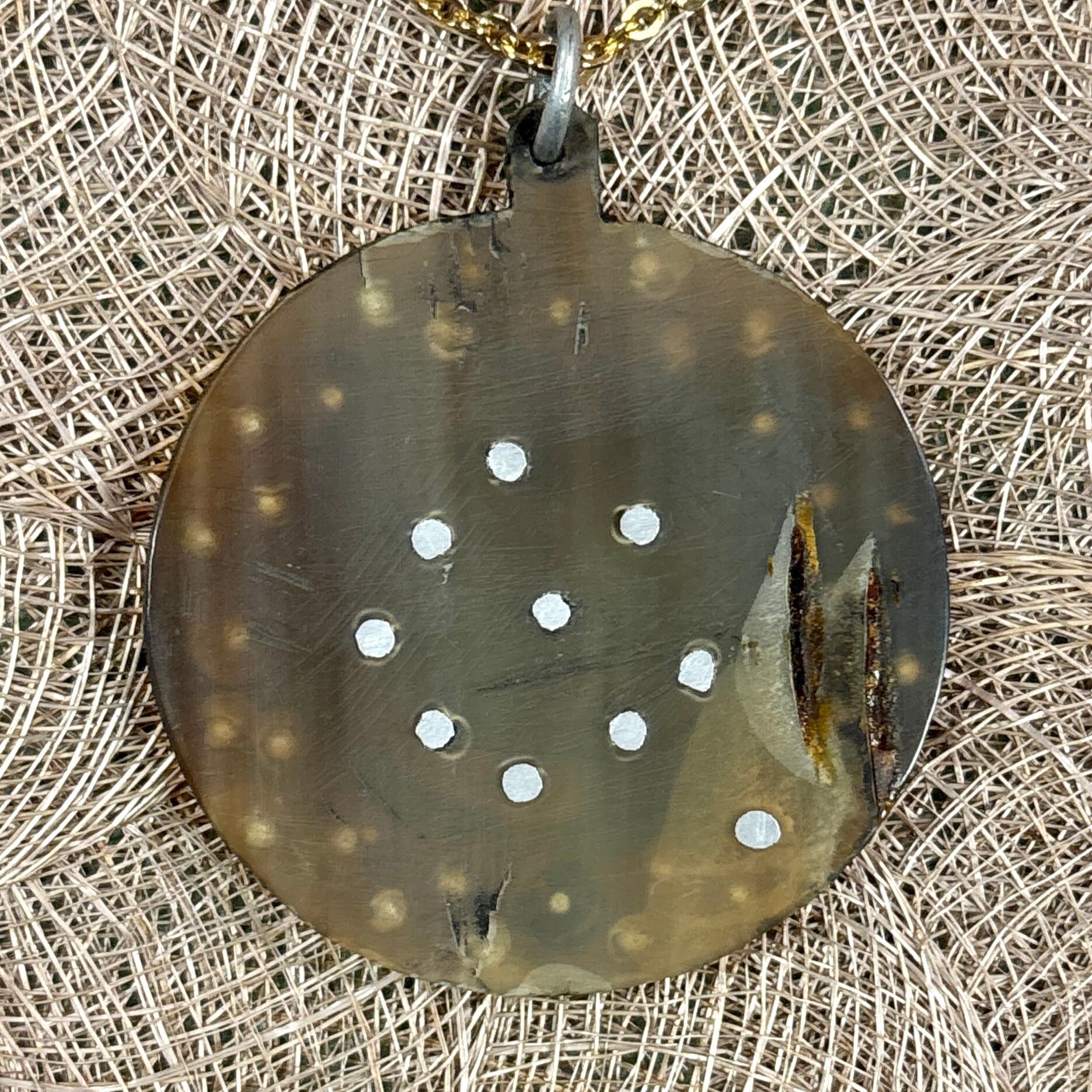 太陽モチーフが印象的なペンダントネックレスです。大ぶりなトップが存在感抜群。ネイティブや民族調の雰囲気を持ちつつ、ヒッピーやボヘミアンスタイルにも馴染むアート性の高いアクセサリーです。チェーンは長めで、コーディネートのアクセントとして使いやすい一本です。