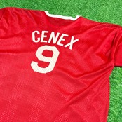 フロントは赤×白の太ストライプ、背面には「CENEX 9」のプリントが入り、スポーティーな雰囲気たっぷり。軽量で通気性の良いメッシュ生地は、夏場やスポーツシーンにも快適な着心地を提供します。ヴィンテージならではの色使いとデザインが魅力の一枚です。