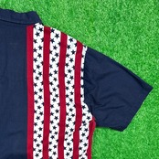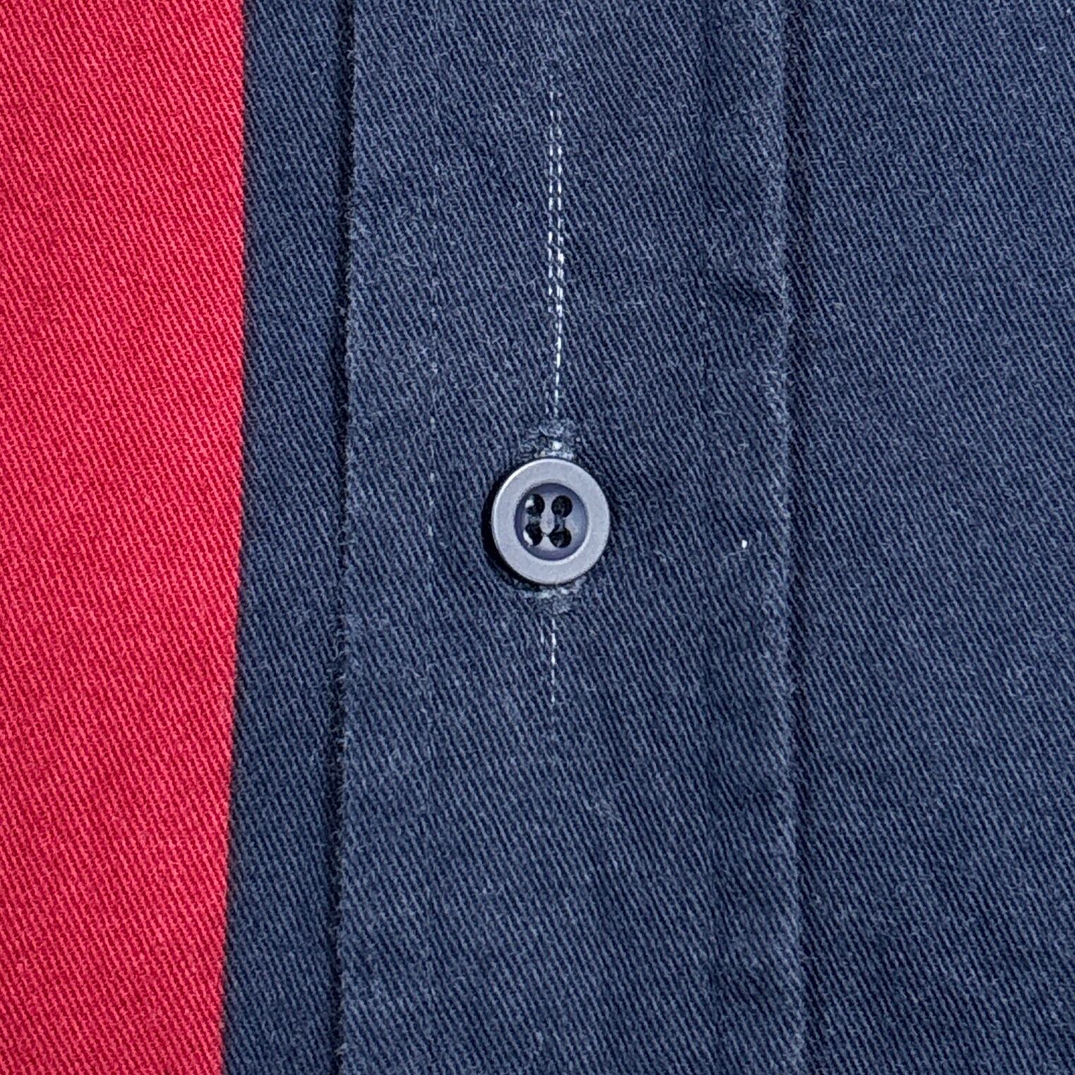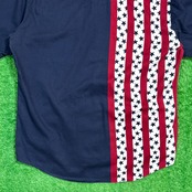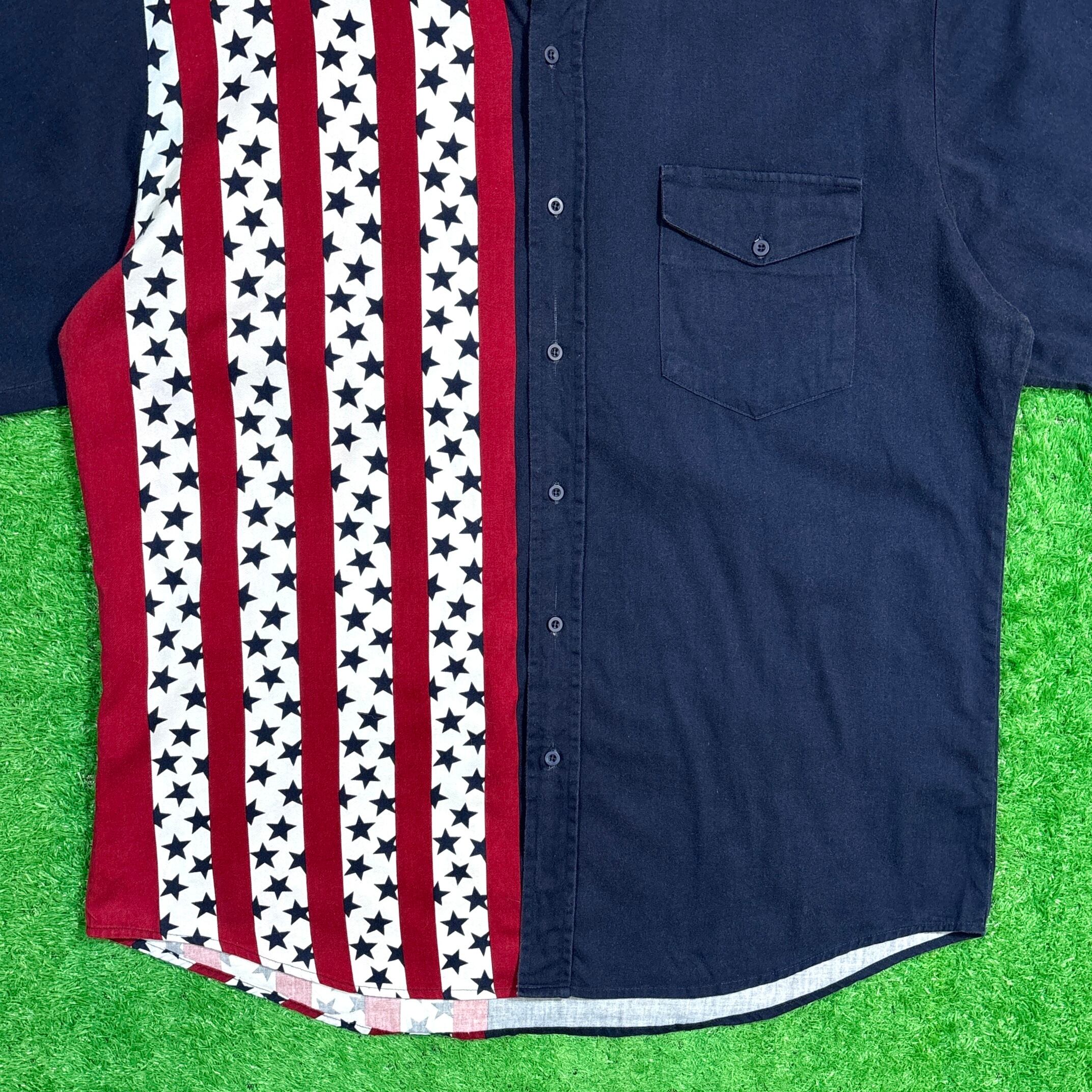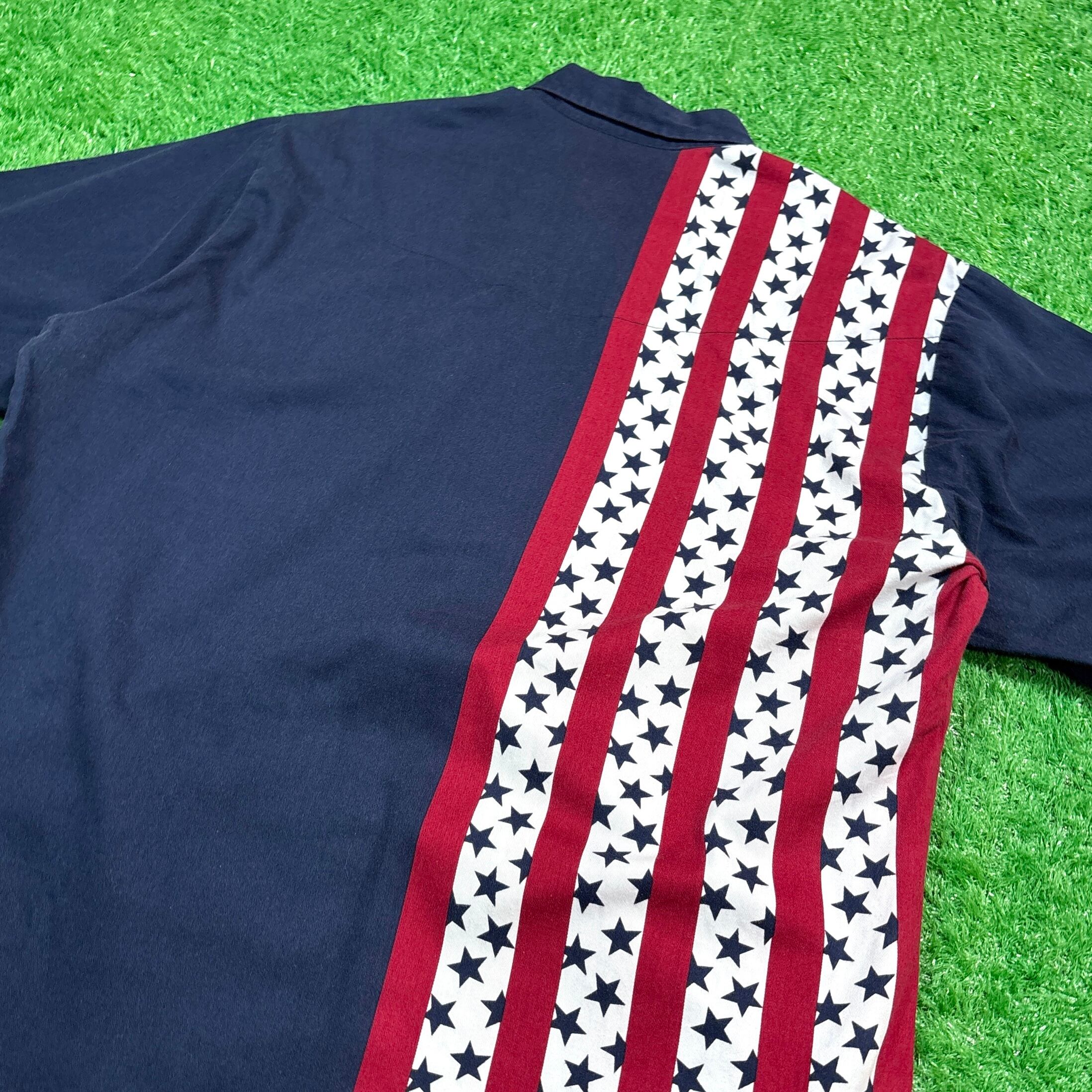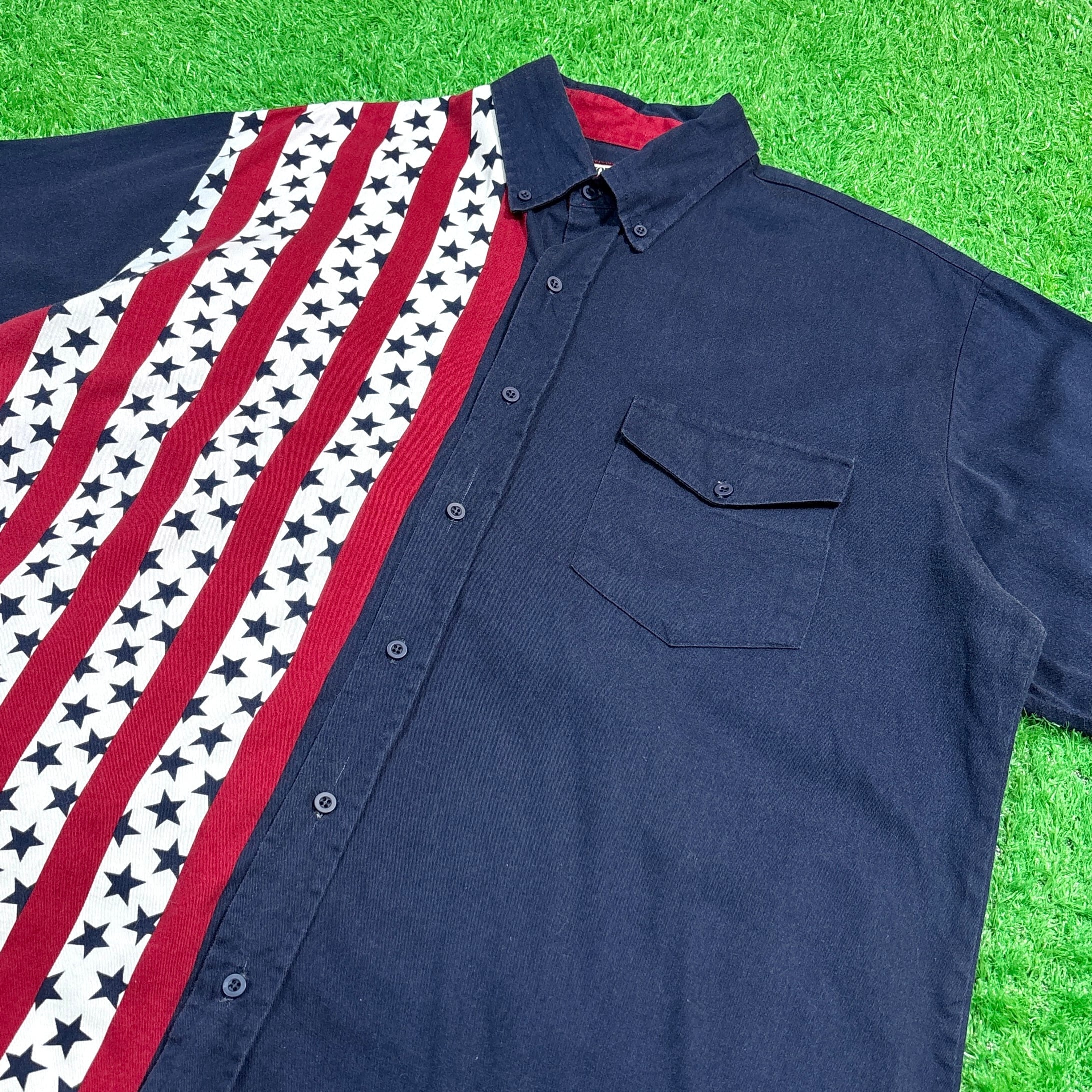 ネイビーベースのボディに、フロントとバックの片側には赤×白のストライプとスター柄の切り替えデザインが施され、アメリカンフラッグを彷彿とさせる大胆な配色が特徴。左胸にはポケット付き。ボタンダウン仕様でカジュアルながらも程よく上品な印象もある一枚です。