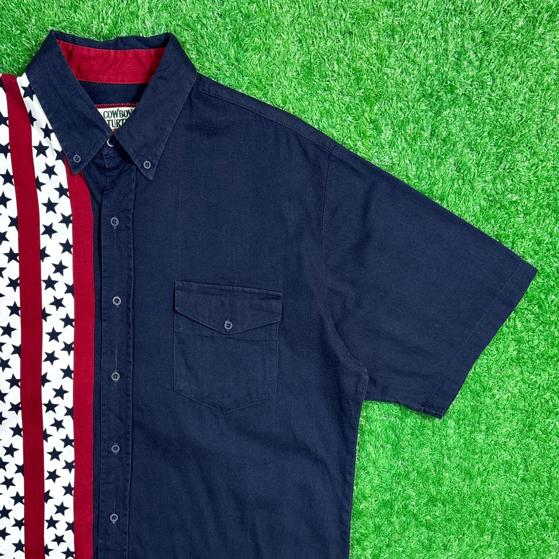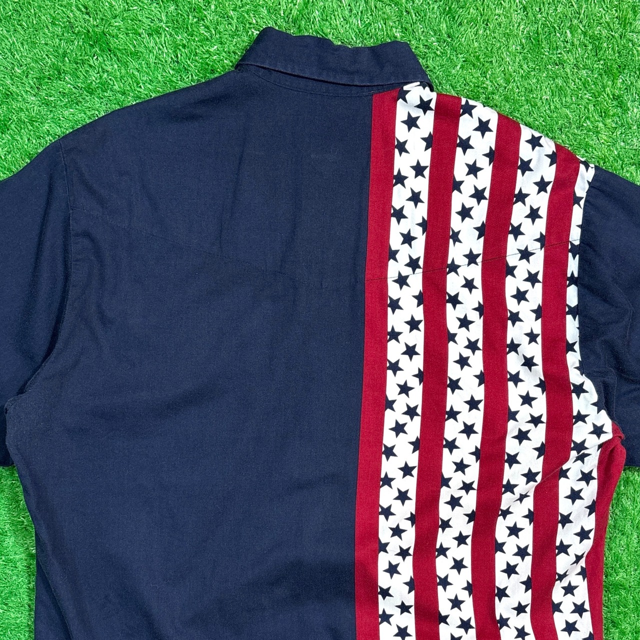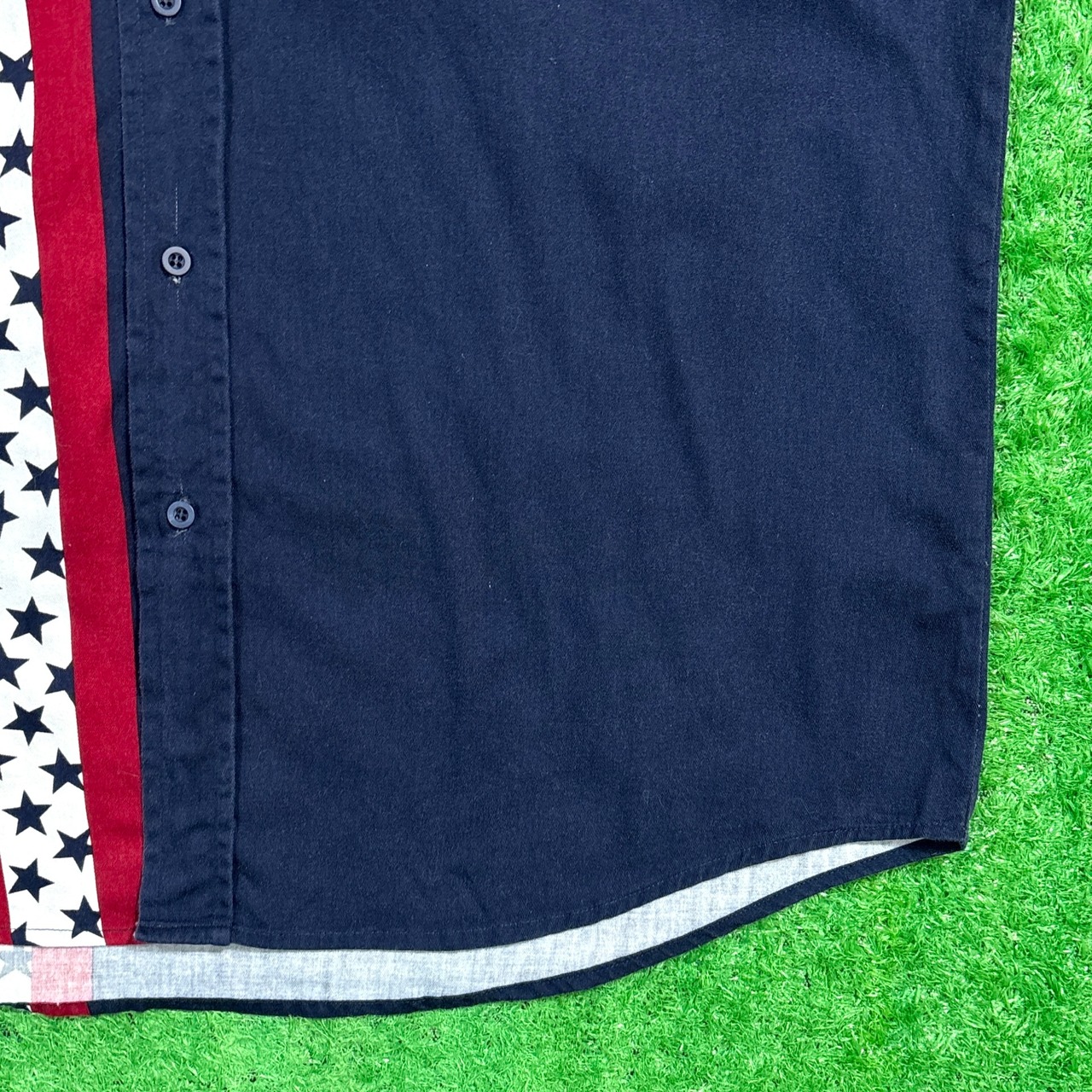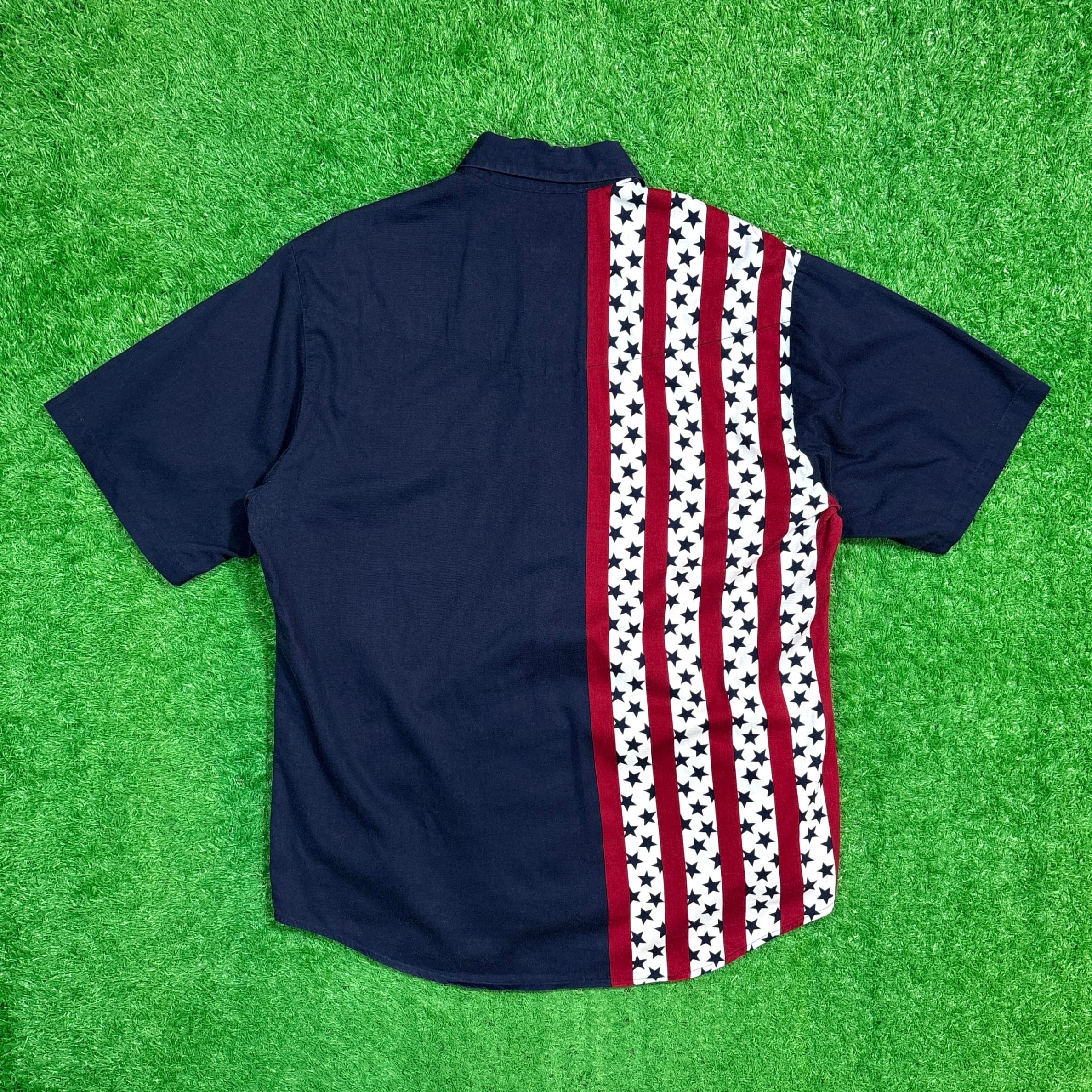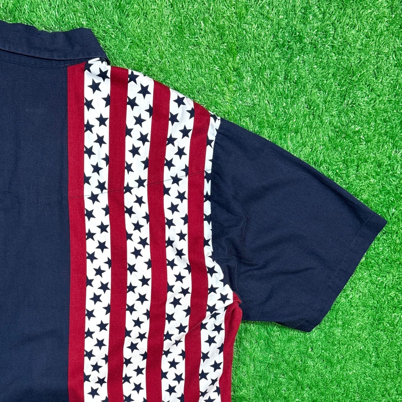 【Men's】 90s アメリカ デザイン ボタンダウン シャツ / 90年代 半袖 星条旗 アメリカンフラッグ 古着 ネイビー メンズ 夏 573