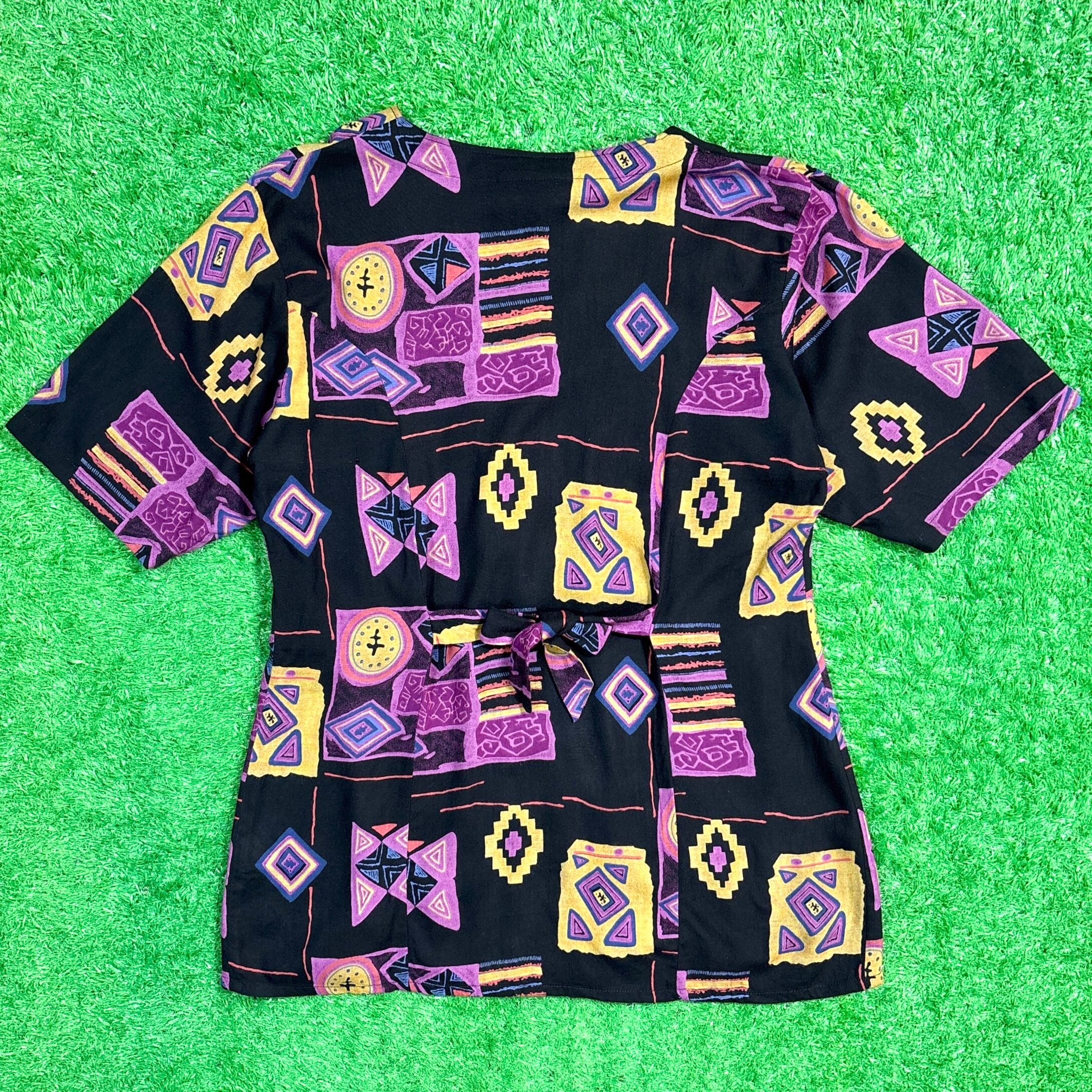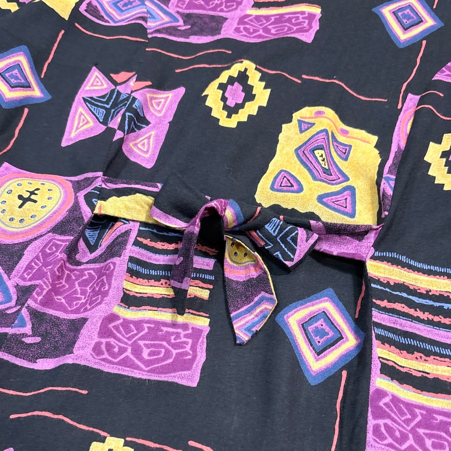 ブラックをベースに、パープル・イエロー・ピンクを組み合わせた幾何学的なネイティブパターンが全体にあしらわれたデザイン。程よく開いたネックラインとノーカラーが、夏らしく涼しげな印象を与えます。背面にはウエストリボンが付いており、シルエットの調整や後ろ姿のアクセントとして楽しめます。軽やかなレーヨン素材で肌触りも快適です。