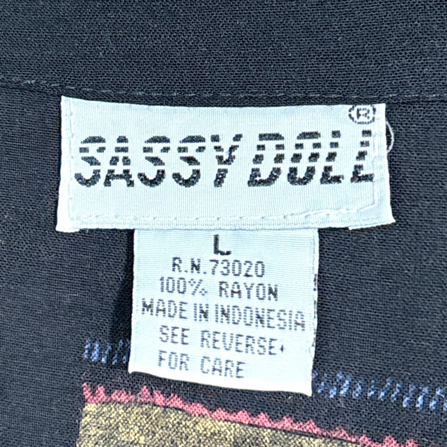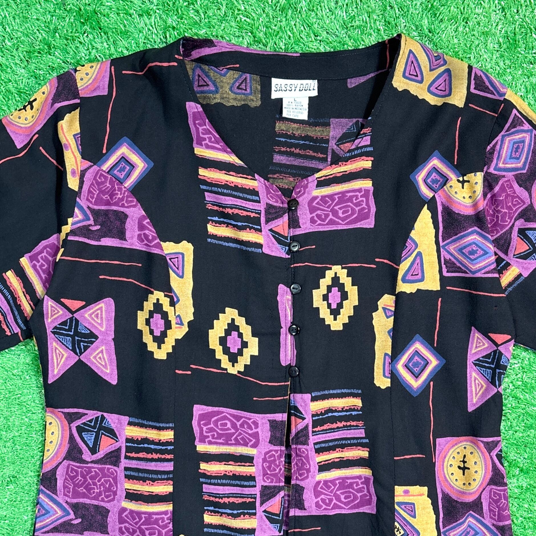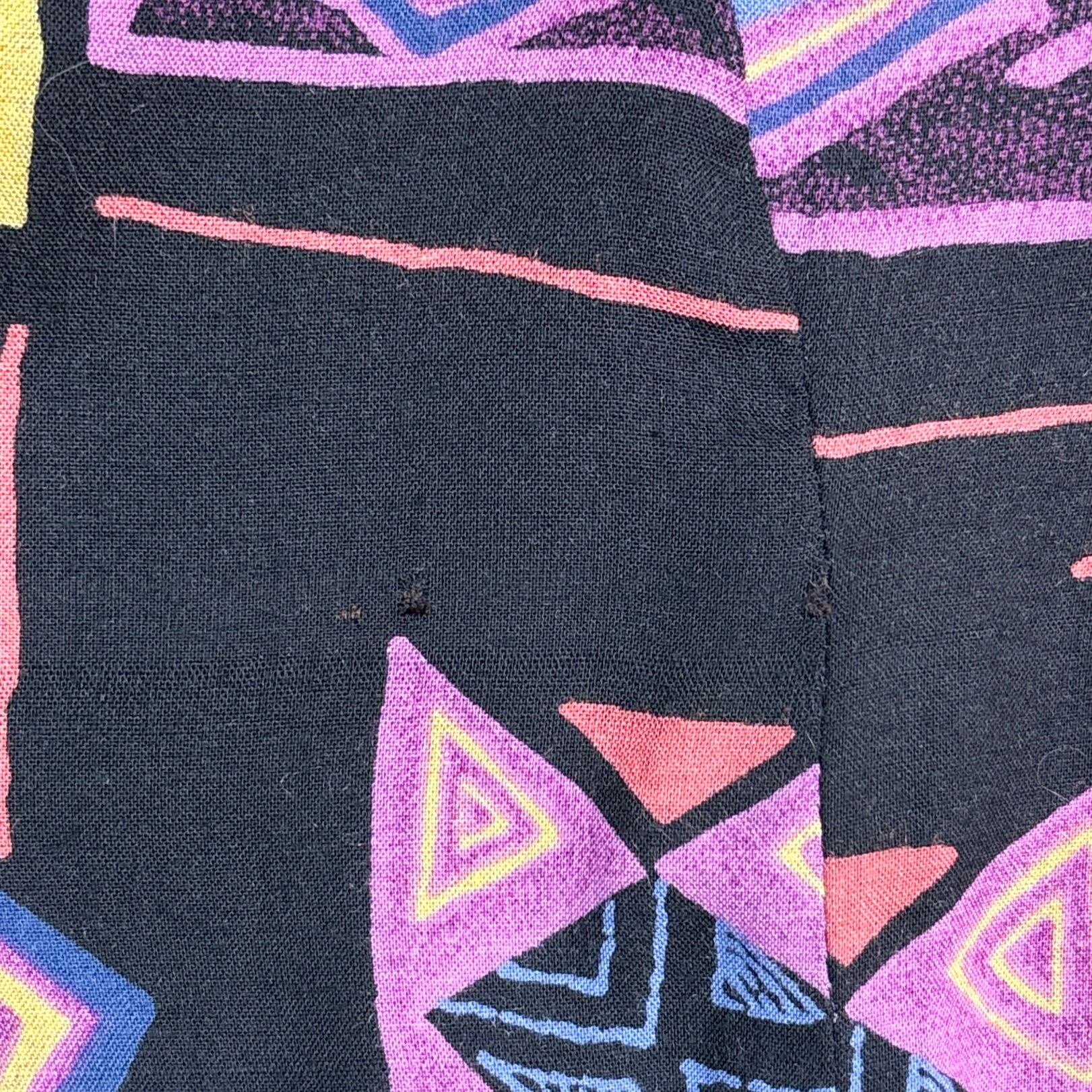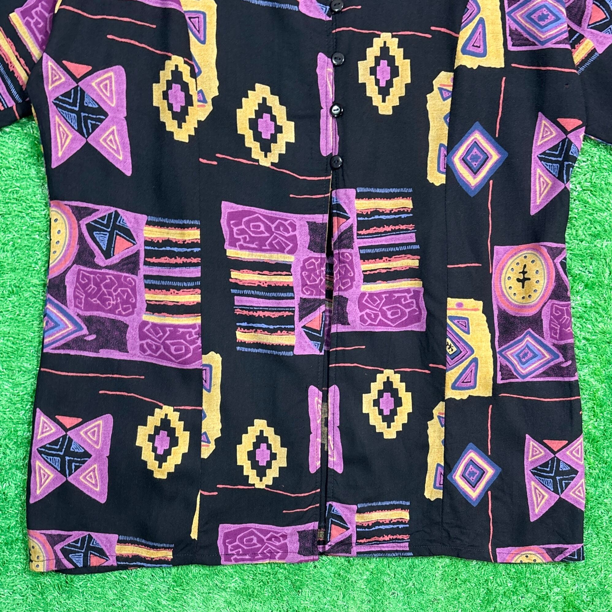 【Lady's】 90s ネイティブ柄 ノーカラー レーヨン シャツ / 90年代 古着 ネイティブ 黒 ブラック 夏 レディース 574