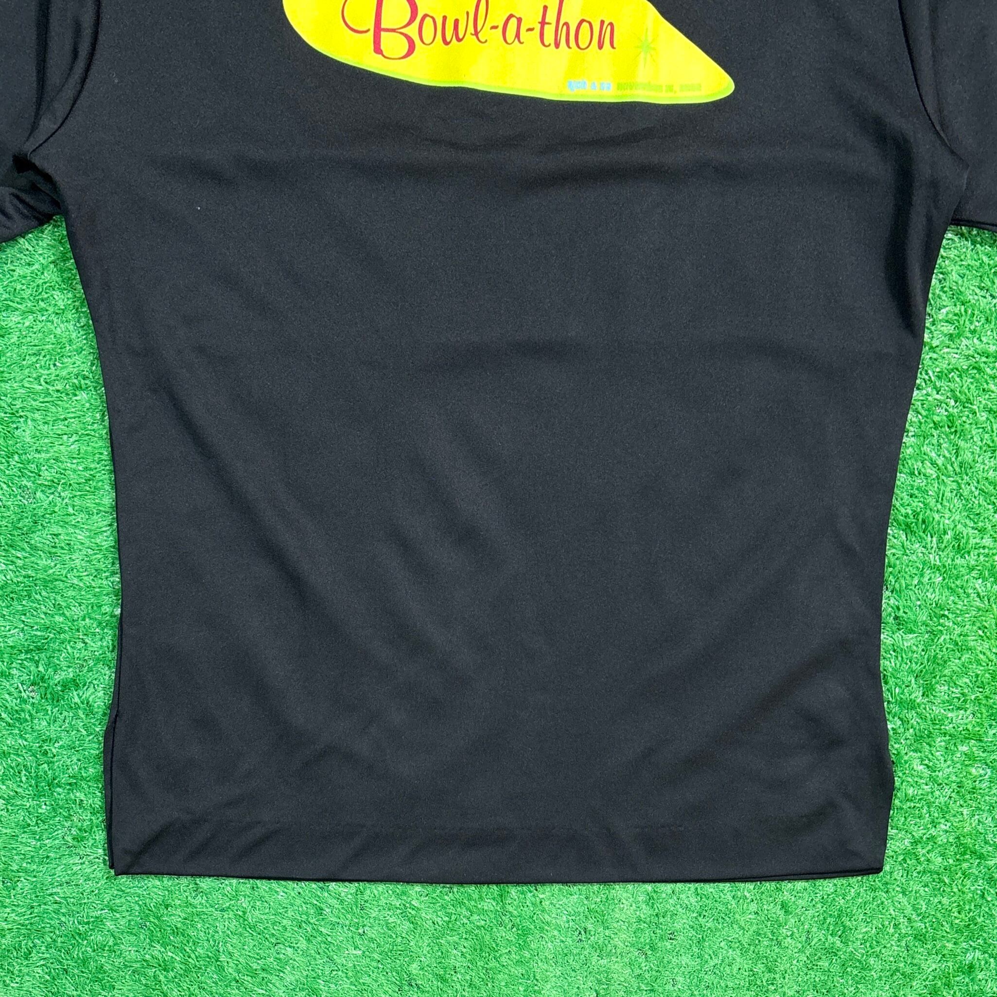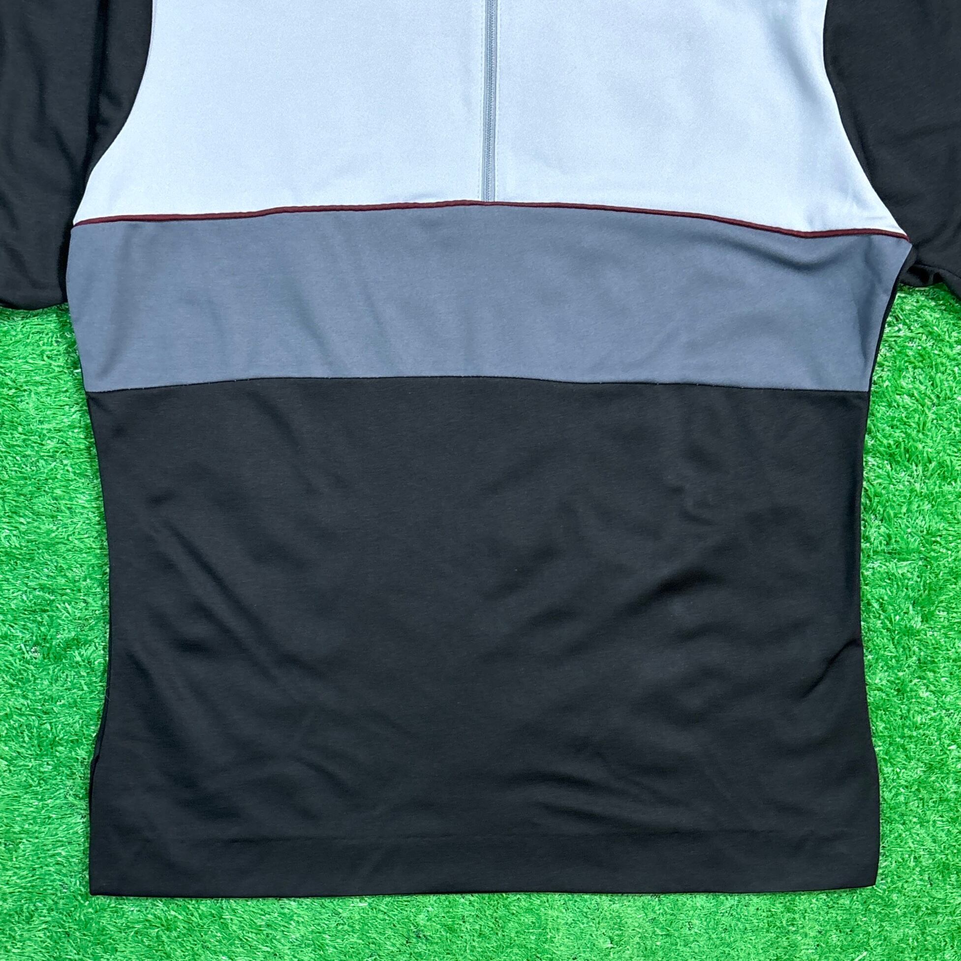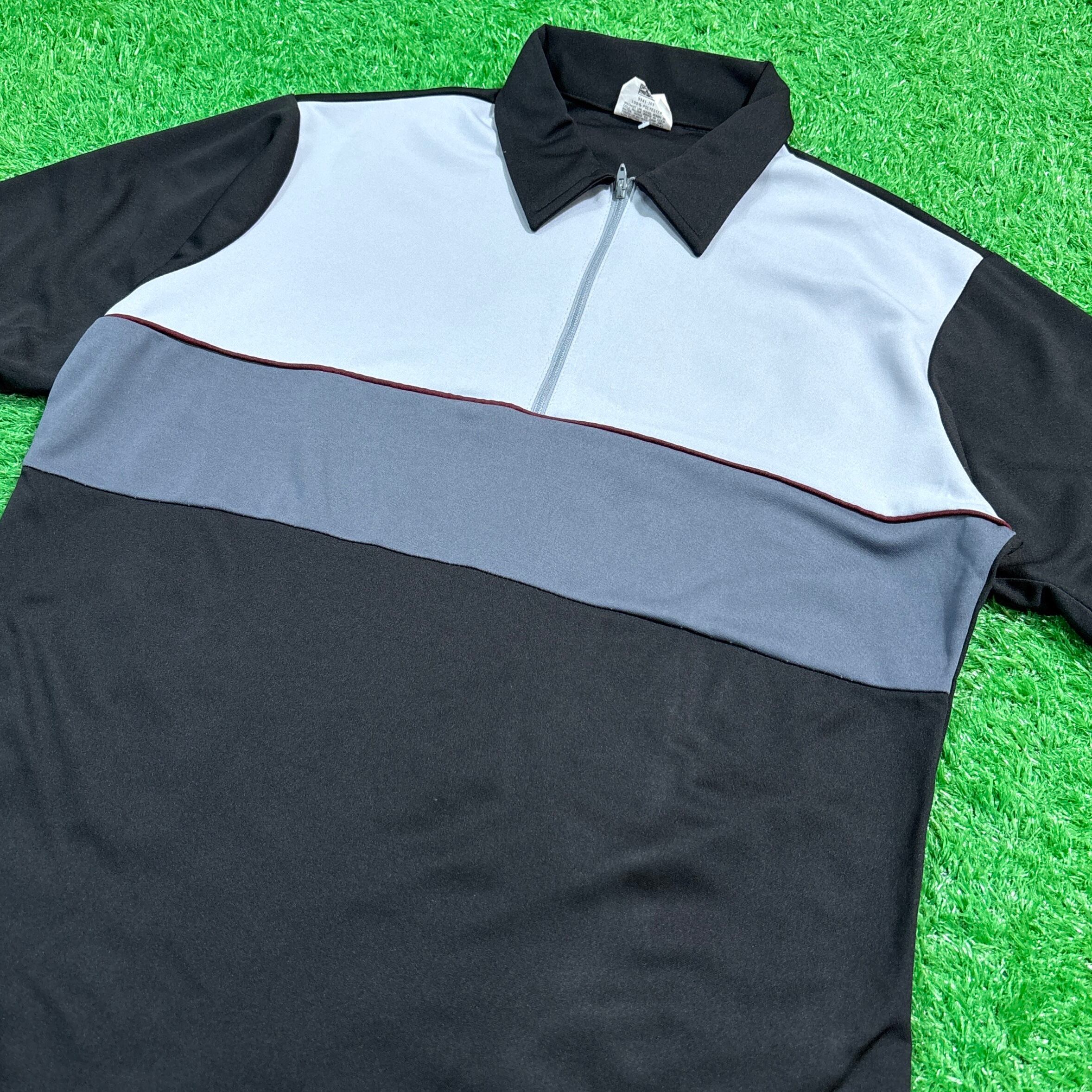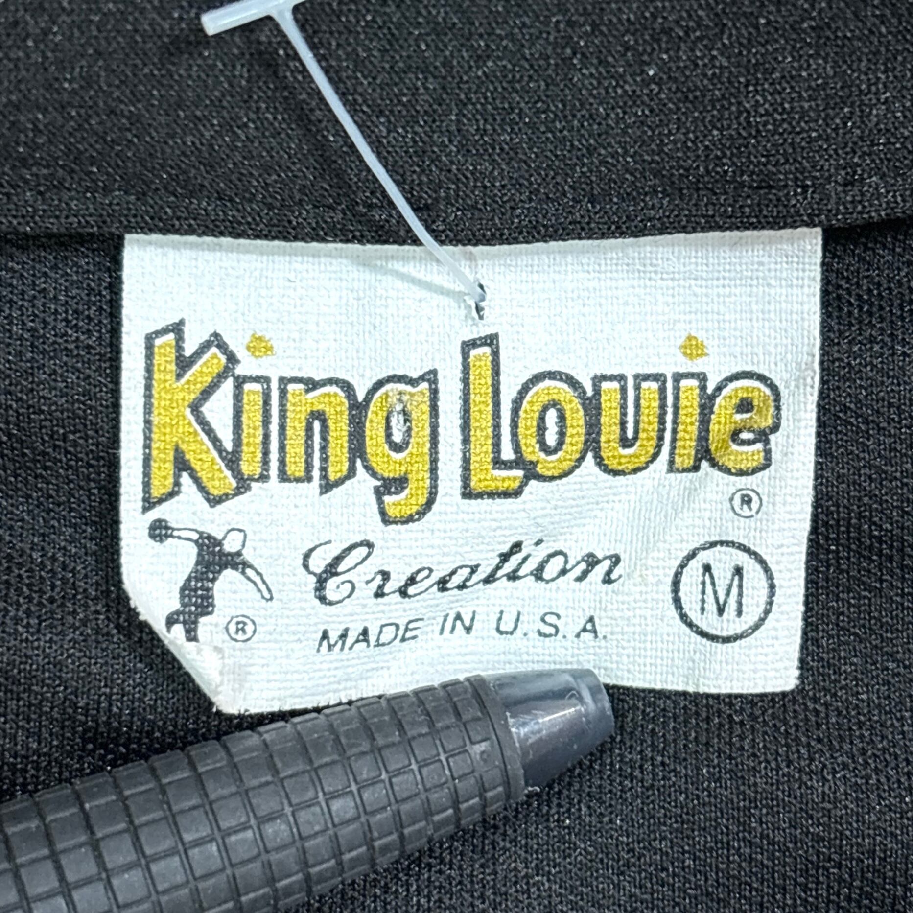 ハーフジップ仕様で、さらっとしたジャージのような素材感と程よい光沢のある黒ボディが特徴的。2002年に後加工でプリントが施されており、ヴィンテージボディと現代的プリントのミックス感がユニークな一枚です。King Louieらしいレトロな雰囲気と、プリントの個性が際立つアイテムです。