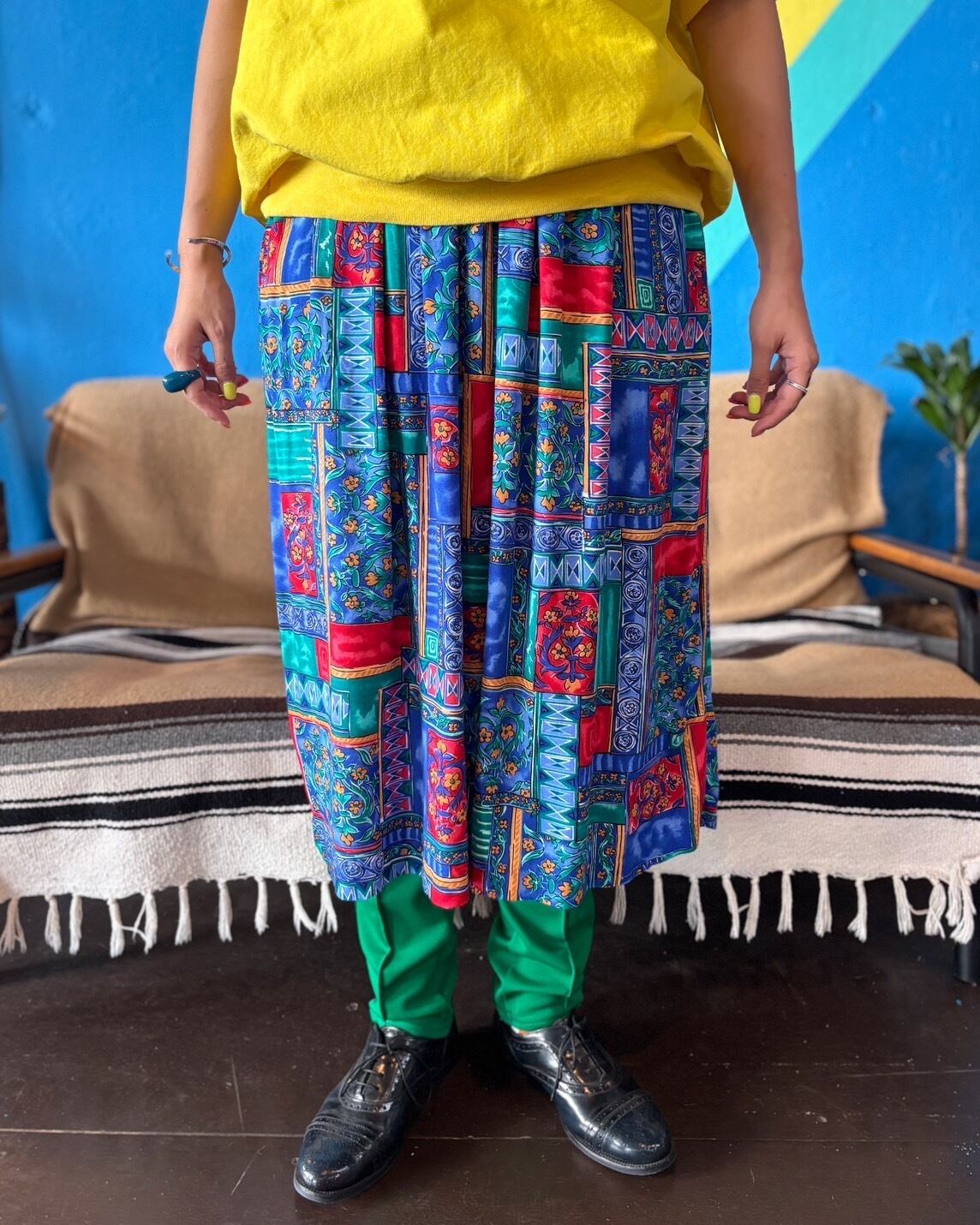 鮮やかなブルー・レッド・グリーンを基調に、幾何学模様や小花柄、スクロール模様を組み合わせたパッチワーク風のエスニックデザインが魅力。軽やかで落ち感のあるレーヨン素材を使用し、ウエストはゴム仕様で快適な着用感です。細かいプリーツが動きに合わせて揺れ、華やかさを引き立てます。丈感はスネくらいで、シーズンを問わず活躍する一本です。