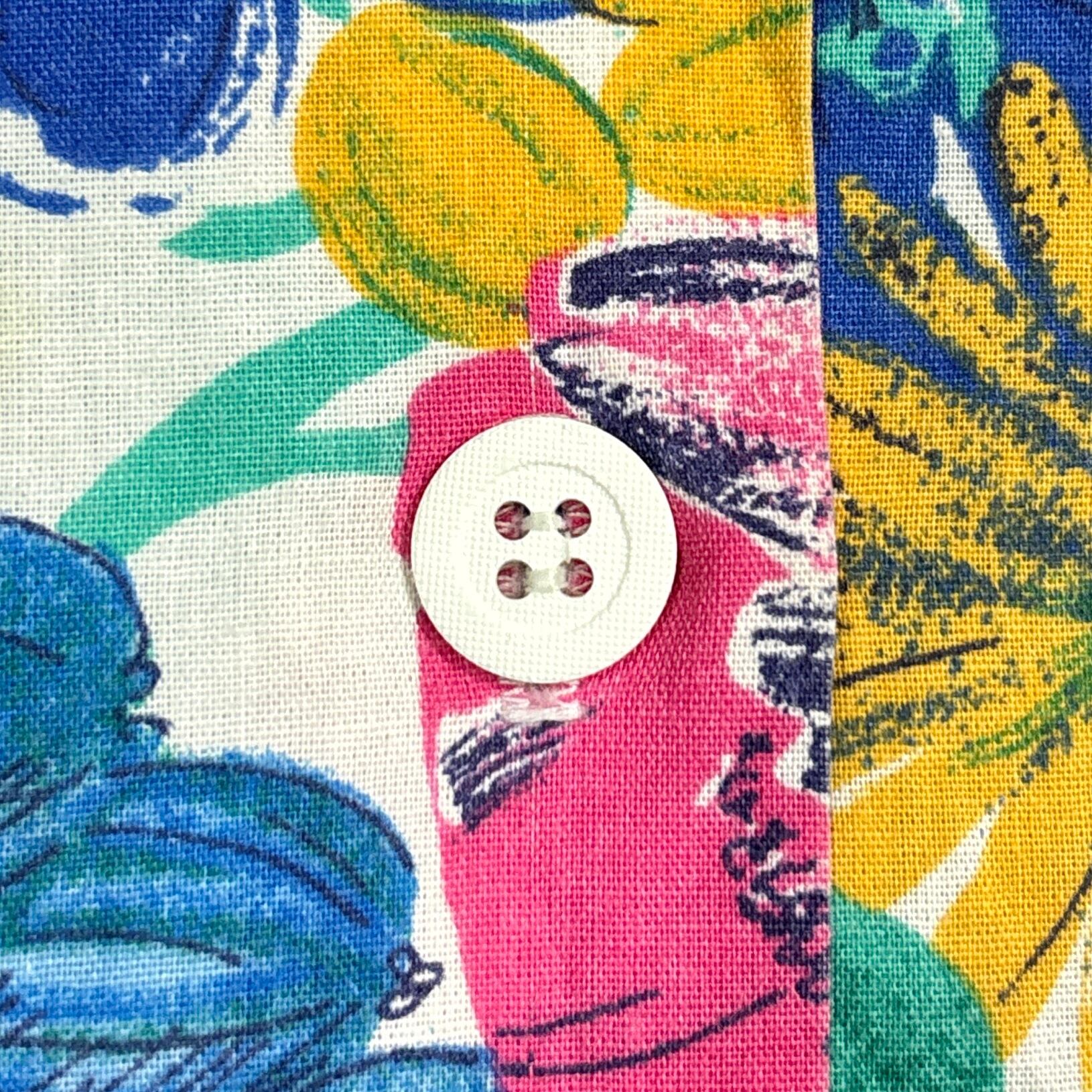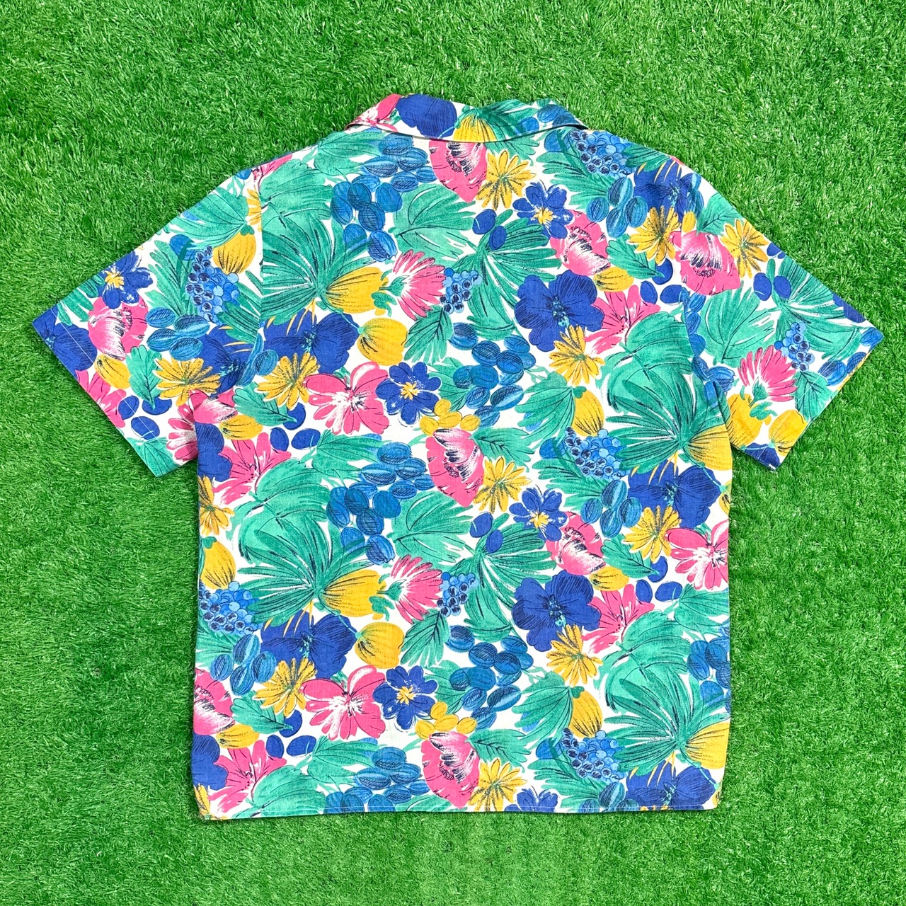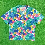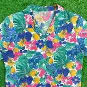 鮮やかなカラーリングで、大きなリーフや花々が全面に描かれたデザインが特徴的。開襟仕様で首元がすっきりと見え、涼しげな雰囲気を演出します。軽やかな生地感で、夏のコーディネートにぴったりな一枚です。