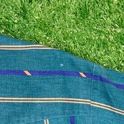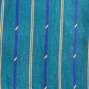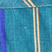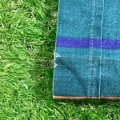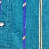 鮮やかなターコイズブルーをベースに、細かなストライプと小さな斜めラインが連なる個性的な柄が印象的なデザイン。胸元の切り替えしデザインやスナップボタンが90sらしい雰囲気を引き立てます。