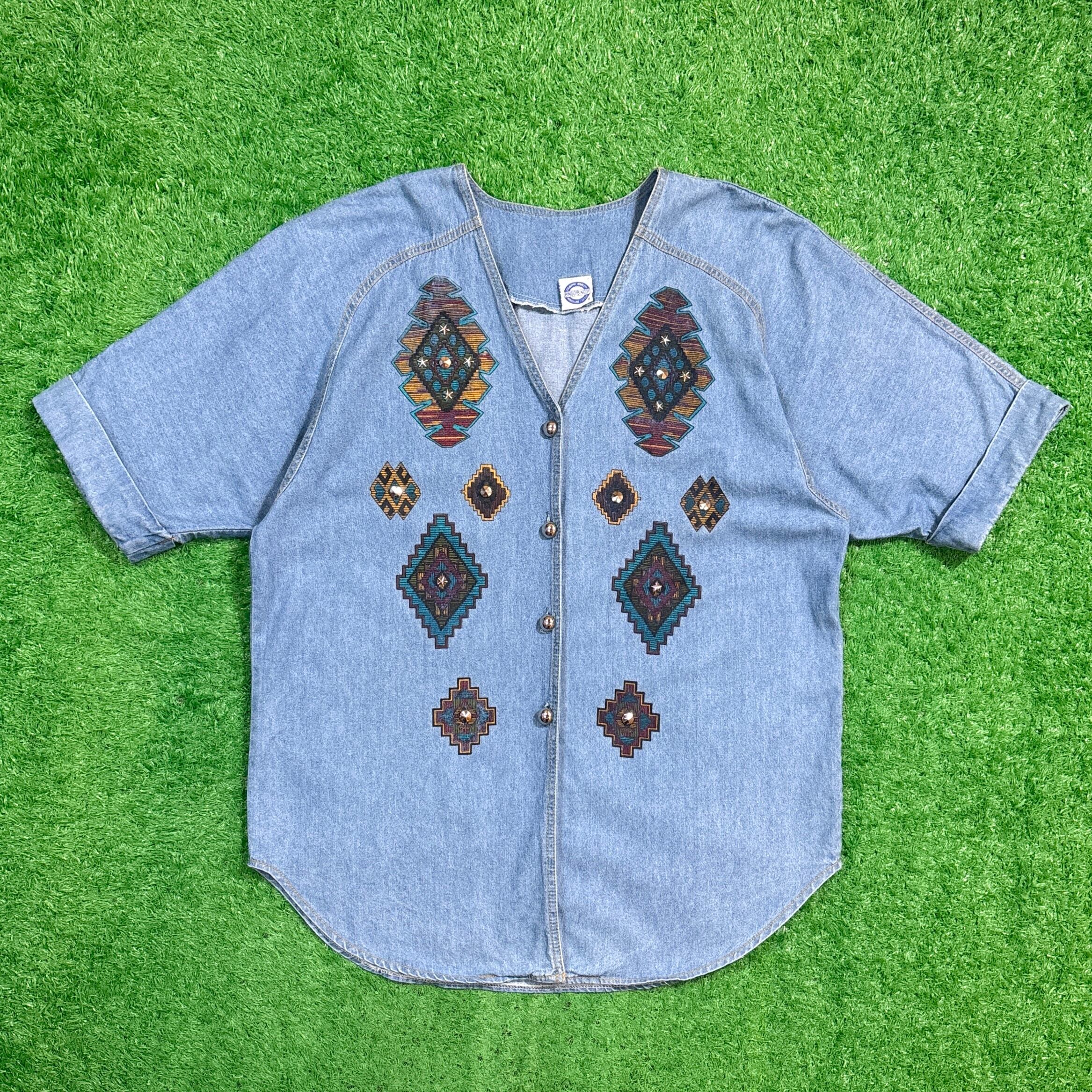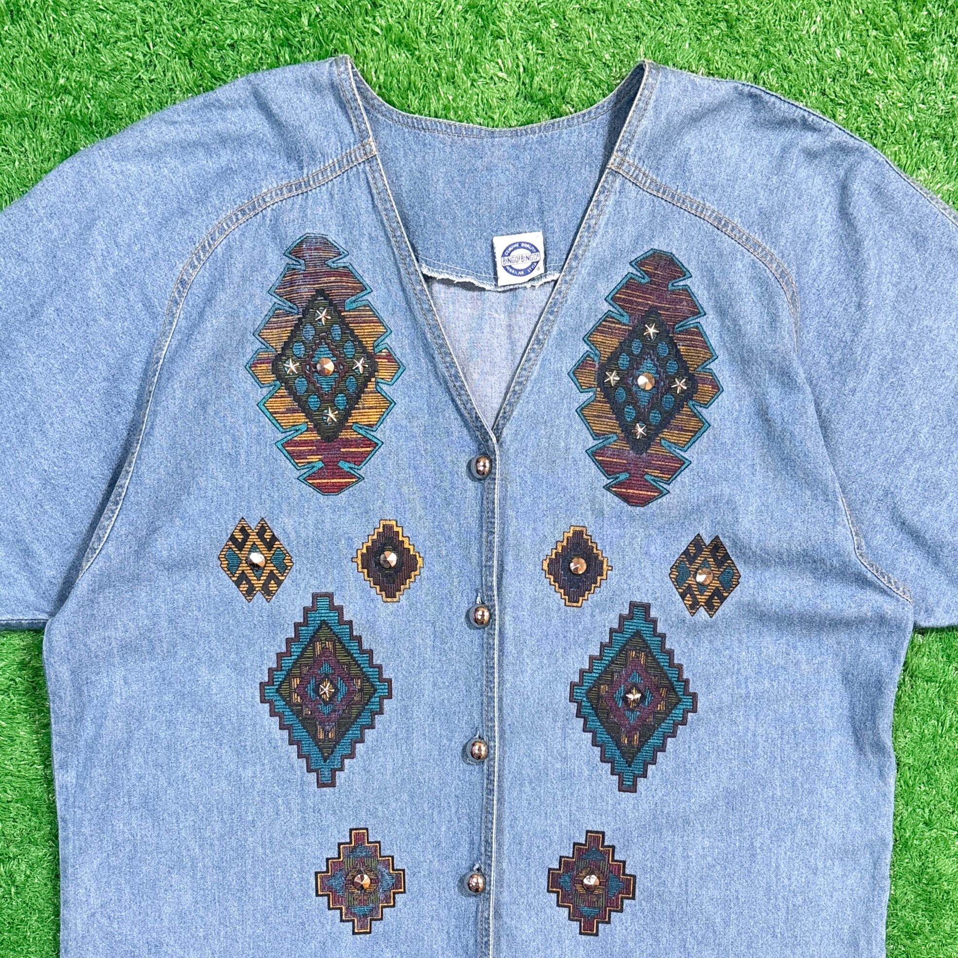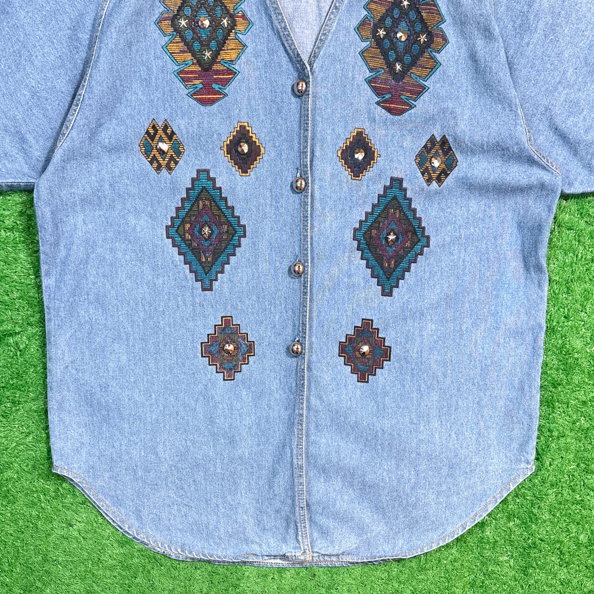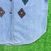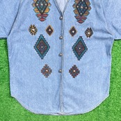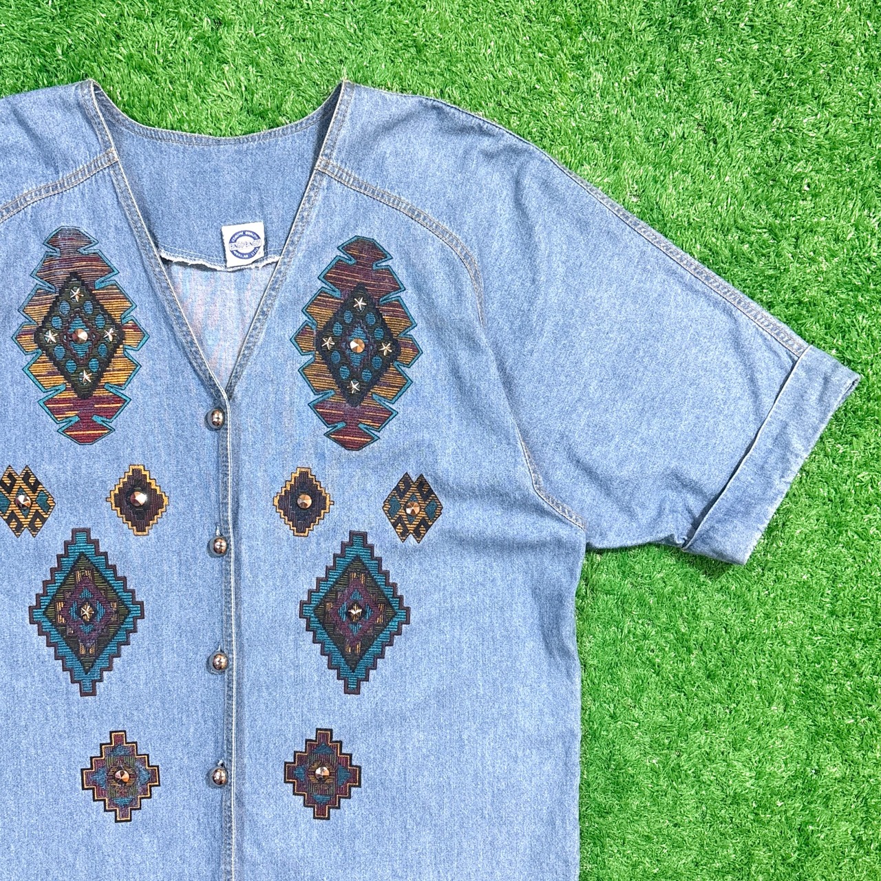 【Unisex】 90s ネイティブ柄 スタッズ付き ノーカラー シャツ / アメリカ製 USA製 90年代 古着 デニムシャツ デニム 半袖 夏 592