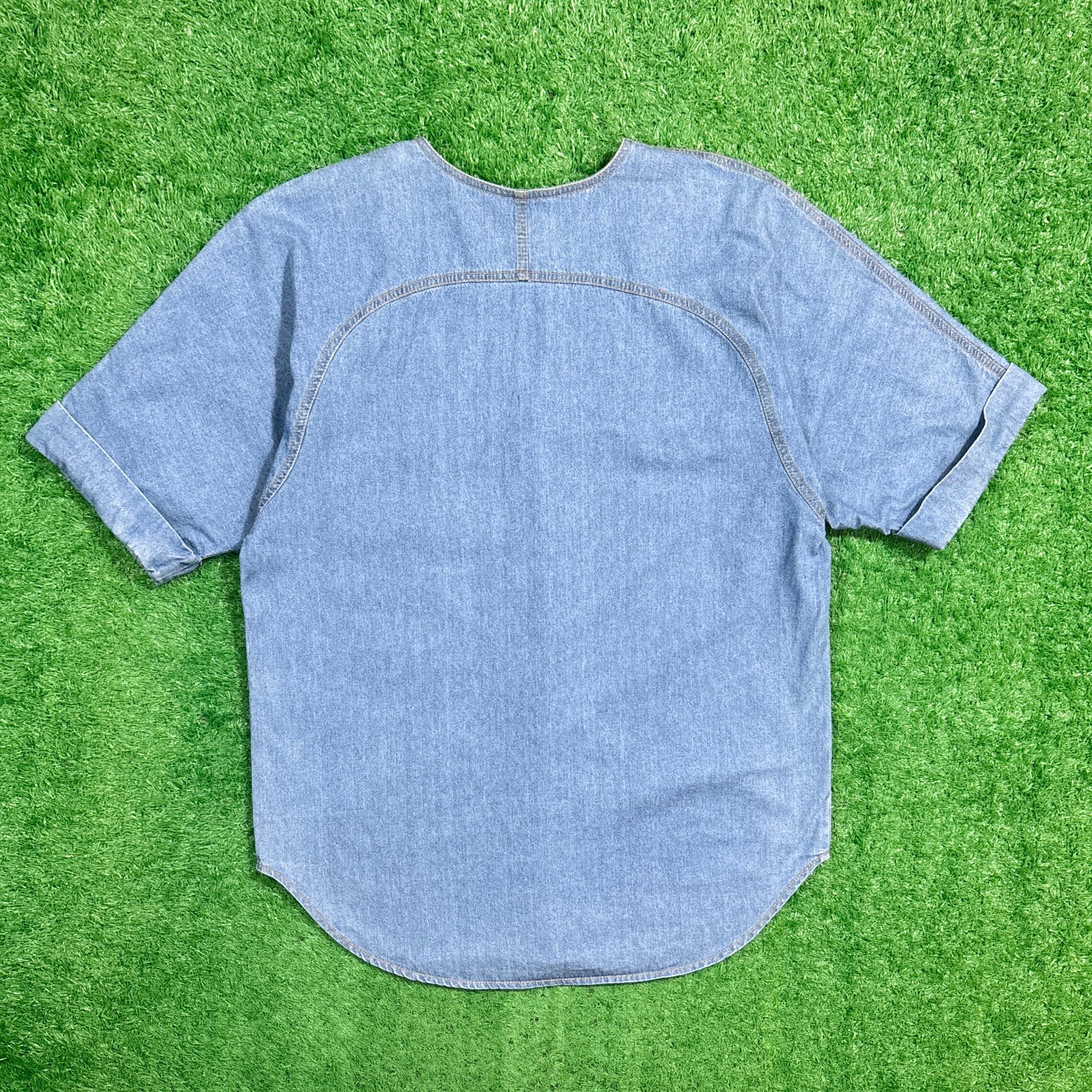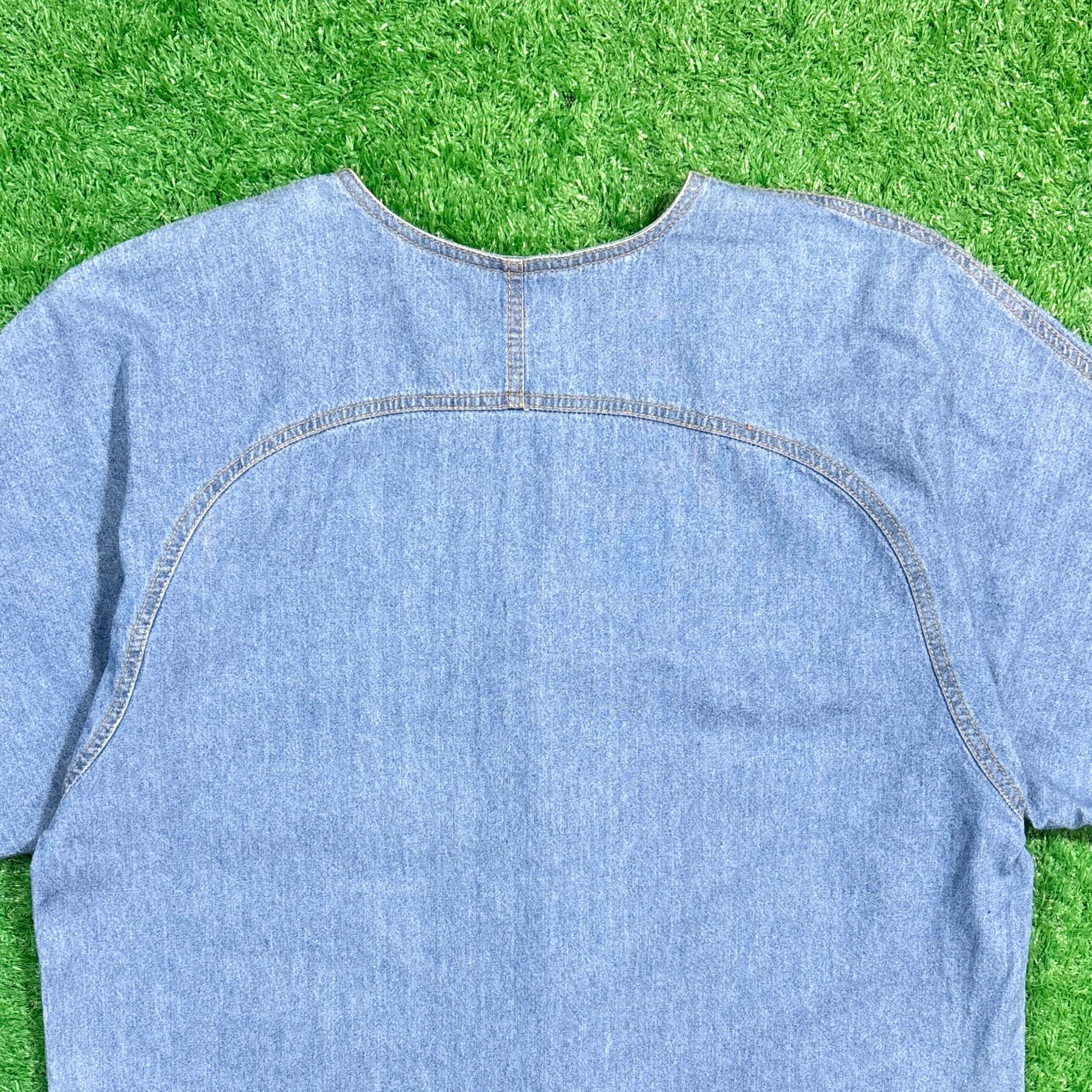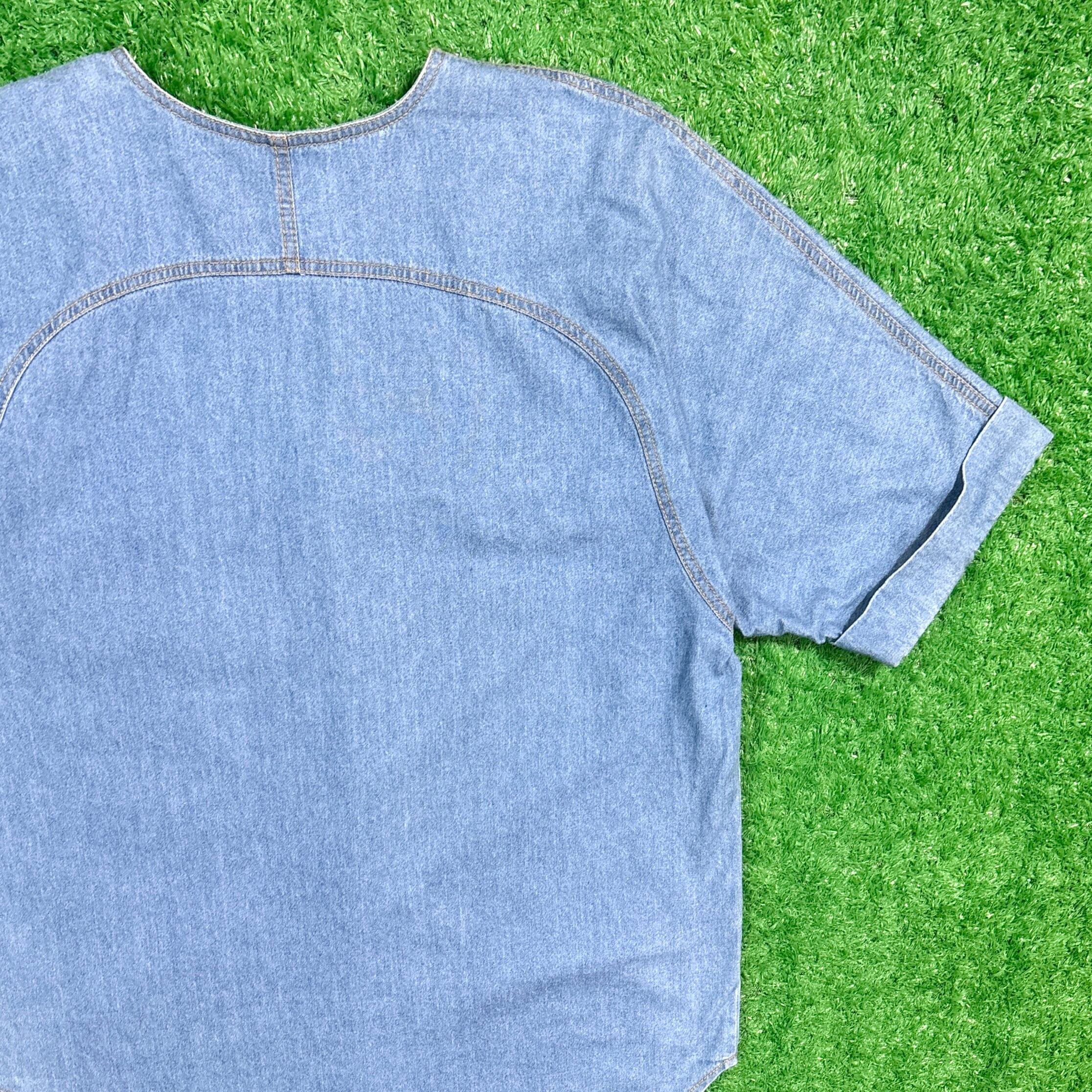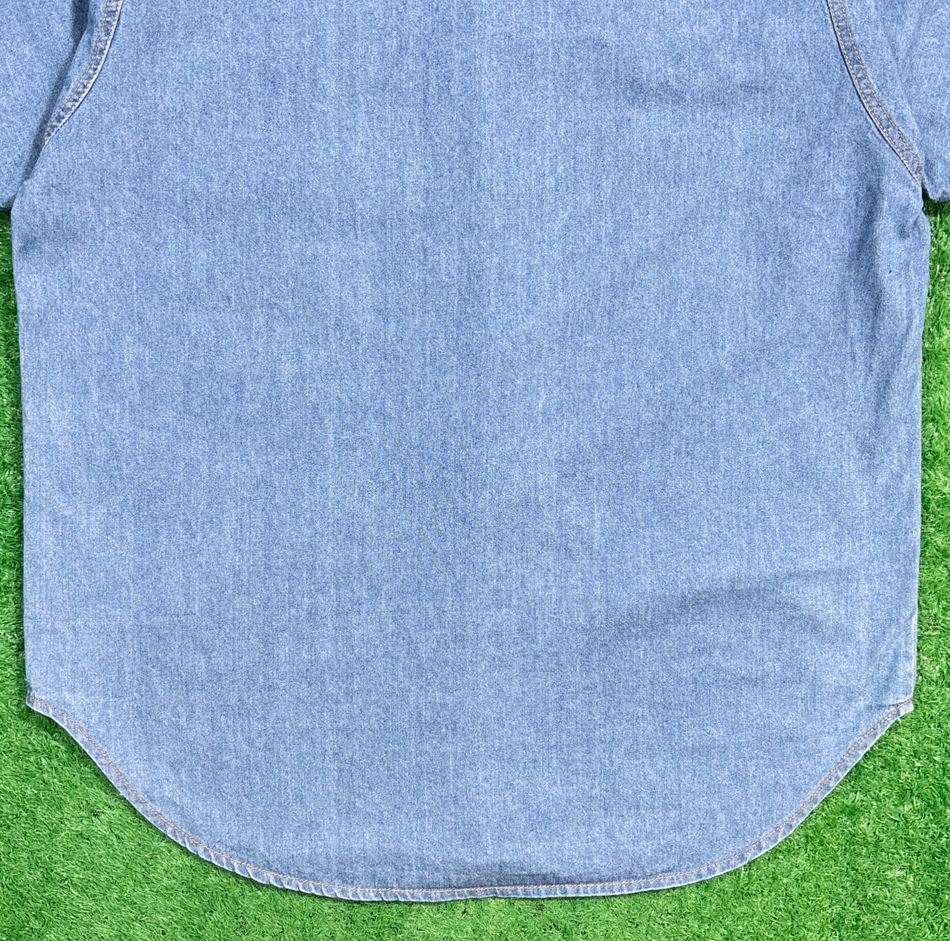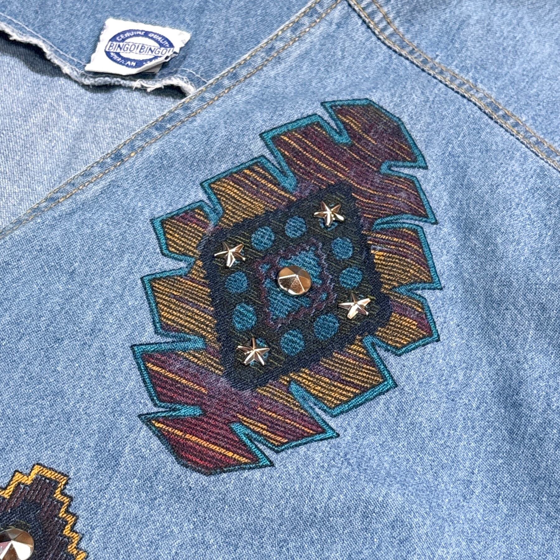【Unisex】 90s ネイティブ柄 スタッズ付き ノーカラー シャツ / アメリカ製 USA製 90年代 古着 デニムシャツ デニム 半袖 夏 592