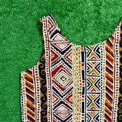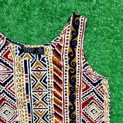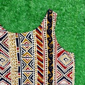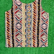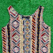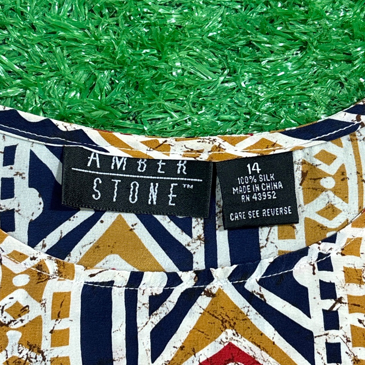 ベージュベースにレッド・イエロー・ネイビーなどを使ったネイティブ調の幾何学模様が印象的な一枚。肌あたりの良いシルク素材で、光沢感を抑えたナチュラルな質感が特徴です。インナー使いやレイヤードにもぴったり。夏のコーディネートにアクセントを加えるアイテムとしておすすめです。
