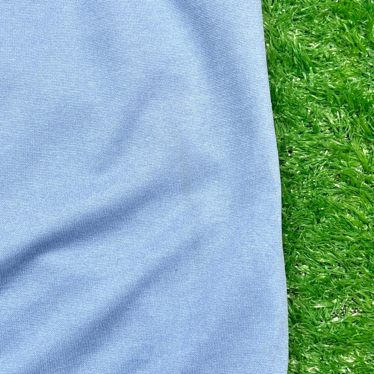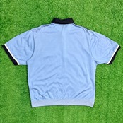ライトブルーを基調に、ブラックの切り替えと白のラインがアクセントになったレトロスポーティなデザイン。ハーフボタン仕様で、襟付き・袖と裾にはリブもあり、全体に程よく引き締まった印象に。ジャージのような伸縮性のあるポリエステル素材で、軽くて着心地も◎。