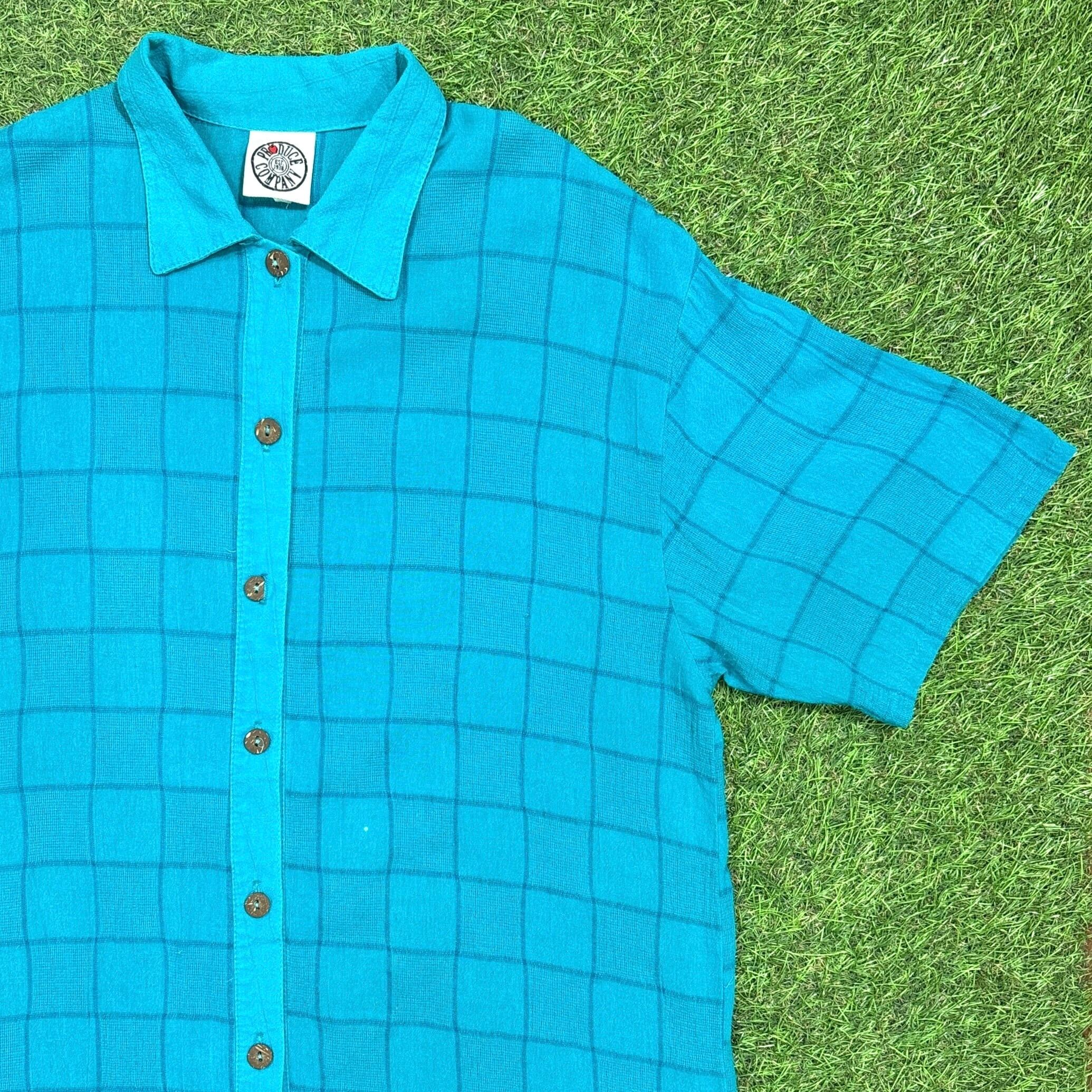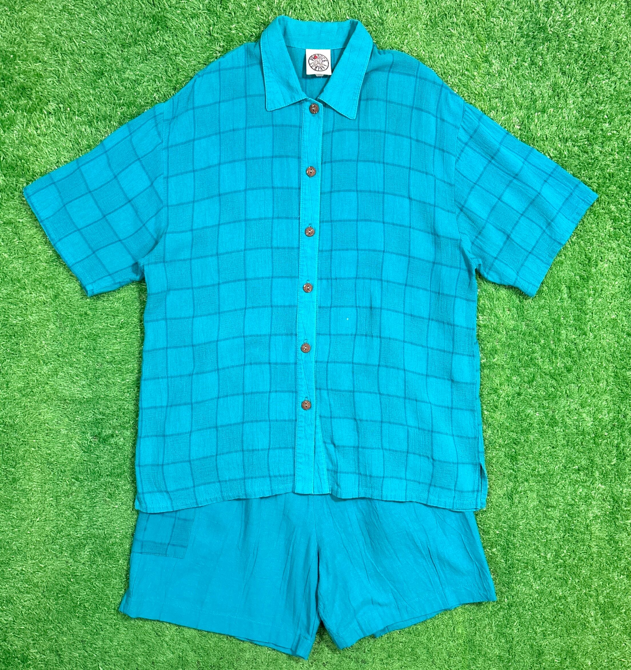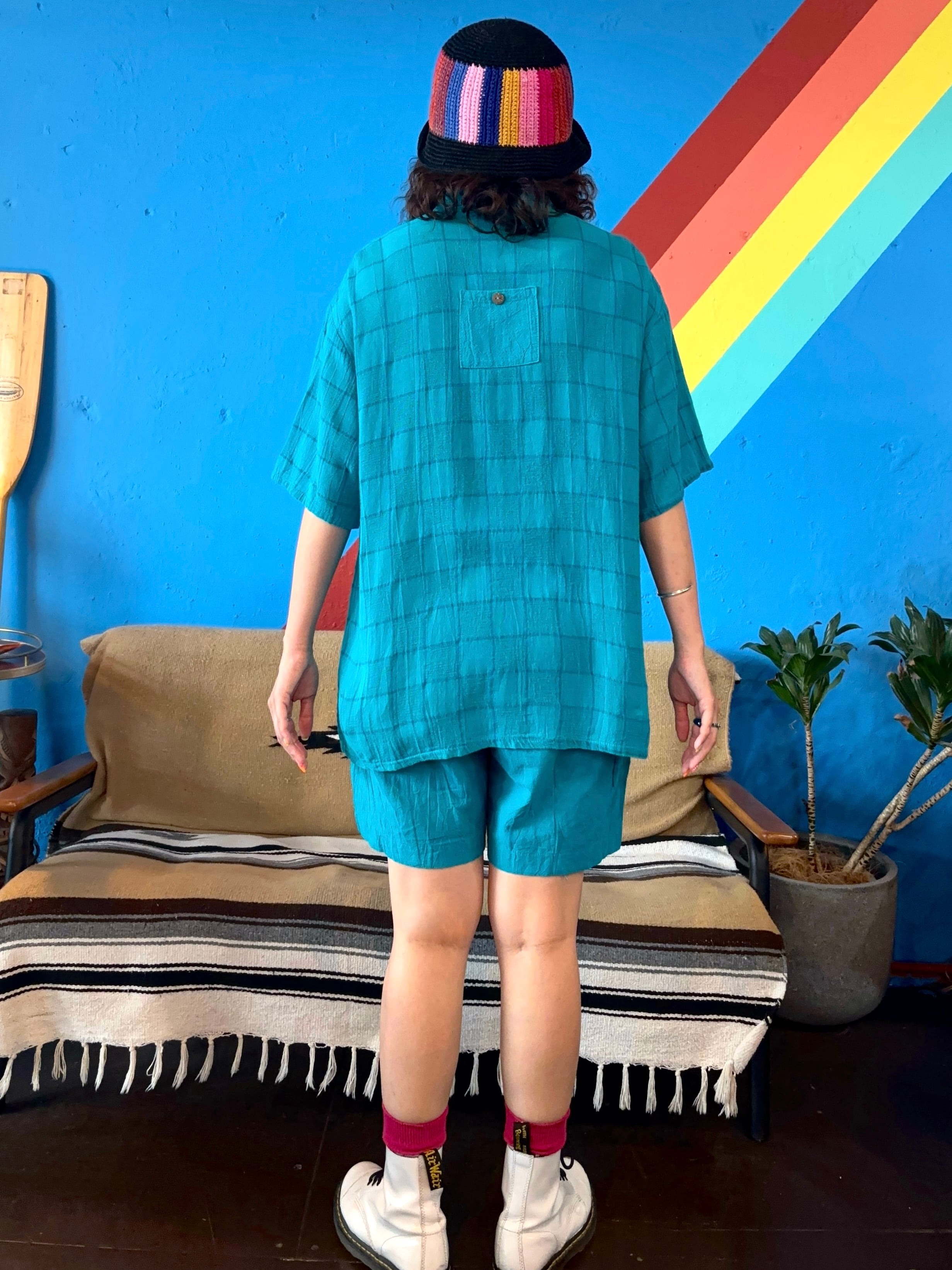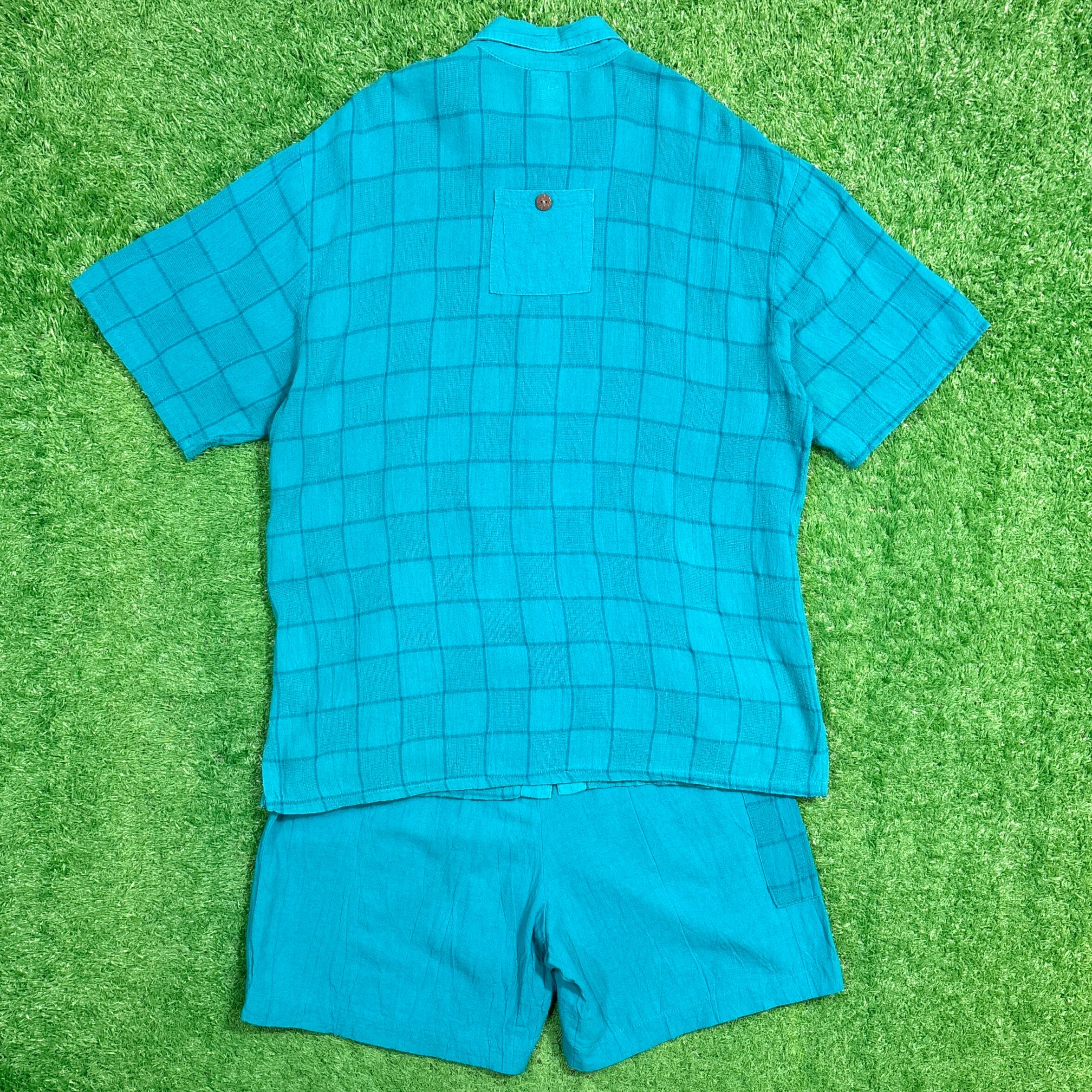 1990年代製のコットンニット素材を使用した格子柄セットアップです。爽やかなターコイズグリーンを基調に、軽やかで涼しげな印象を演出。トップスは半袖の前開きシャツタイプ、ボトムスはウエストゴム仕様のハーフパンツで、ゆったりとしたリラックス感のある着心地が魅力です。コットンニットならではの柔らかさと通気性の良さで、春夏のカジュアルコーデにぴったり。セットでも単品でも活躍できる汎用性の高いアイテムです。