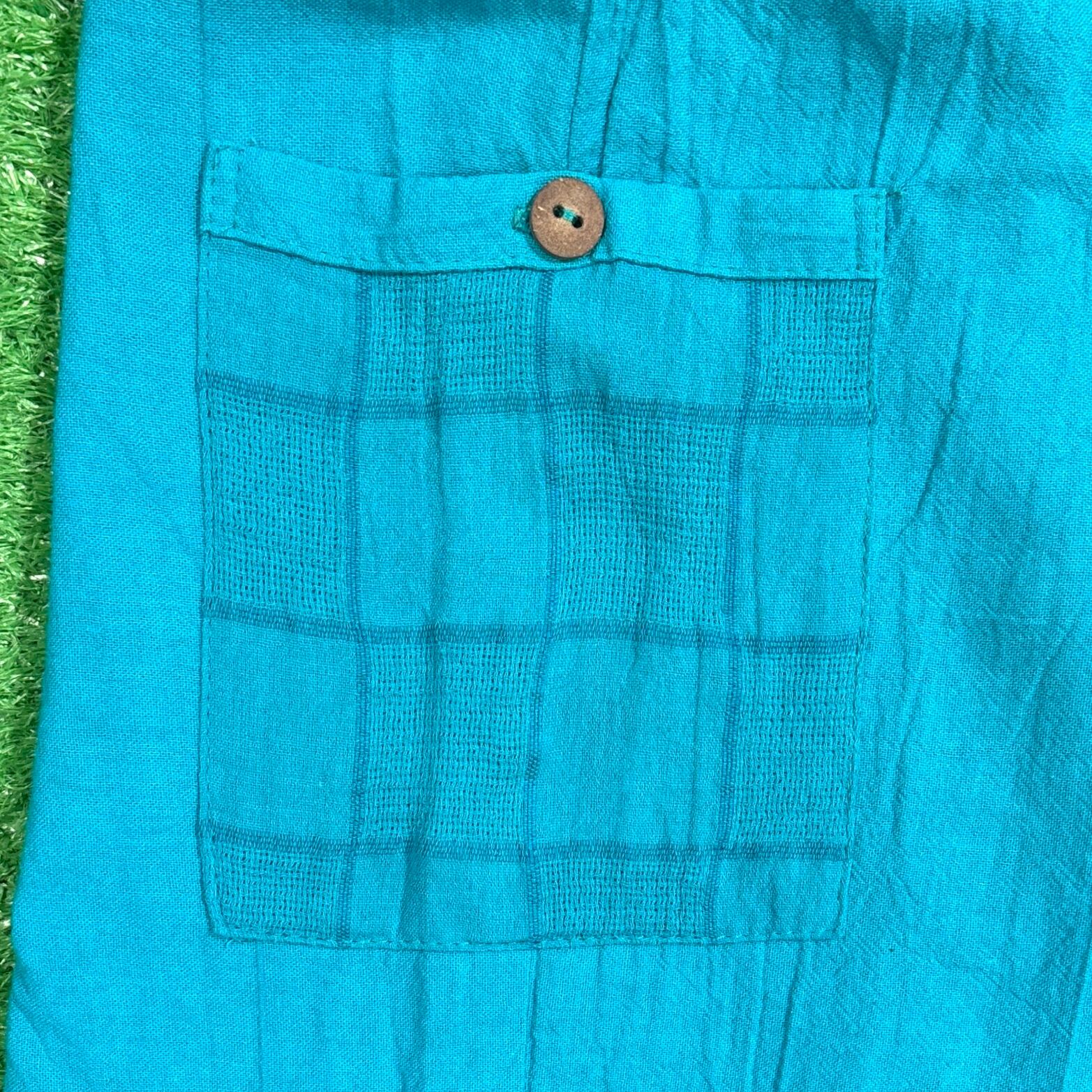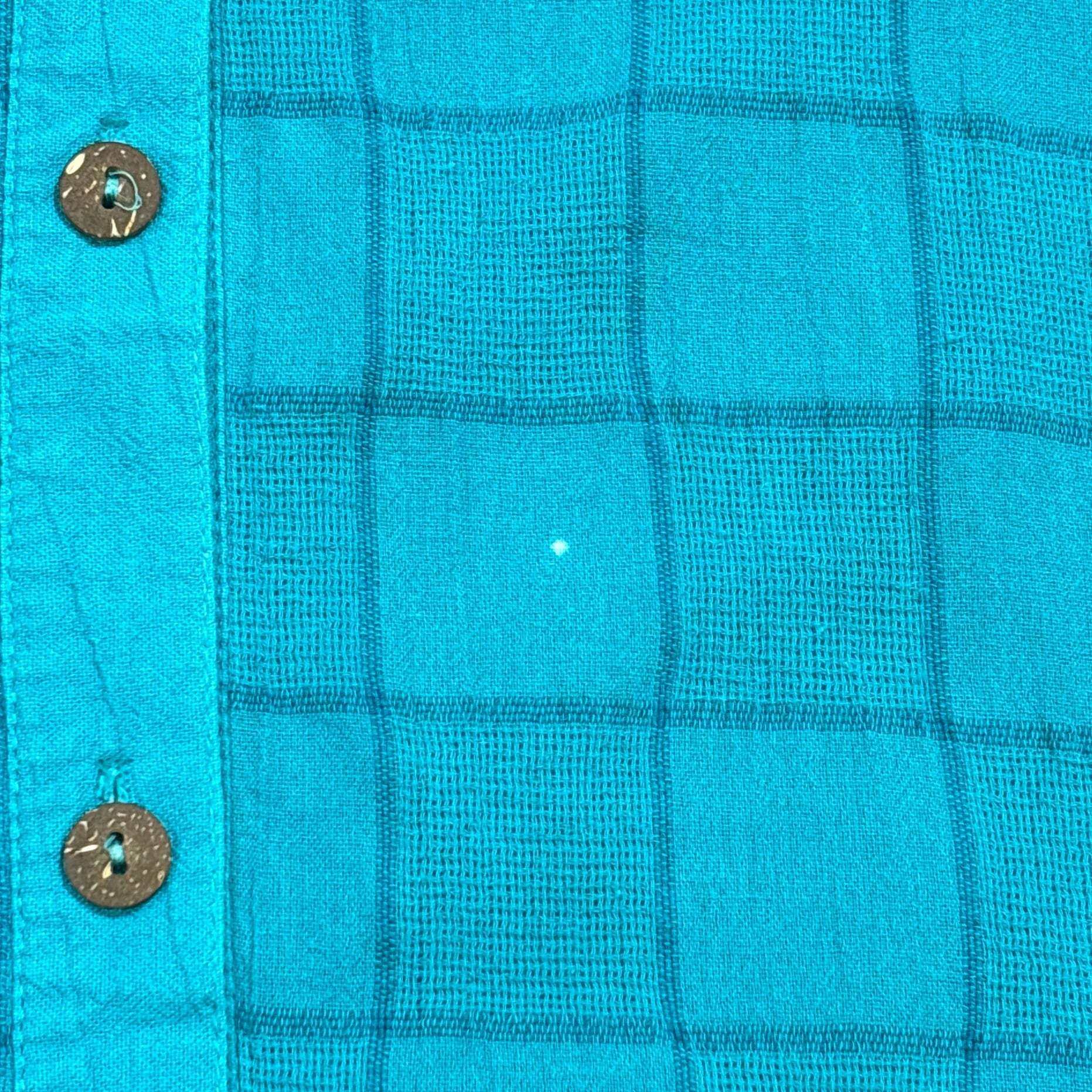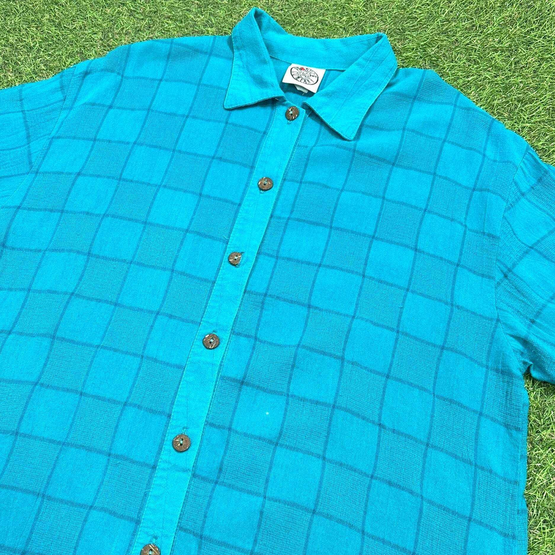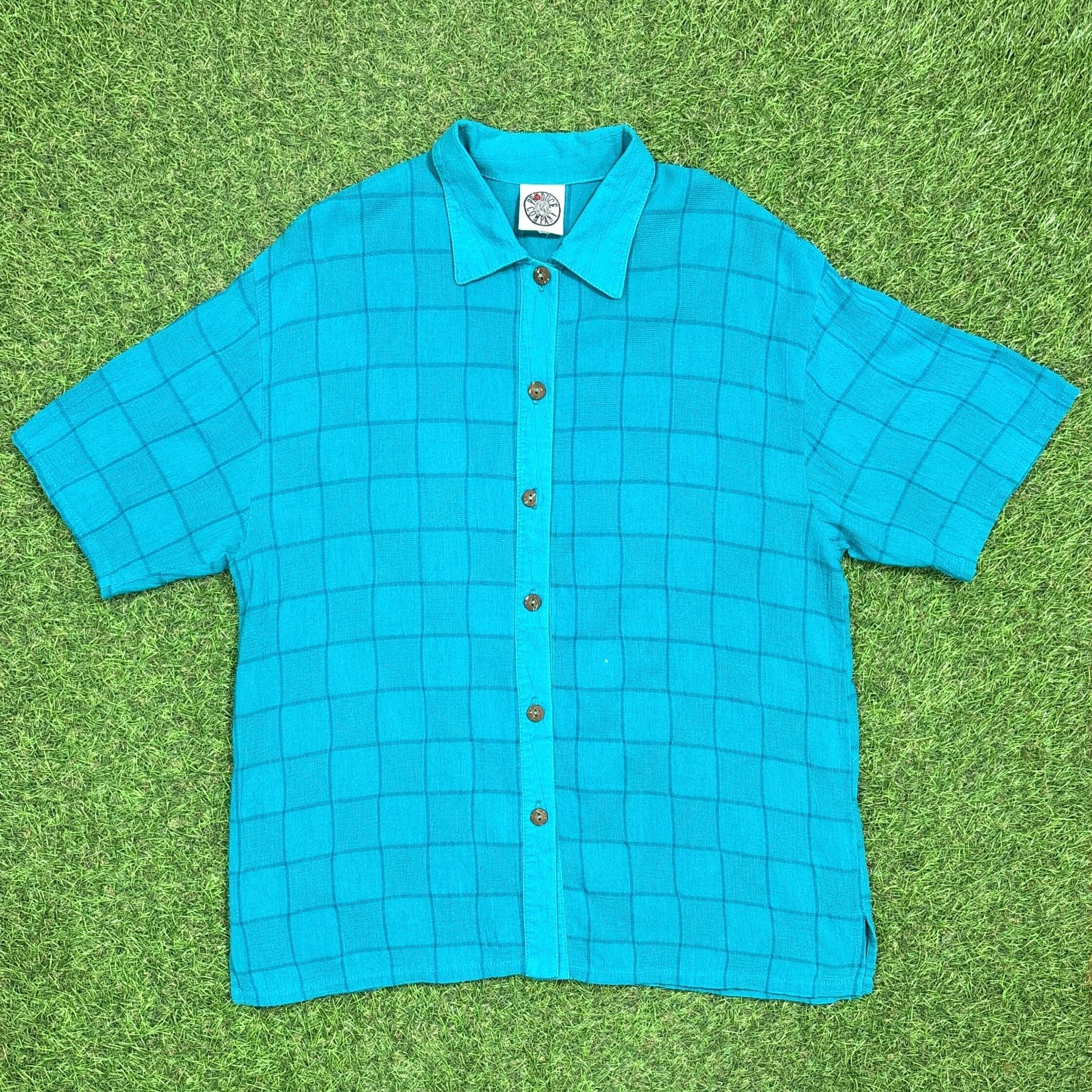 1990年代製のコットンニット素材を使用した格子柄セットアップです。爽やかなターコイズグリーンを基調に、軽やかで涼しげな印象を演出。トップスは半袖の前開きシャツタイプ、ボトムスはウエストゴム仕様のハーフパンツで、ゆったりとしたリラックス感のある着心地が魅力です。コットンニットならではの柔らかさと通気性の良さで、春夏のカジュアルコーデにぴったり。セットでも単品でも活躍できる汎用性の高いアイテムです。