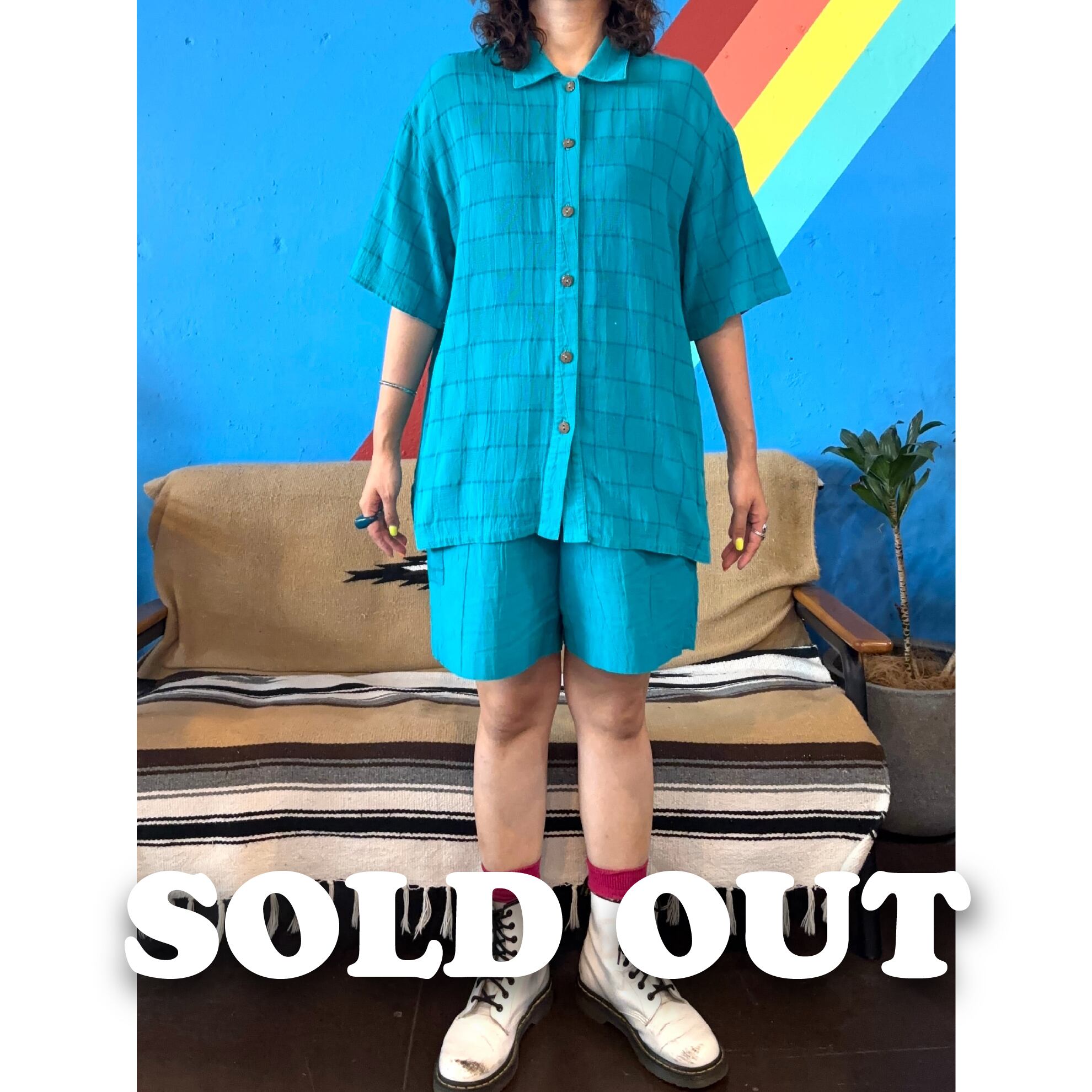 【Lady's】 90s 格子柄 コットン ニット セットアップ / 90年代 グリーン 緑 シャツ パンツ ハーフパンツ 半袖 ショーツ Made In USA 604