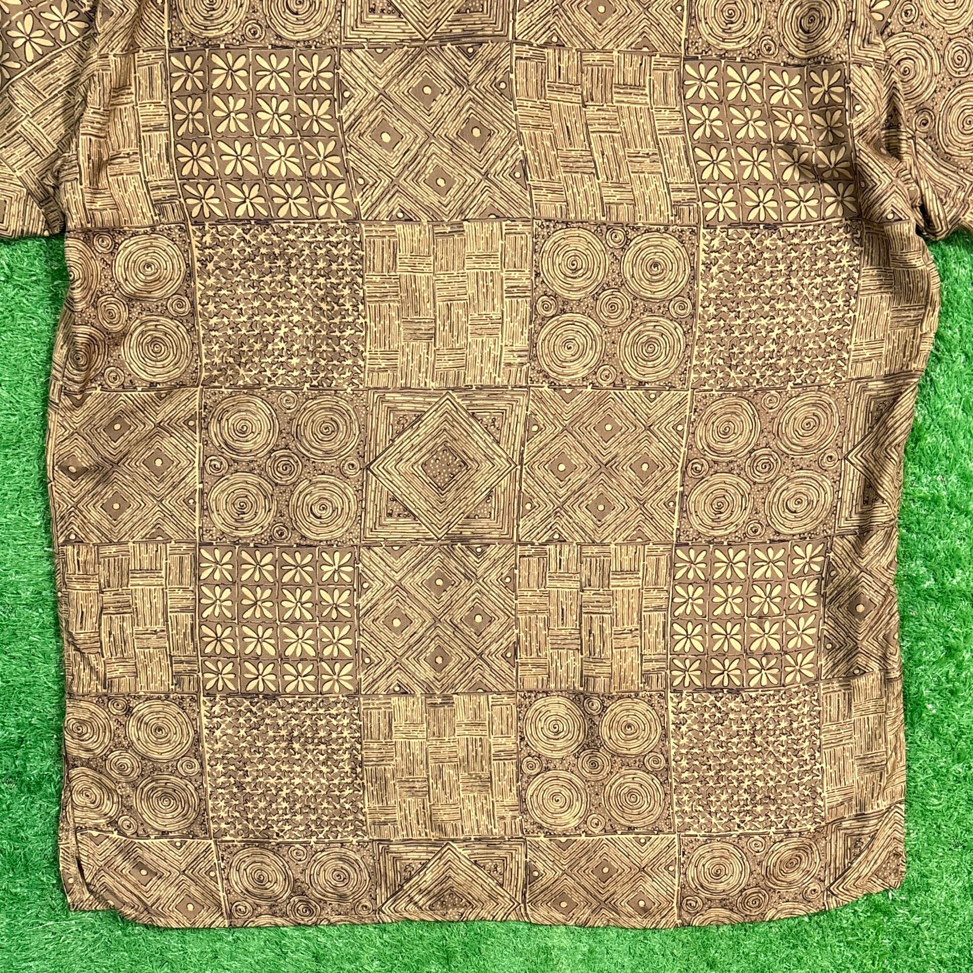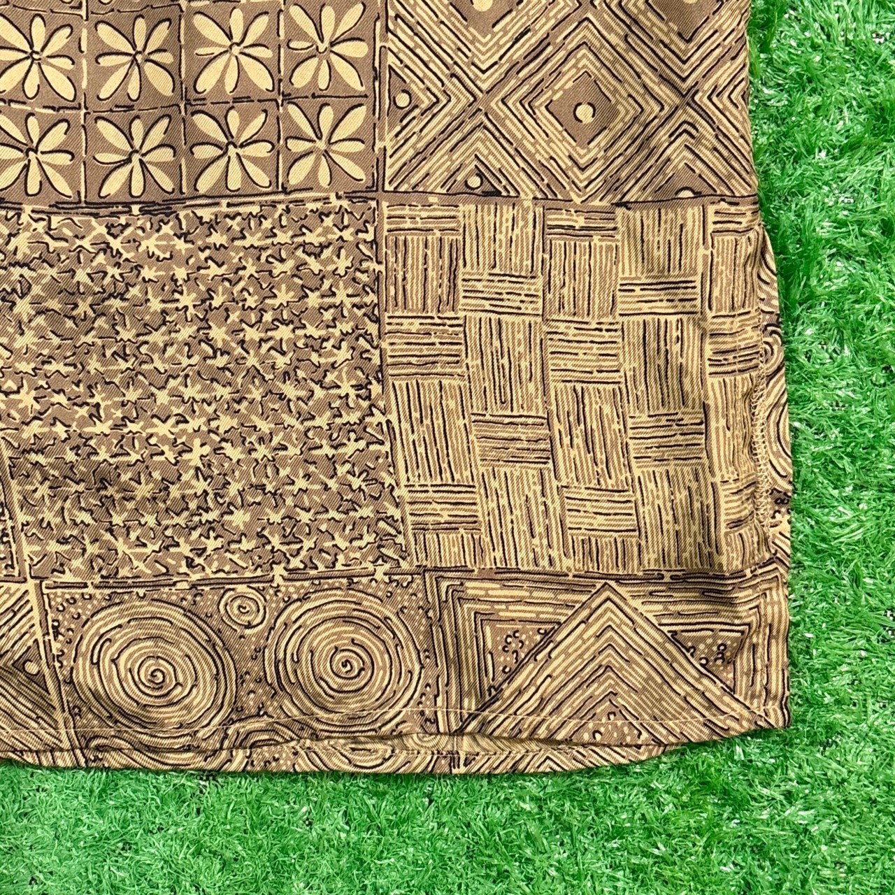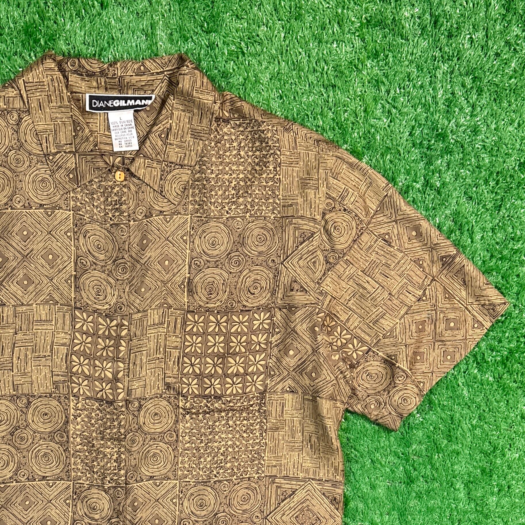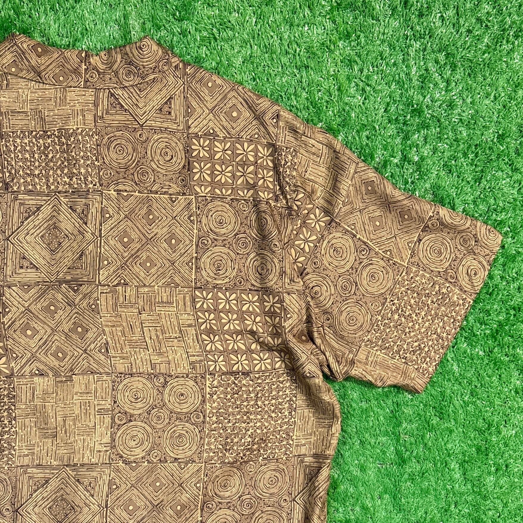 やわらかなシルク素材で、さらっとした肌触りが特徴的。幾何学模様やアジアンテイストを感じさせるデザインが、夏のスタイルに個性をプラスしてくれます。程よくゆったりとしたシルエットで、古着らしいラフな雰囲気を楽しめる一枚です。