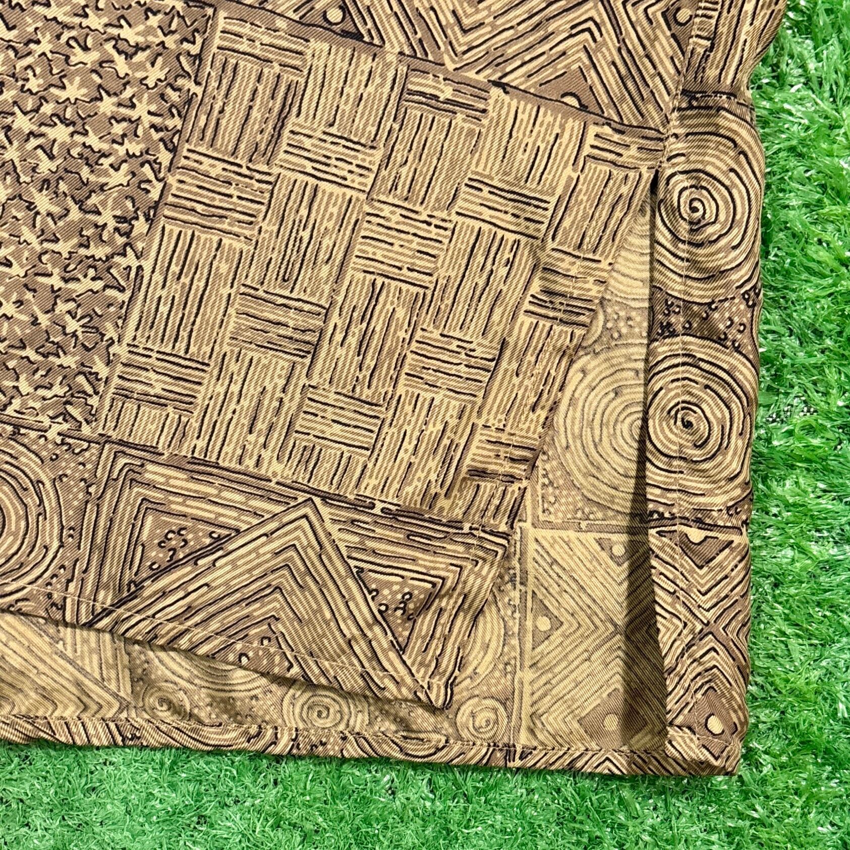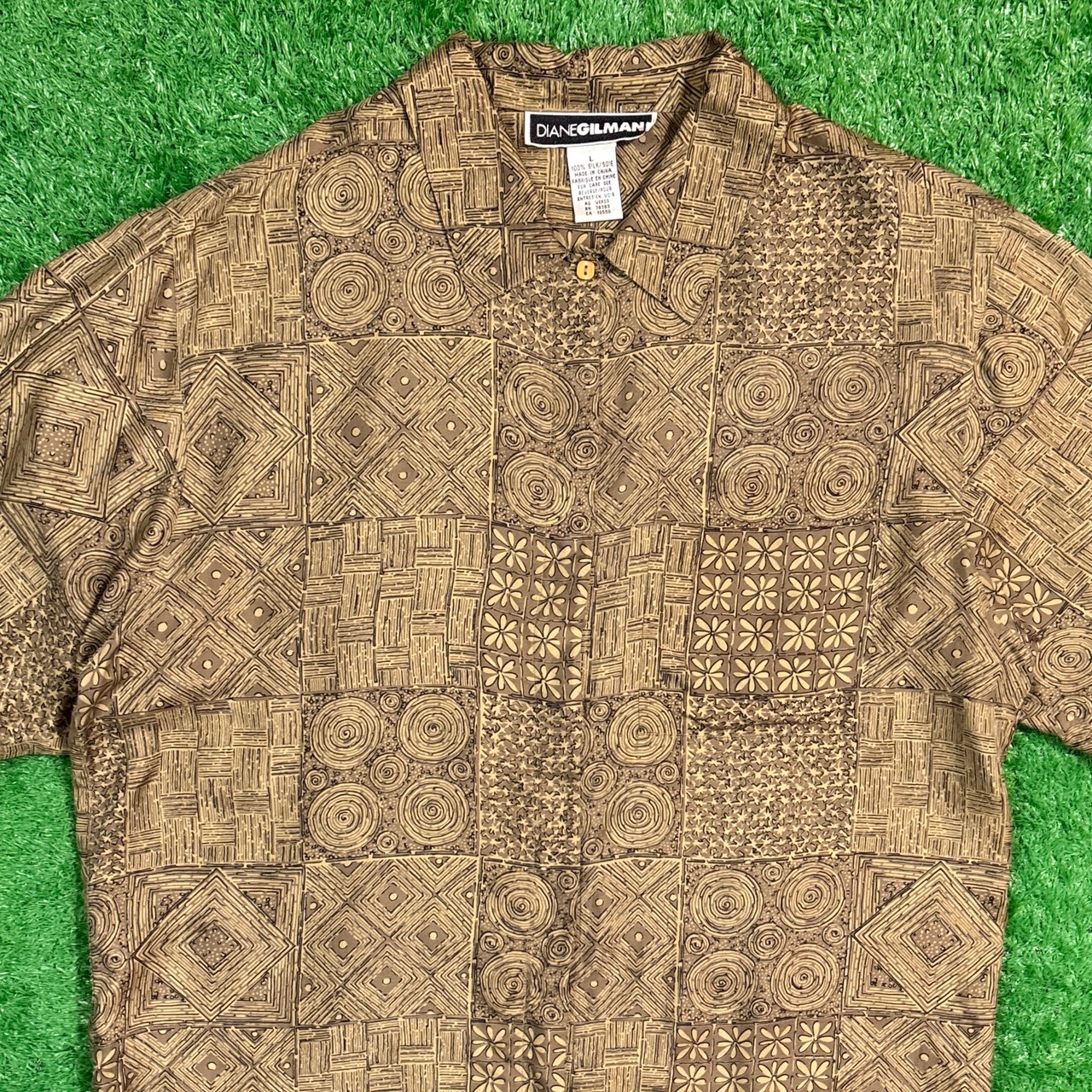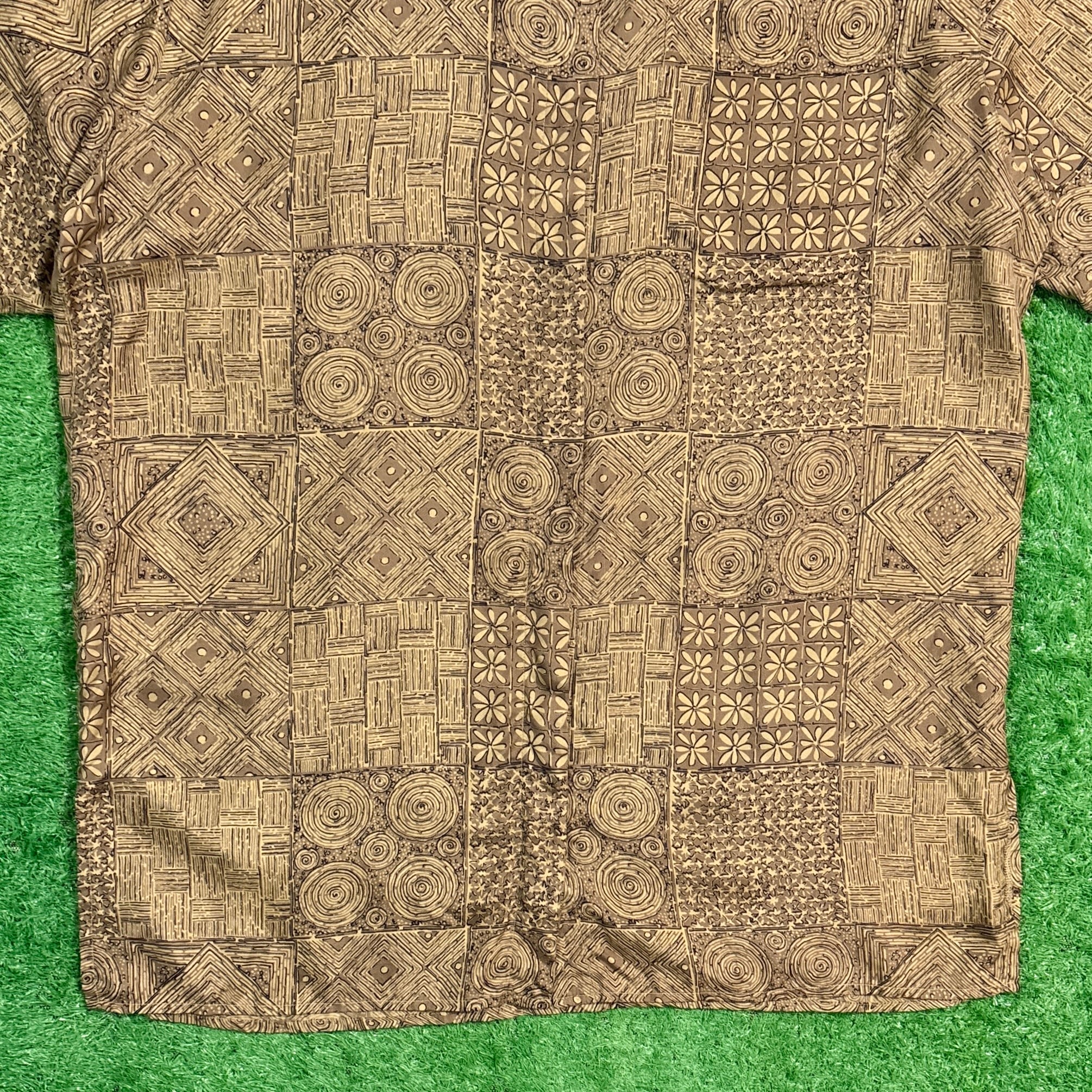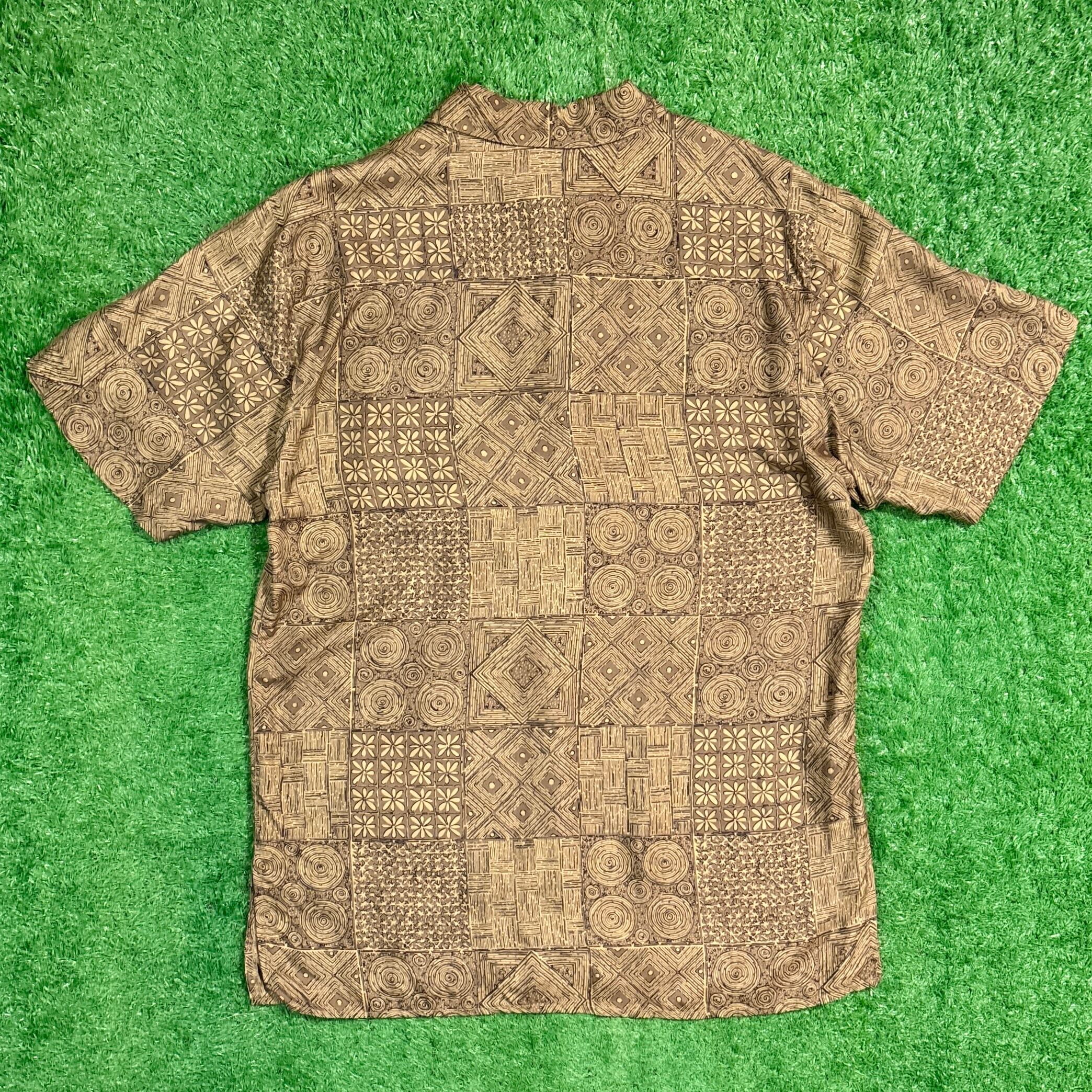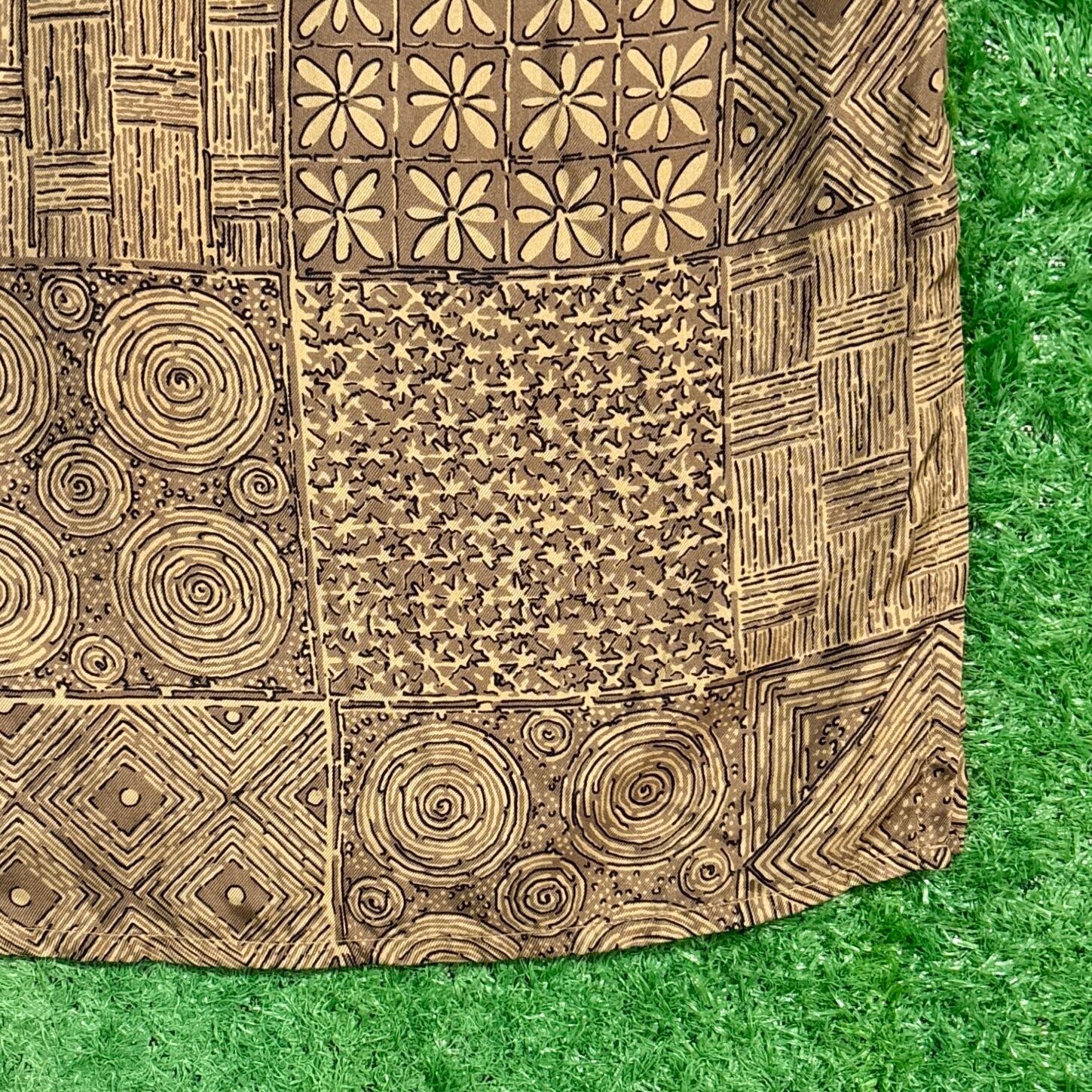 やわらかなシルク素材で、さらっとした肌触りが特徴的。幾何学模様やアジアンテイストを感じさせるデザインが、夏のスタイルに個性をプラスしてくれます。程よくゆったりとしたシルエットで、古着らしいラフな雰囲気を楽しめる一枚です。