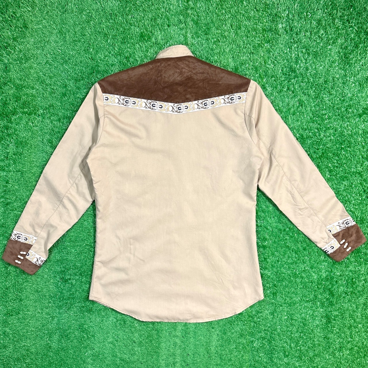 【Men's】メキシカン デザイン スタンドカラー シャツ / 古着 シャツ 長袖 メキシコ 襟なし ベージュ メンズ 617