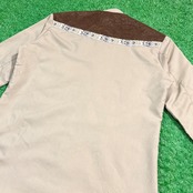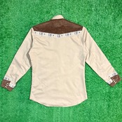 メキシコテイストのデザインが印象的なスタンドカラー長袖シャツです。ベージュのボディに、肩周りと袖口にはスエード調生地を切り替えとして配置し、上品さと温かみをプラス。民族調テープの装飾がアクセントになり、クラフト感のある雰囲気に仕上がっています。