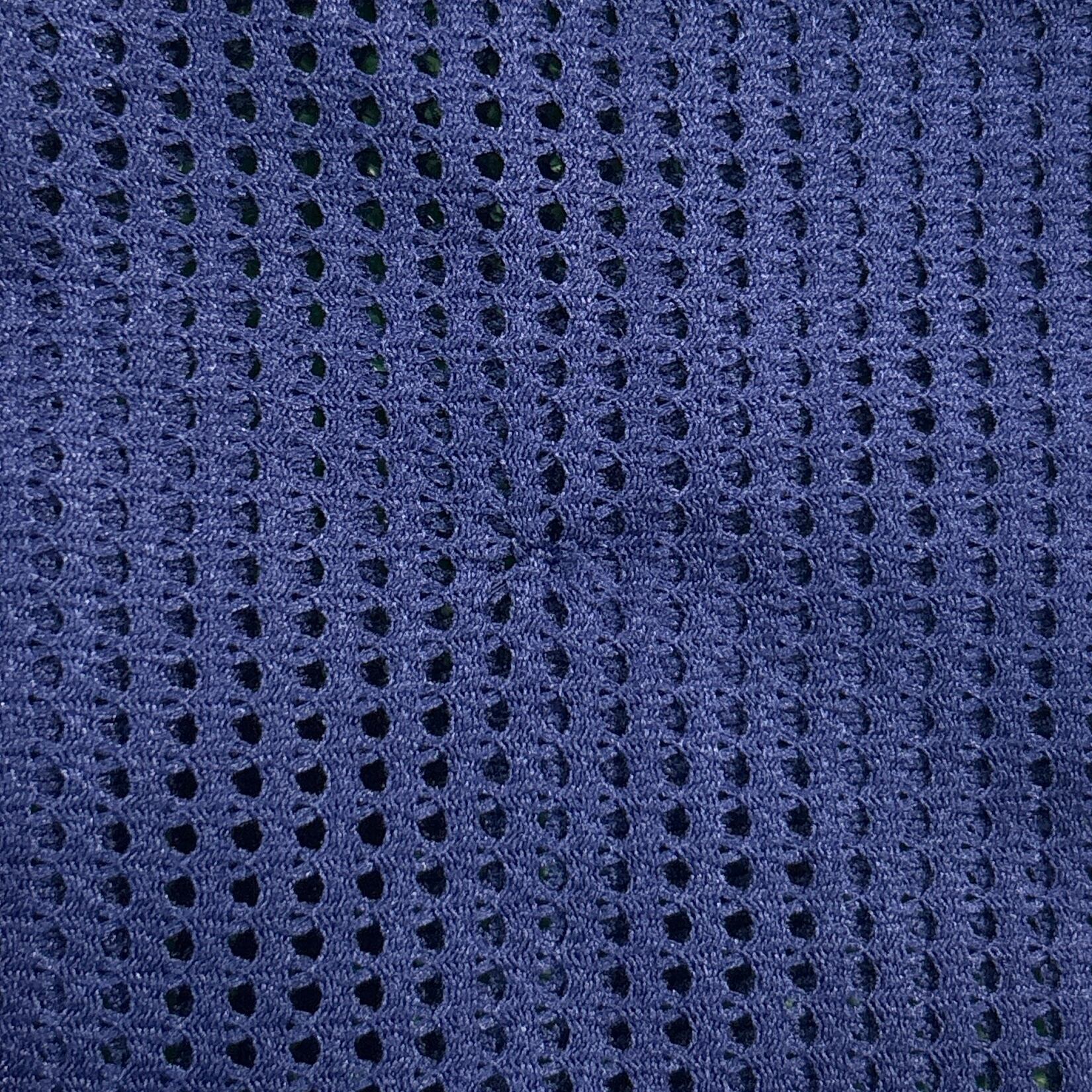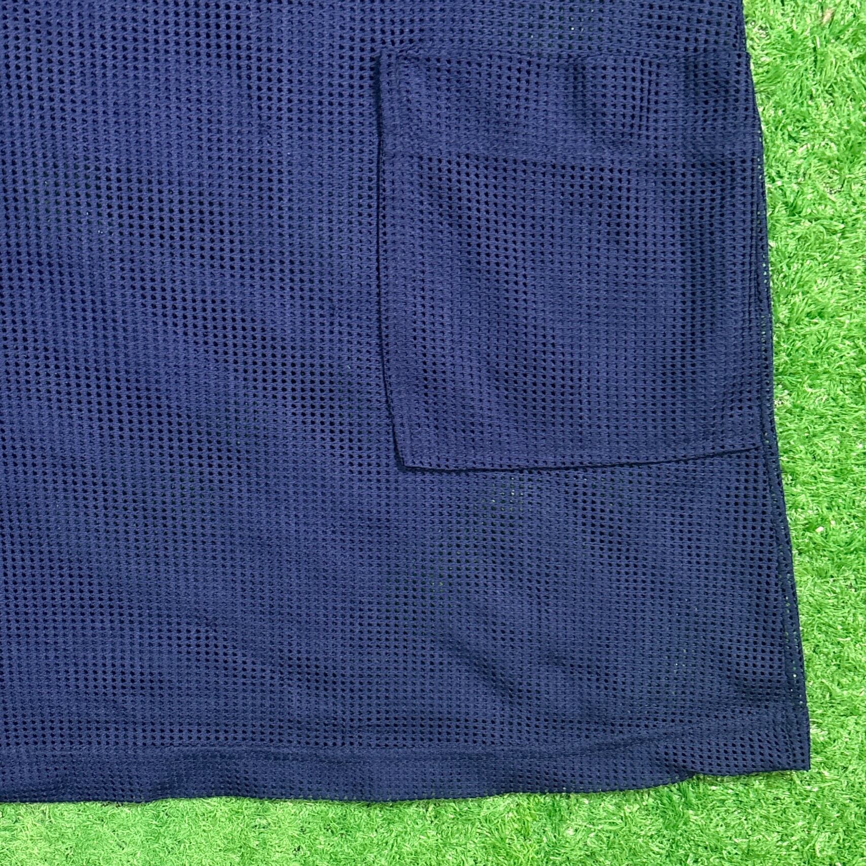 1980〜90年代のアメリカ製メッシュノーカラーシャツです。ネイビーのポリエステルメッシュ素材を使用し、軽やかで通気性抜群の仕上がり。インナーが透けて見えるシースルー感があり、レイヤードスタイルを楽しめます。前立てにはゴールドのボタンが並び、上品さとアクセントをプラス。ノーカラーデザインで首回りがすっきりとし、夏場でも涼しく快適に着用可能です。