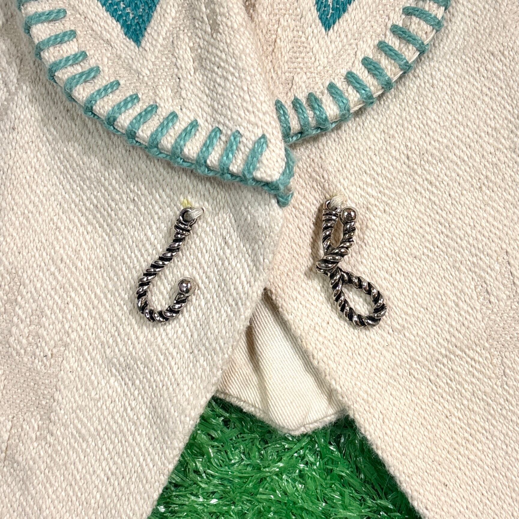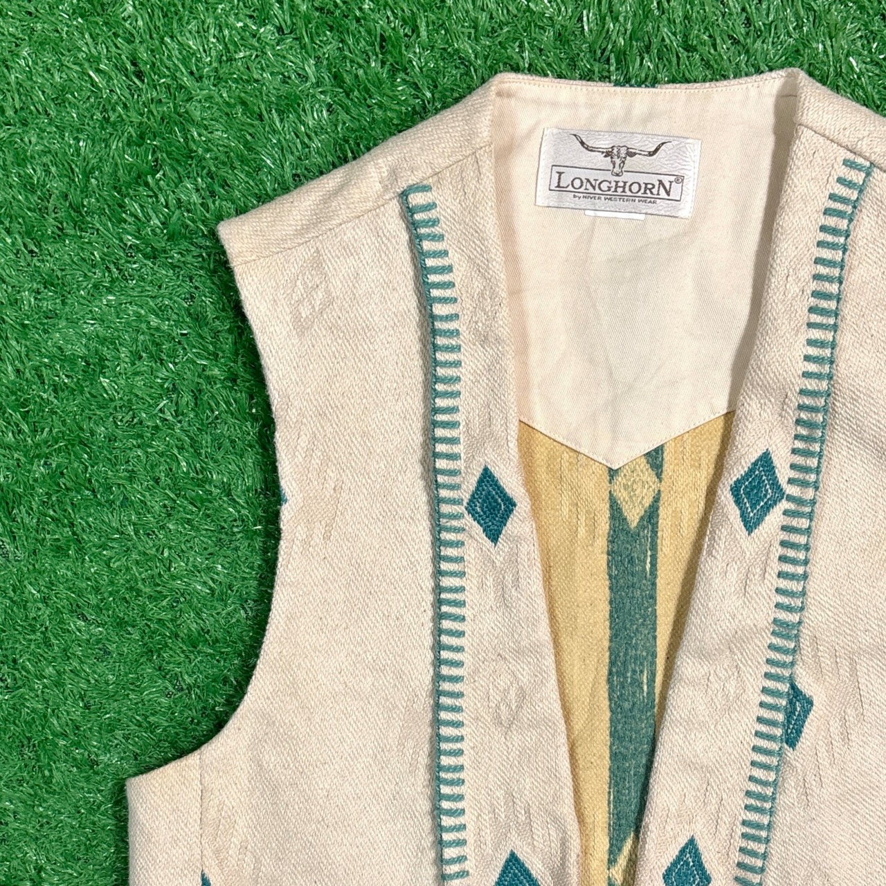 ターコイズブルーのオルテガ柄が前後にあしらわれた存在感ある一着。前合わせはフック仕様で、ウエスタンやネイティブスタイルを彷彿とさせるディテールが魅力です。厚手の生地感で、インナーとの組み合わせ次第でロングシーズン着用可能。