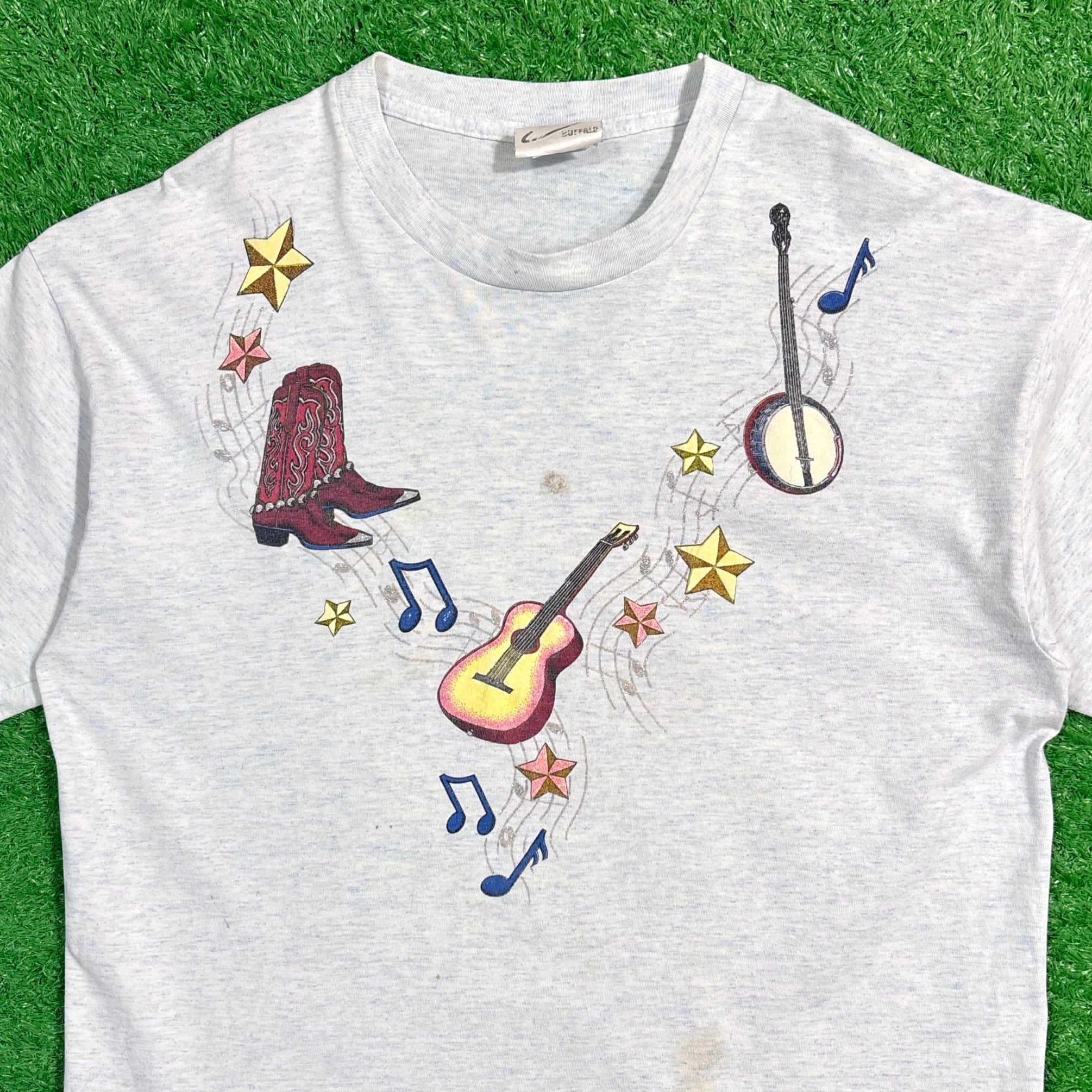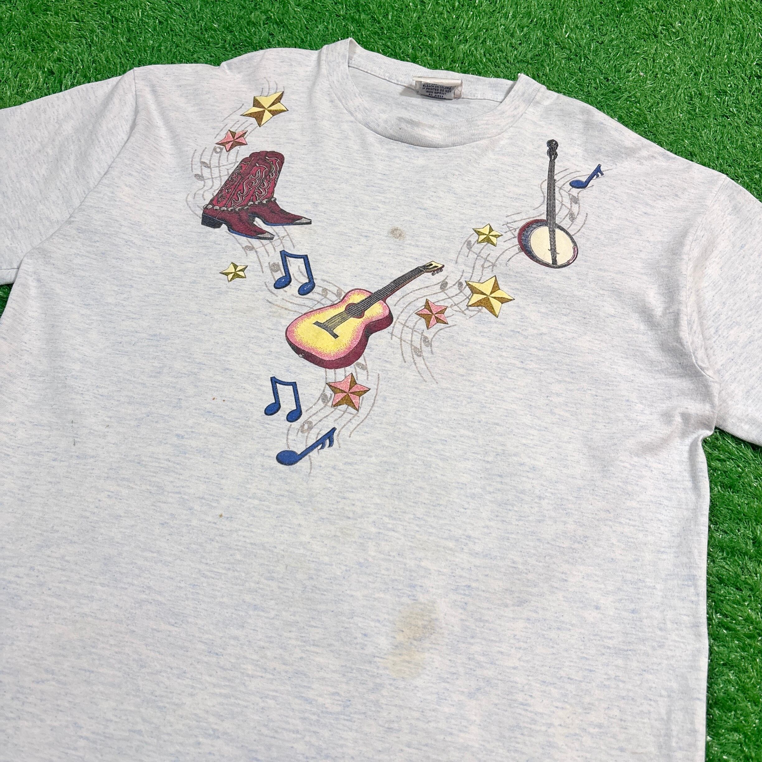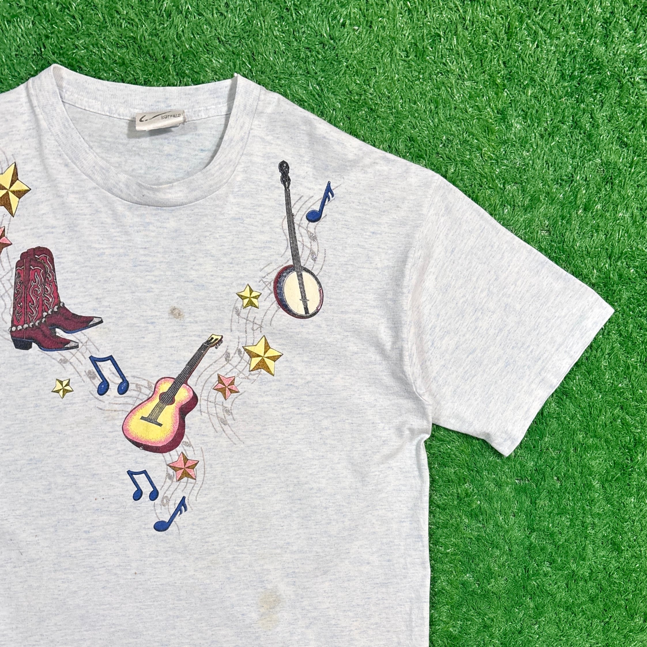 90年代らしいアメリカ製のプリントTシャツ。カウボーイブーツやバンジョー、ギターなどカントリーミュージックを象徴するイラストが散りばめられた、遊び心のある一枚です。