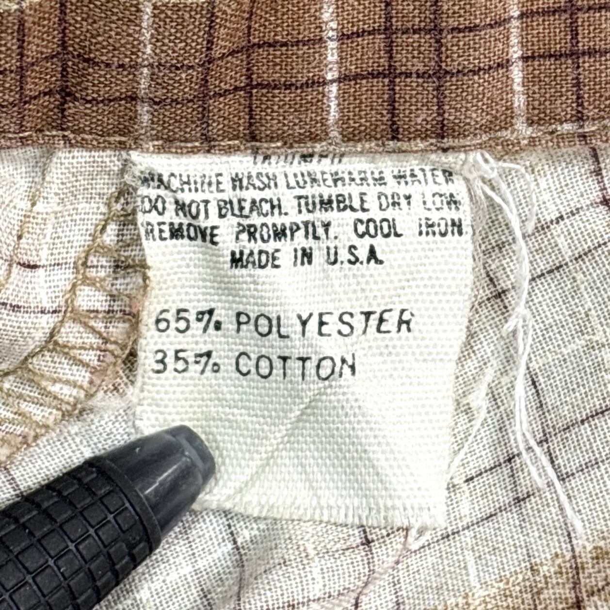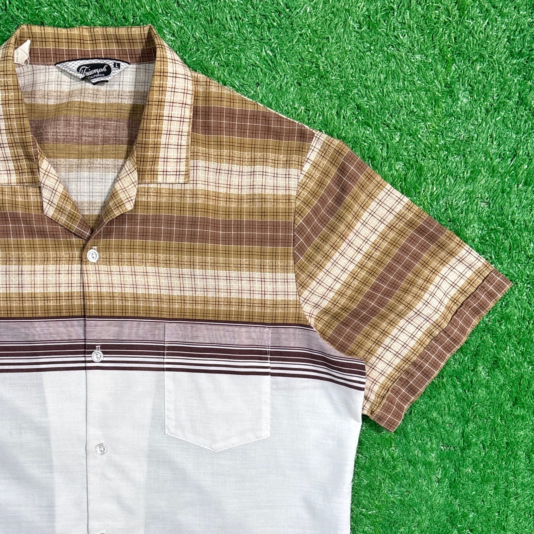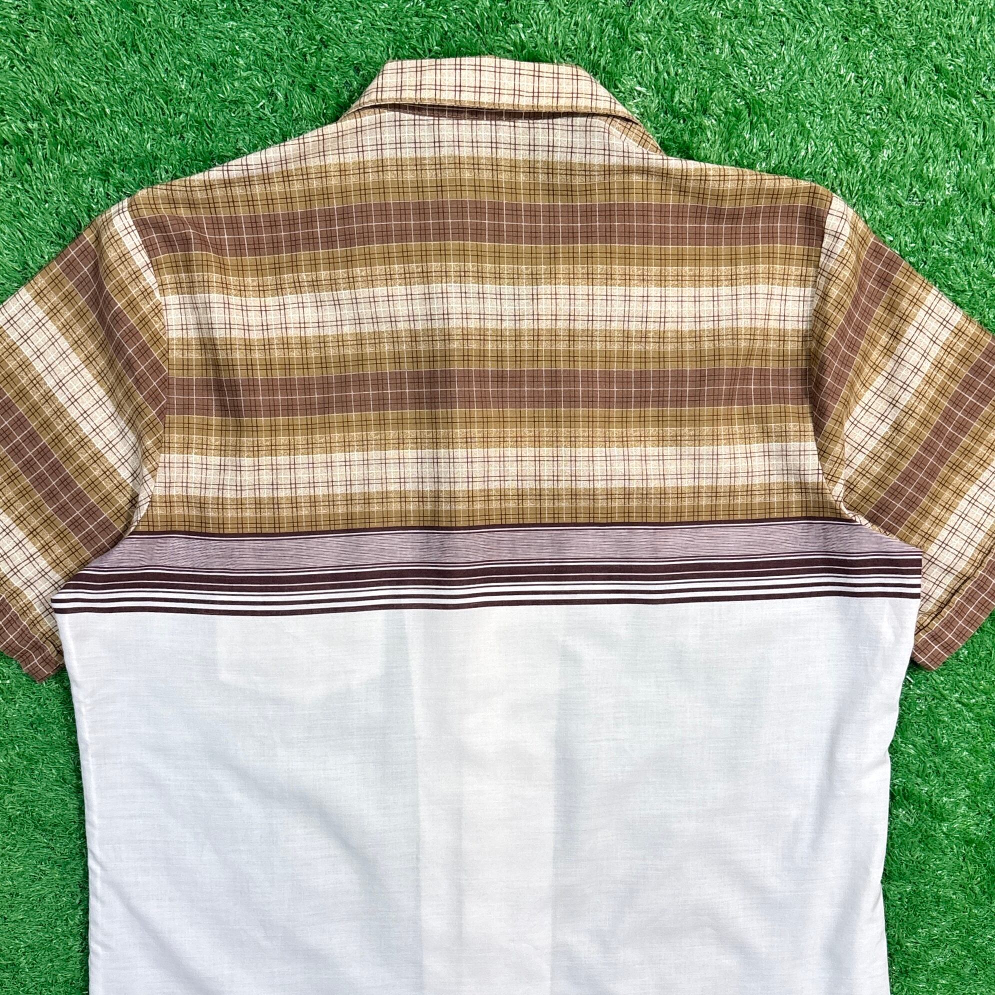 肩から胸にかけてはブラウンベースのチェック柄、胸下から裾にかけては無地のホワイト生地を組み合わせたツートン切り替え仕様が特徴。程よく開いたオープンカラーがリラックス感を演出し、当時らしいレトロな雰囲気を漂わせます。軽やかなコットン系素材で、夏場でも快適な着用感です。