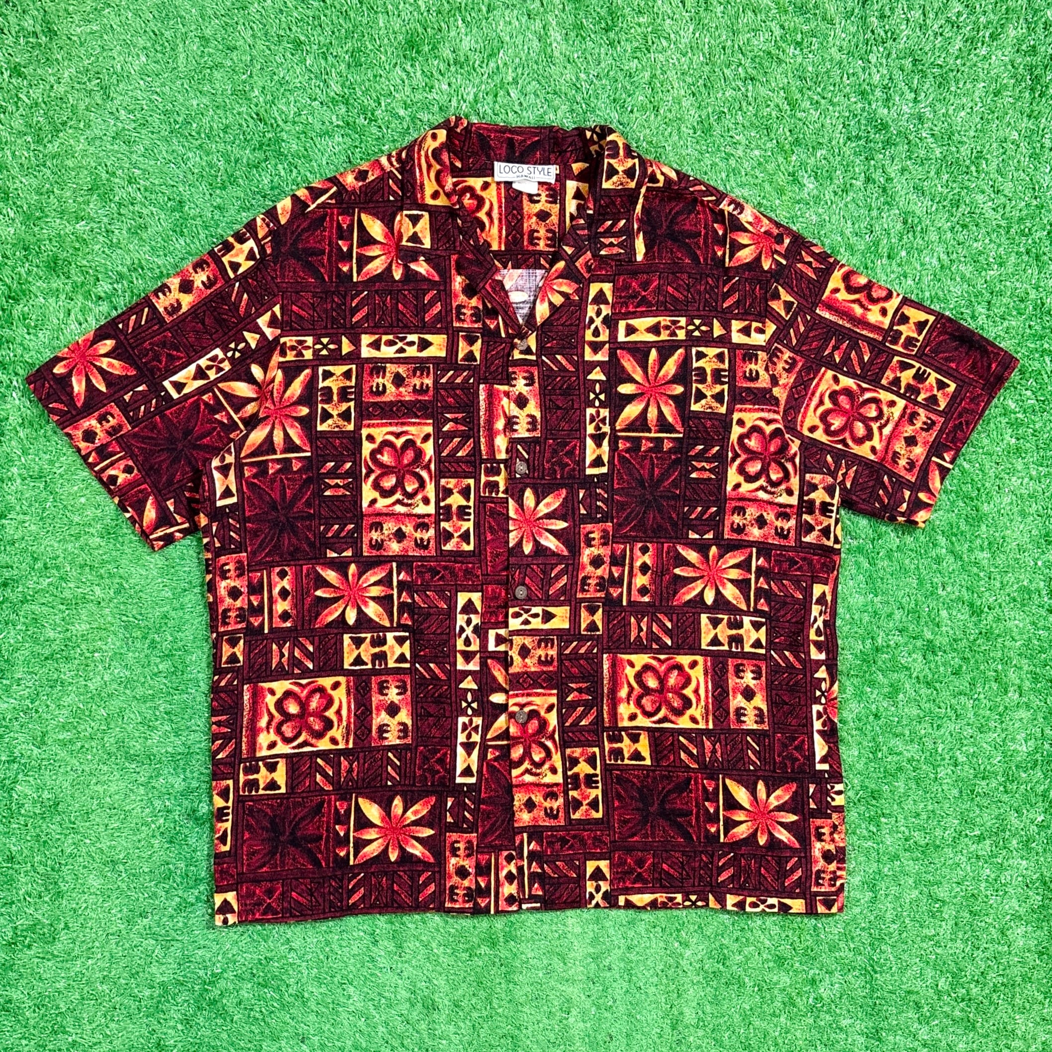 独特のシボ感のある生地は、夏場でも快適な着心地。シャツ全体に施されたオールオーバーの総柄デザインは、ポリネシアンやトライバルの要素を感じさせるエスニックテイストで、リゾート感と存在感を兼ね備えています。