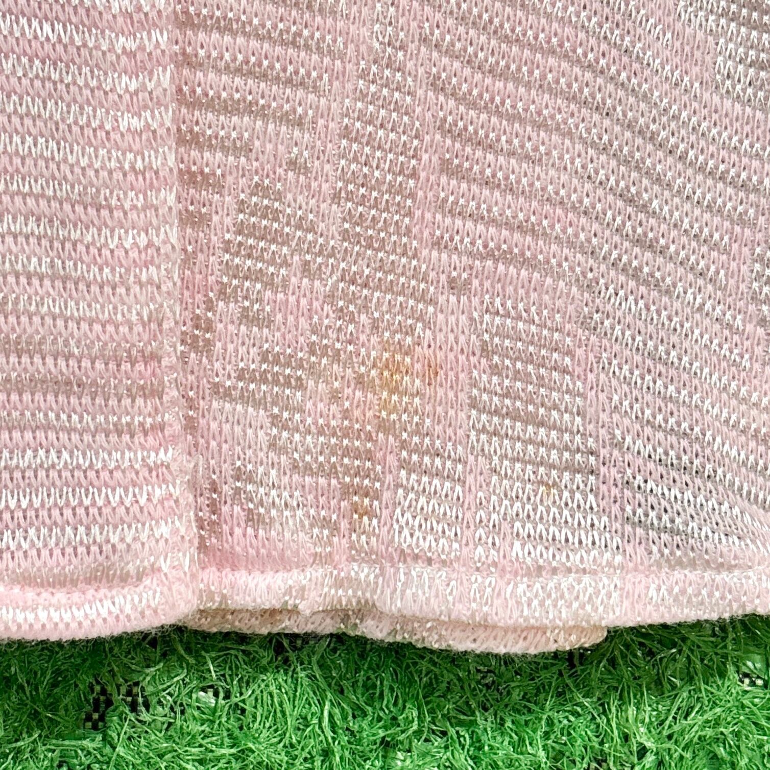 淡いピンクカラーに透け感のあるアクリル素材を使用し、ジャージのような軽やかさを兼ね備えています。フロントは全開仕様のボタンデザインで、羽織りとしても着用可能。程よくフィットするシルエットと、裾のフレア切り替えが女性らしい動きを演出します。織り柄で花のような模様がさりげなく入っており、上品かつ可憐な印象です。