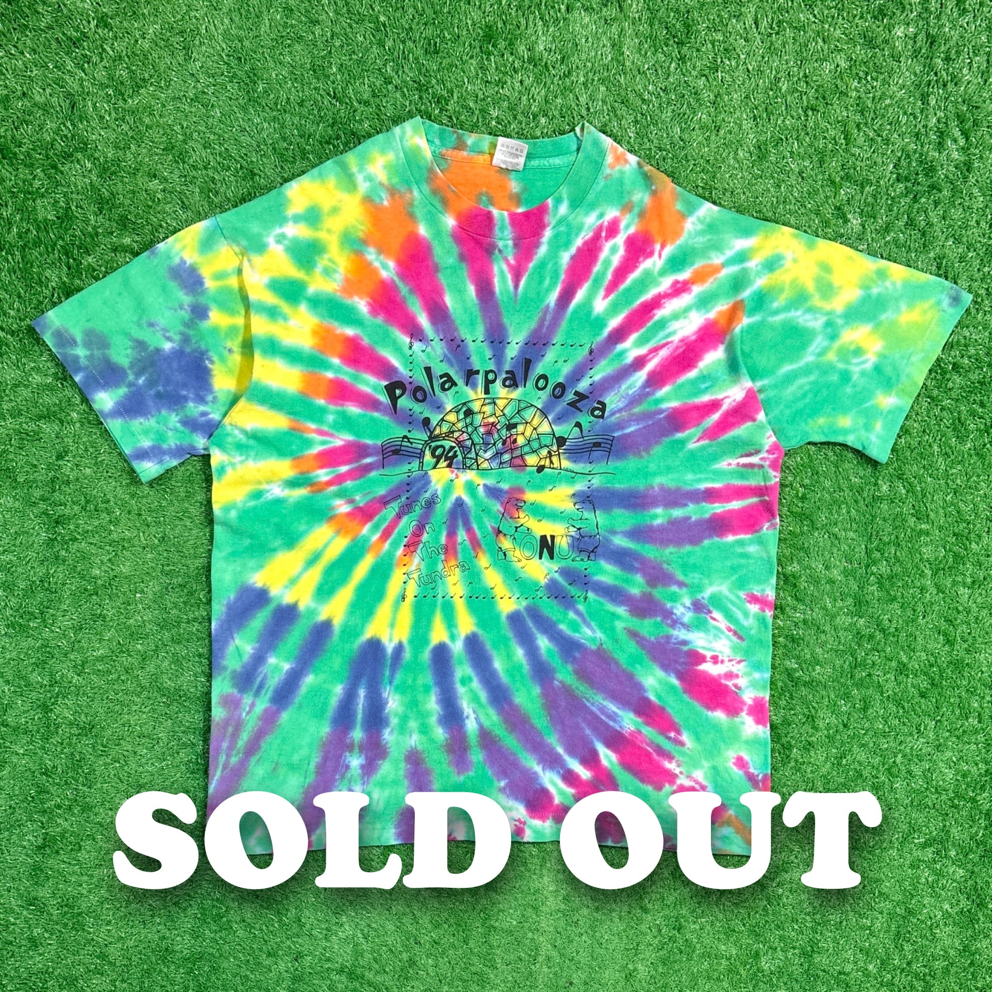 フロントには「Polarpalooza 94」と「Tunes on the tundra」の文字、白クマのイラストがあしらわれ、バックには出演アーティストと思われる名前がプリントされています。タイダイの色落ちも良い感じです。