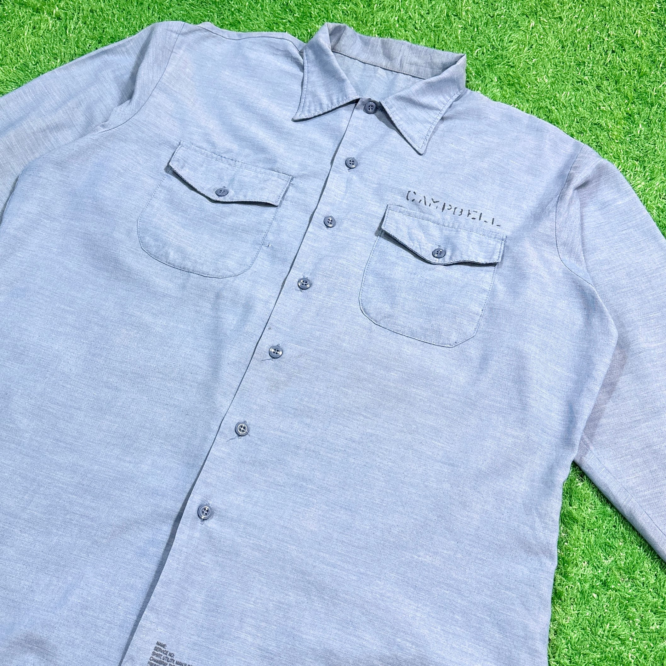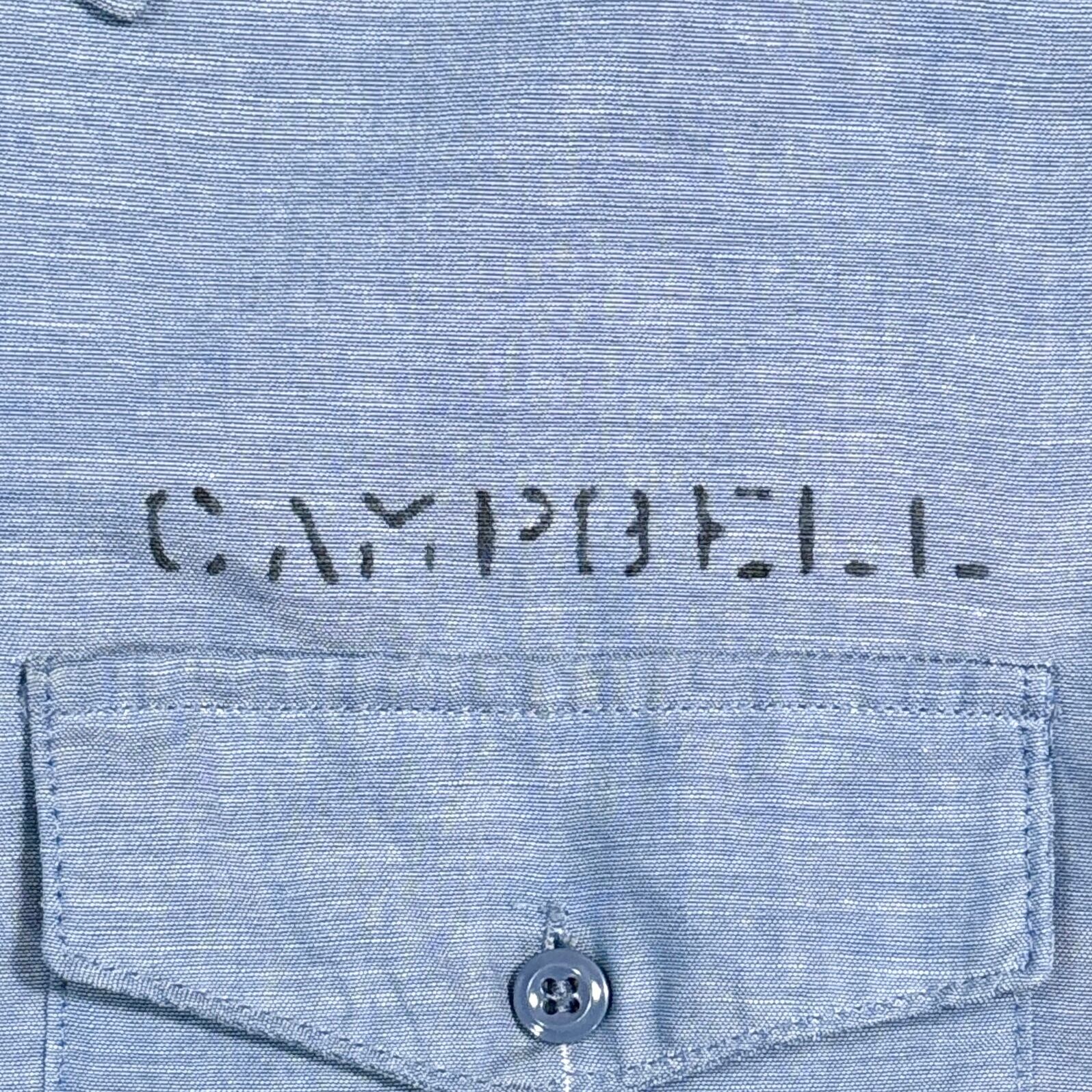 フロントにはフラップ付きの胸ポケットを2つ備え、シンプルながらも機能的なディテールを備えています。胸元に「CAMPBELL」とスタンシルが入っており、個体ごとのユニークな表情を楽しめる一点です。