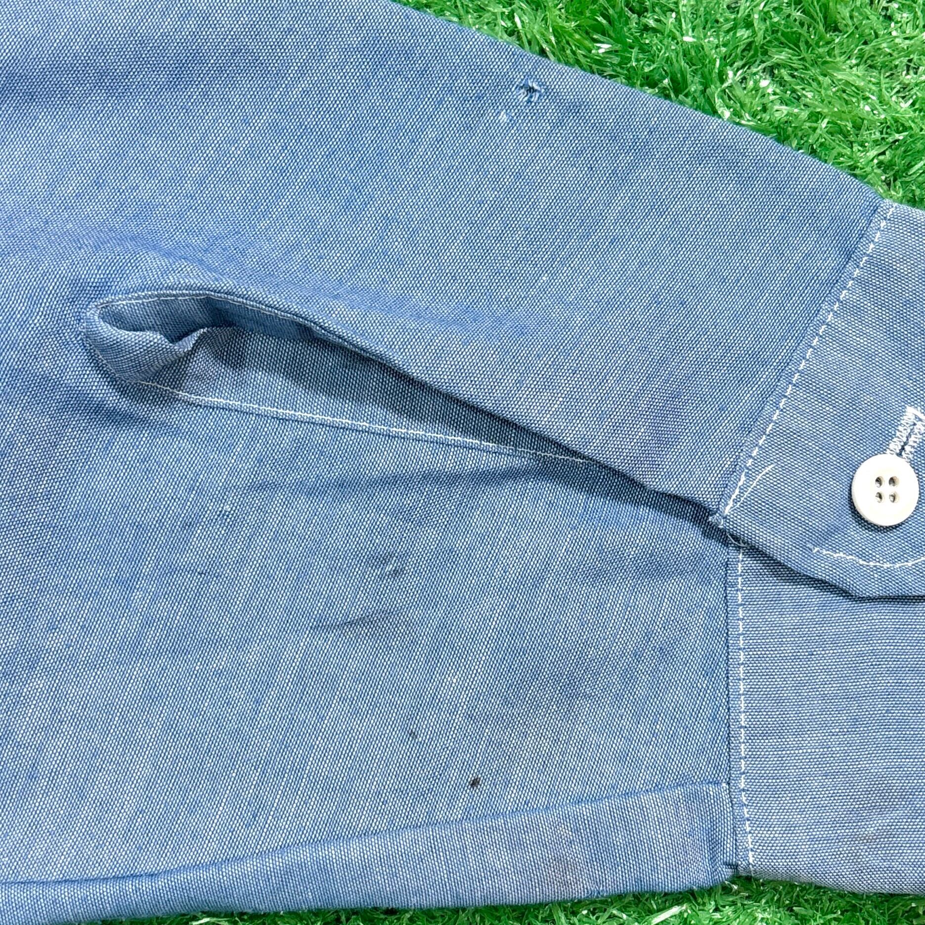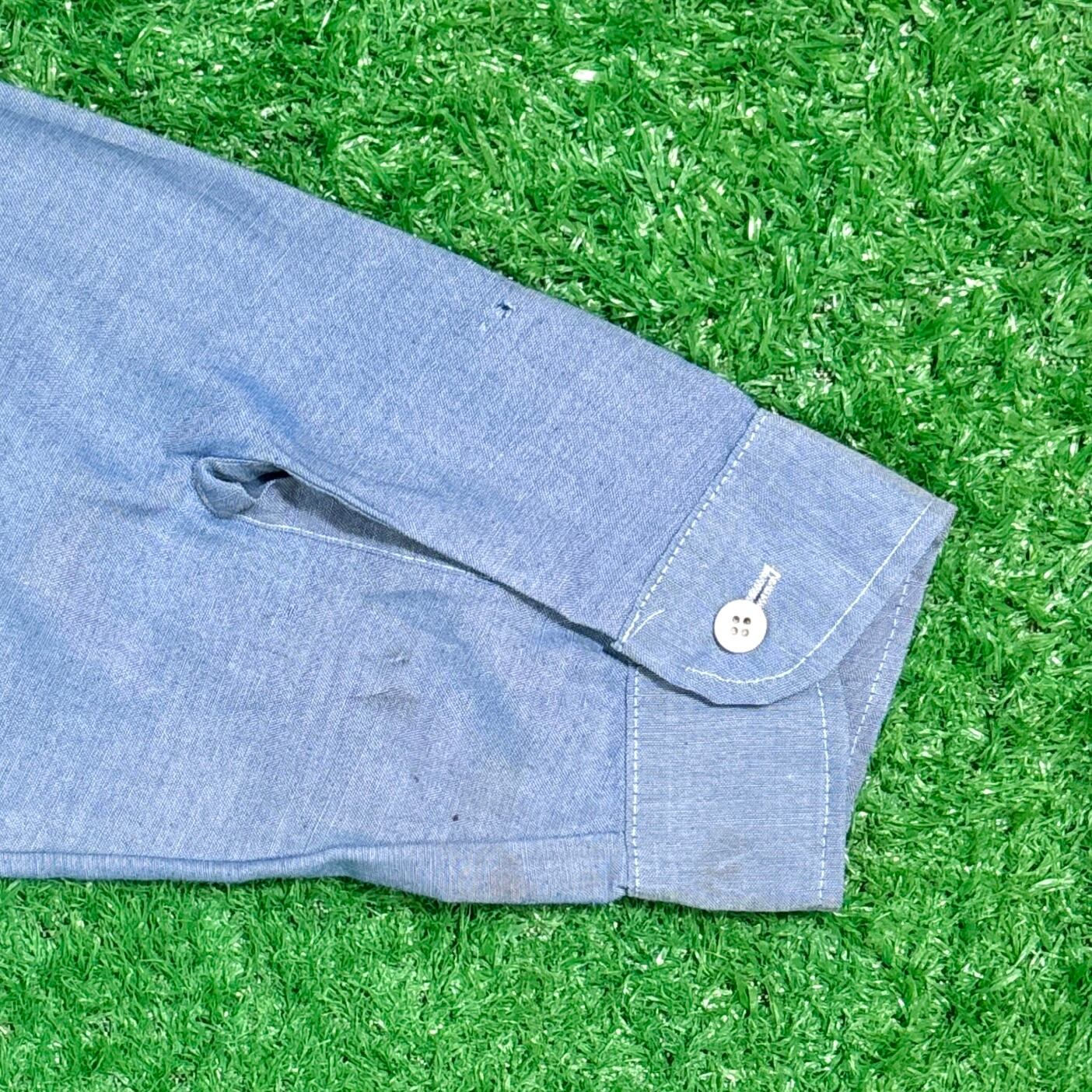 シャンブレー生地ならではの軽やかさとタフさを兼ね備え、ワークシャツらしい無骨な雰囲気を漂わせる一着。胸にはフラップ付きのポケットが左右に配され、シンプルながら実用性を感じさせるデザインです。少しダメージ多めでヴィンテージ特有の色味や質感が魅力で、着込むほどに味わい深い表情を見せてくれます。