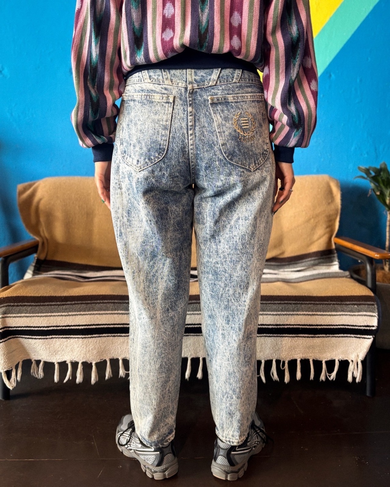 特徴的な淡いブルーのケミカルウォッシュ加工が施され、独特のヴィンテージ感を演出。バックポケットにはブランドロゴ刺繍が入っており、ワンポイントのアクセントになっています。テーパードシルエットで、90sらしいハイウエスト仕様。