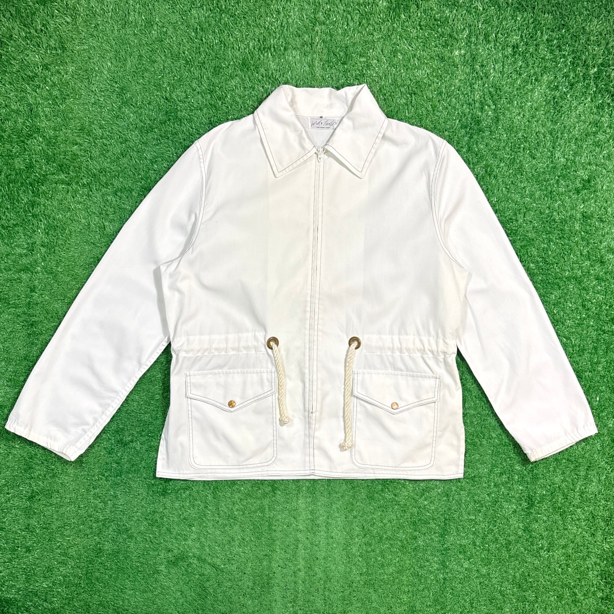 シンプルながら当時らしいシルエットで、軽やかな薄手素材を使用しているため、春や秋の軽い羽織りとしてぴったりの一着です。ホワイトカラーの清潔感あるルックスに加え、ウエスト部分に施されたドローコードがアクセントとなり、シルエット調整も可能。