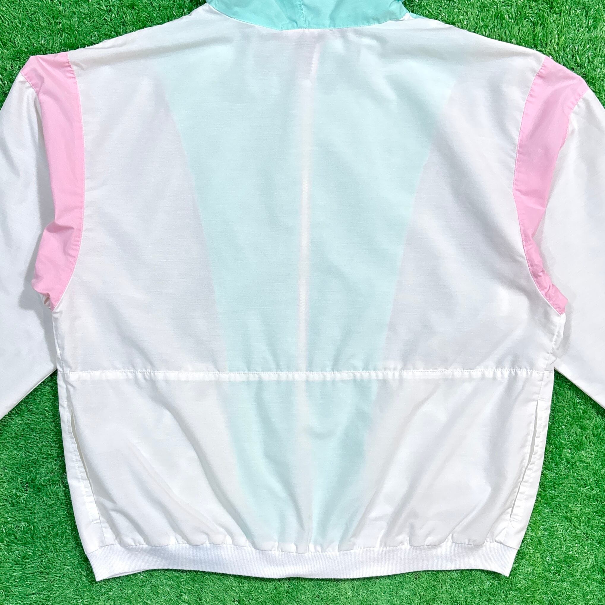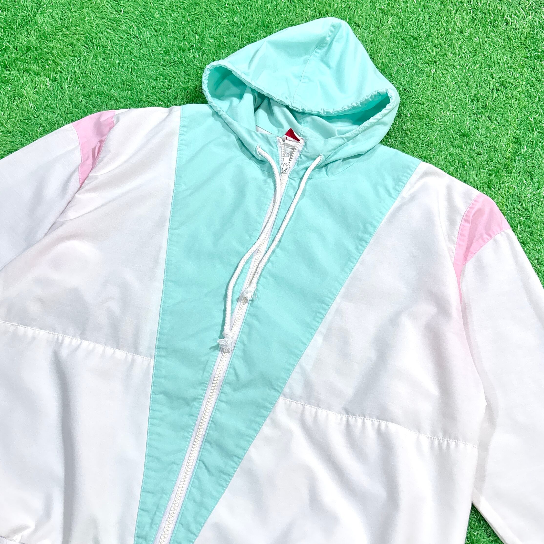 ホワイトをベースにミントグリーンとピンクのパステルカラーが映える一枚。薄手で軽やかな素材感なので、春夏秋シーズンの羽織りやアクティブシーンにもぴったりです。フード付きのデザインで、スポーティーさとカジュアル感を兼ね備えたアイテムとなっています。