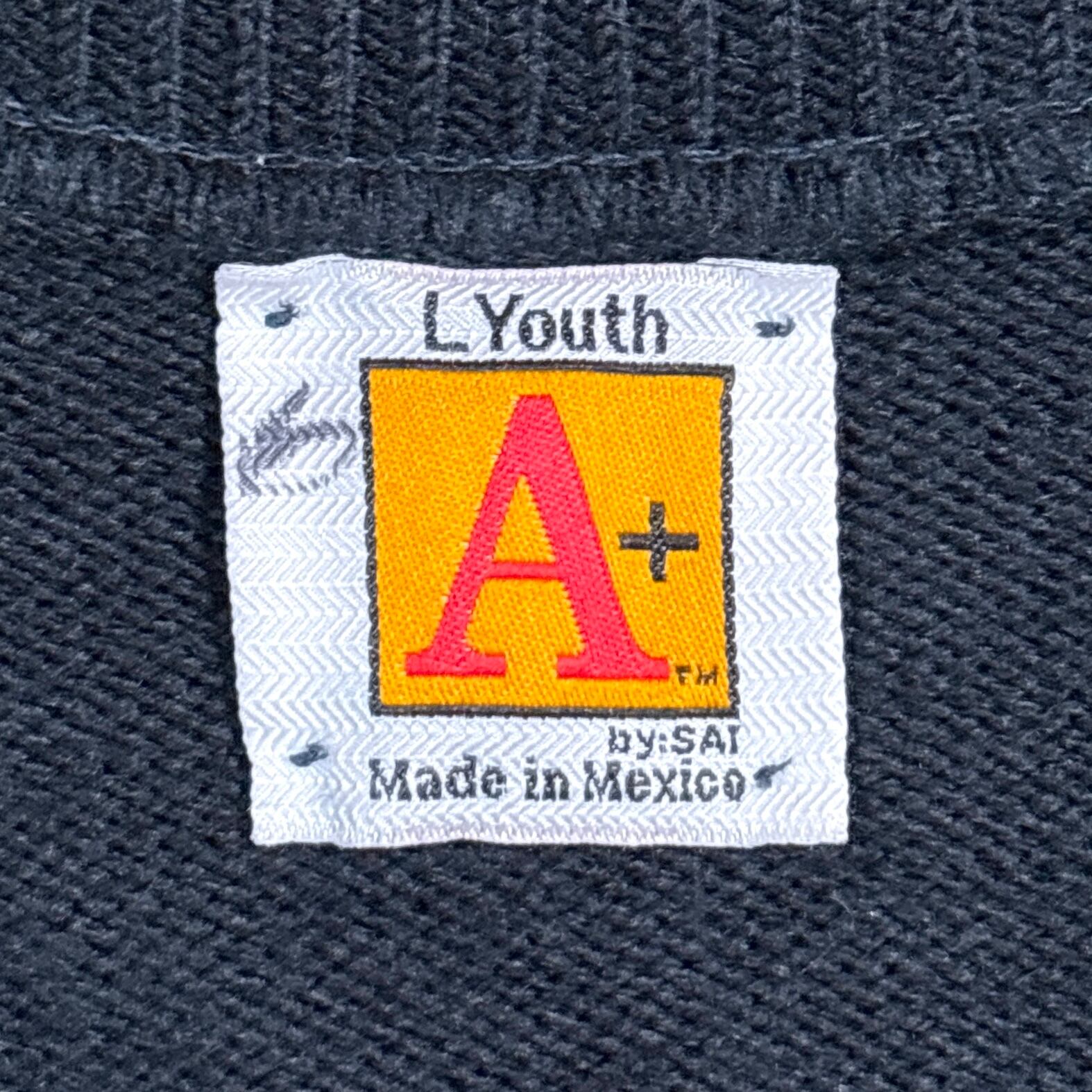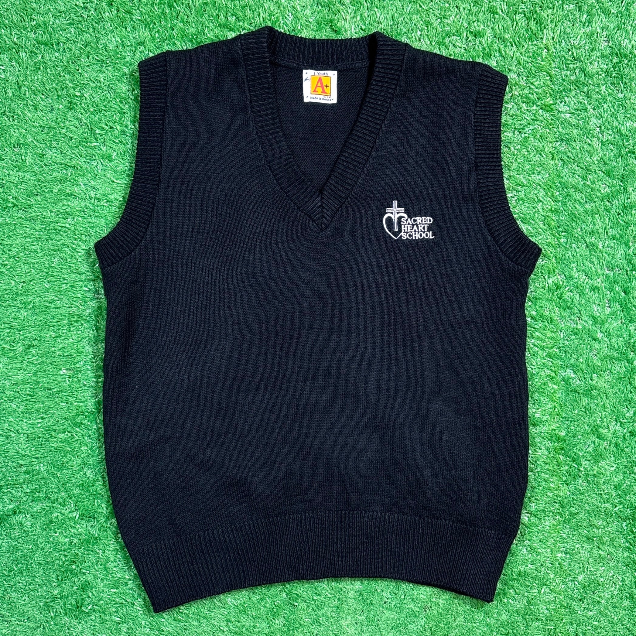 フロント胸元には「SACRED HEART SCHOOL」の刺繍が施されており、スクールユニフォームとして実際に使用されていた一着。素材は軽やかで扱いやすいアクリルニットで、シーズンを問わず着やすい質感です。シンプルなブラックカラーにホワイトの刺繍が映え、古着ならではのスクールテイストが楽しめます。
