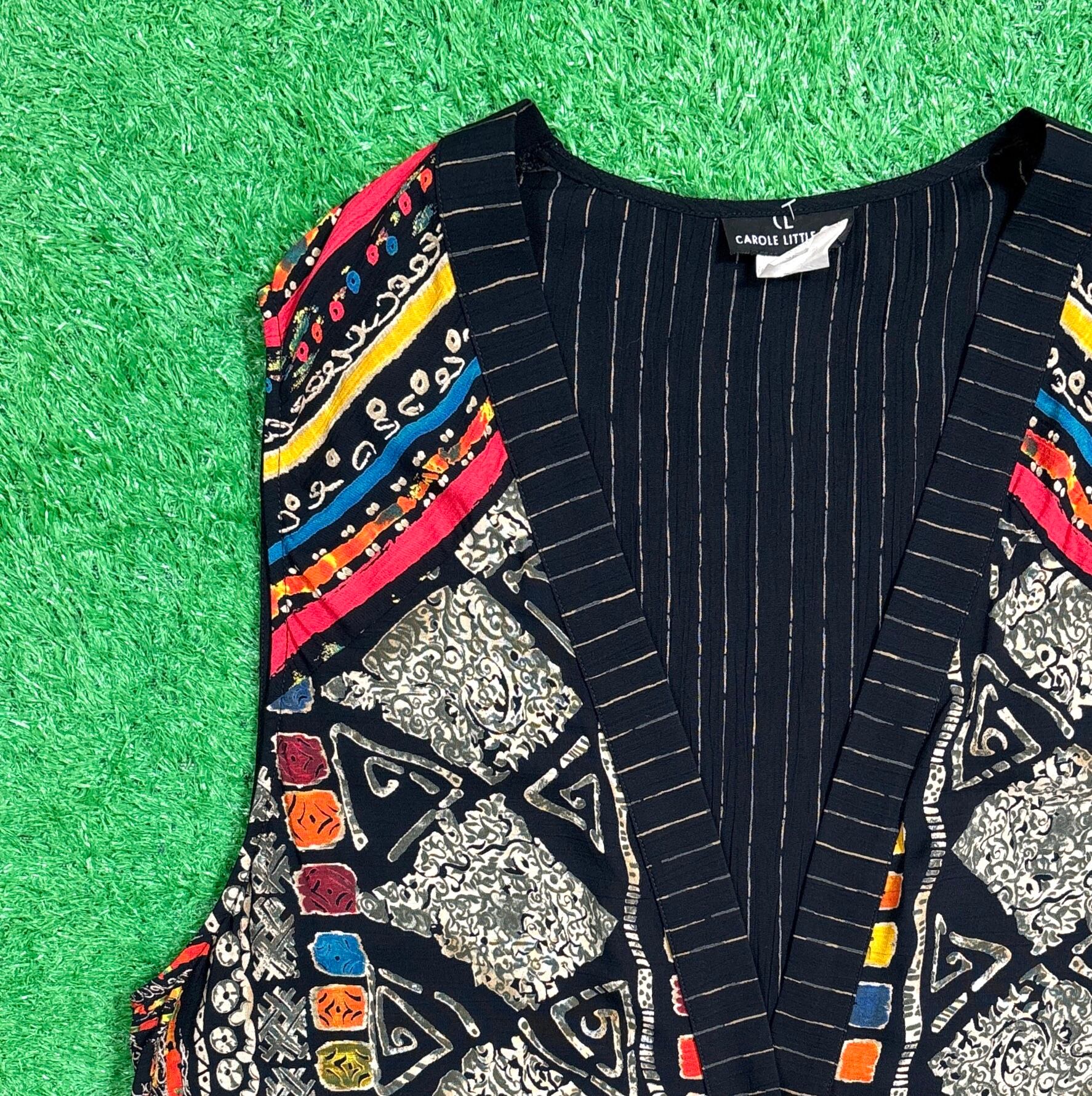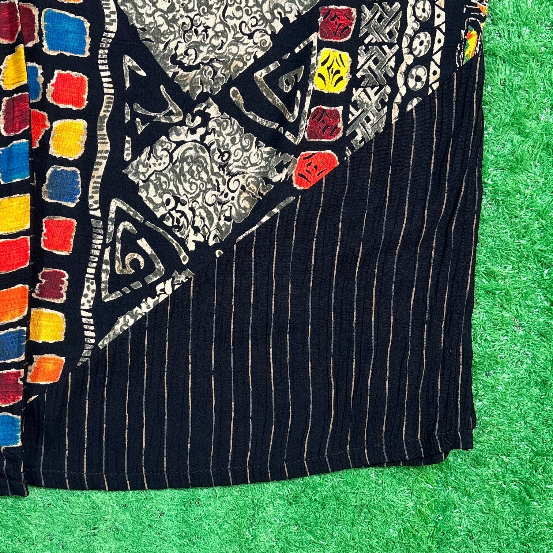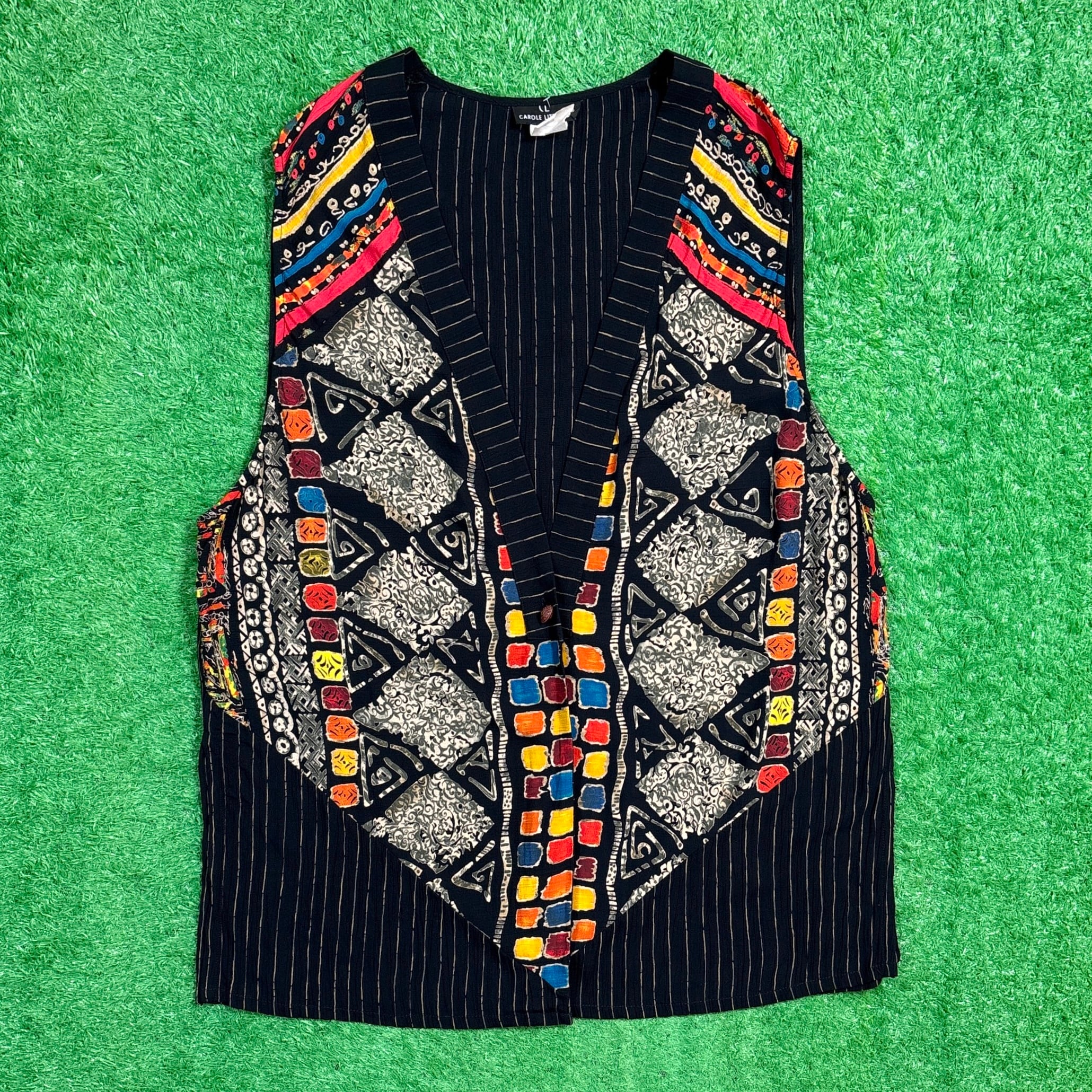 レーヨン素材特有の軽やかで柔らかな質感が心地よく、動きに合わせて揺れるシルエットが魅力。幾何学模様やエスニック調のカラフルなパターンが全体にあしらわれ、コーディネートにアクセントを加えてくれる一枚です。フロントはVネックのデザインで、シンプルなトップスの上に羽織るだけで雰囲気のあるスタイルが完成します。