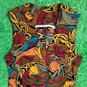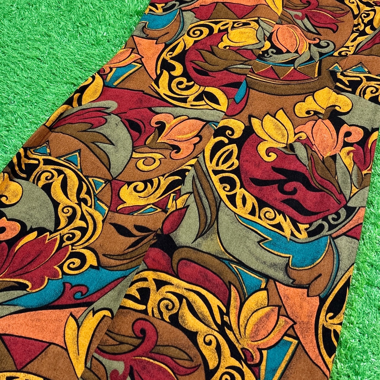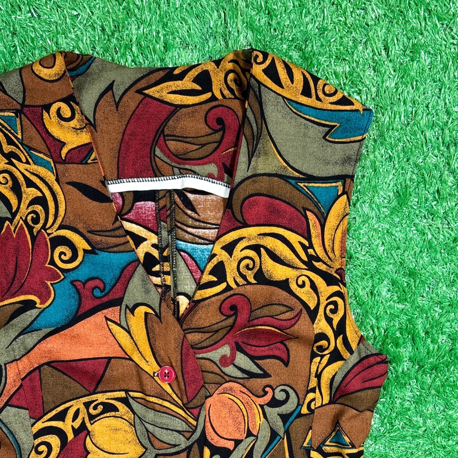 大胆な総柄デザインが目を惹く一枚。エスニックな雰囲気とクラシカルな華やかさを兼ね備えています。ノースリーブ仕様で、夏場も涼しく快適に着用可能。古着ならではの個性を楽しめる、存在感たっぷりのワンピースです。