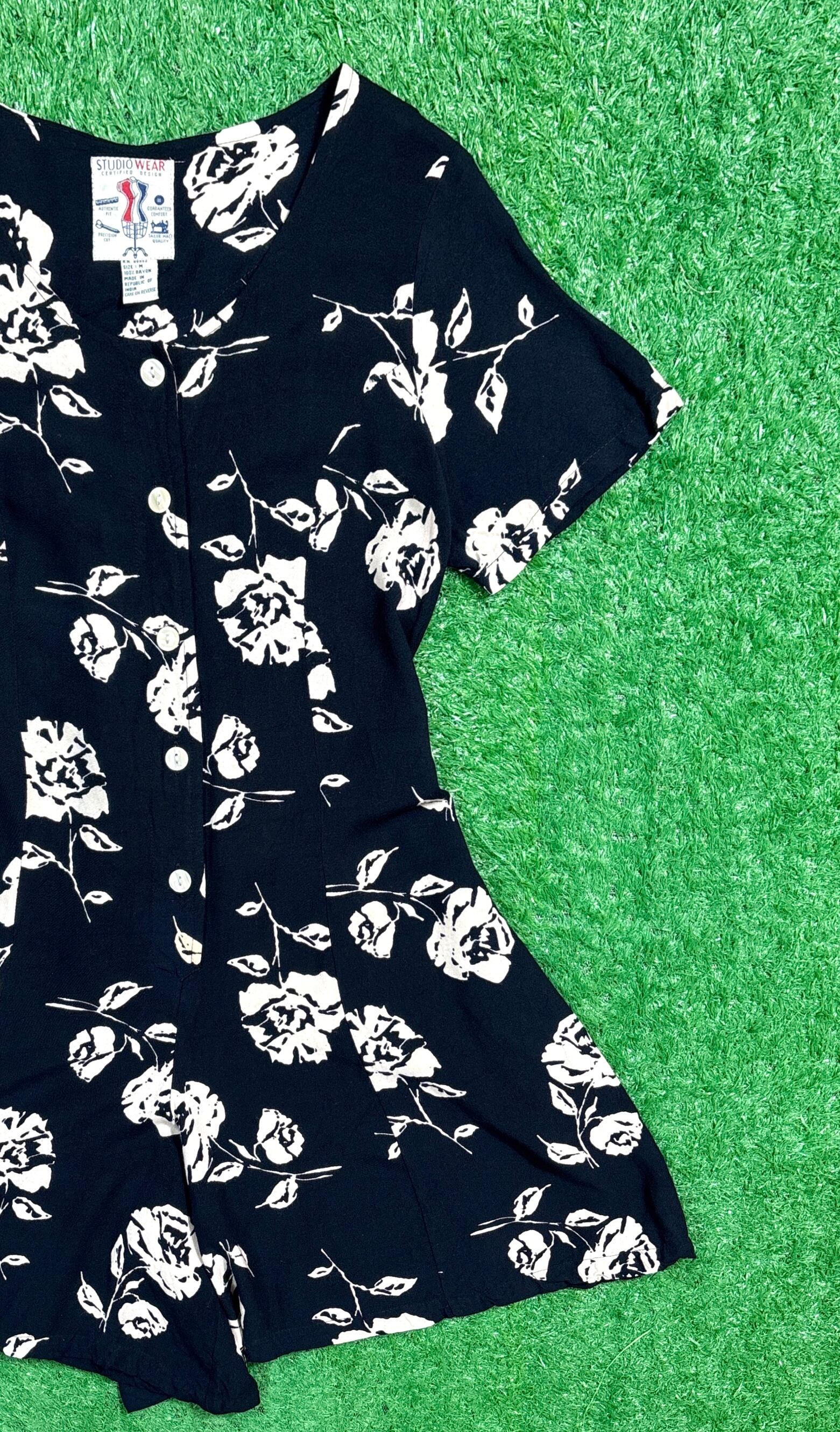 ブラックベースにホワイトのフラワープリントが映えるレーヨン素材の一枚。柔らかく落ち感のある生地が女性らしいシルエットを作り、ノーカラーデザインが首元をすっきりと見せてくれます。フロントはボタン仕様で、ウエスト部分にタックが入りスタイルアップ効果も◎。