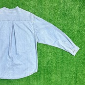 襟をなくしたすっきりとしたデザインで、フロントには大きめのポケットが2つ付き、ワークシャツらしい無骨さを感じさせます。ライトブルーのデニム生地は程よく柔らかく、着心地も良い仕上がり。羽織りとしても、シャツジャケット感覚でも活躍できるアイテムです。