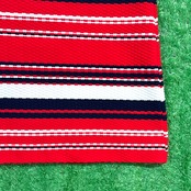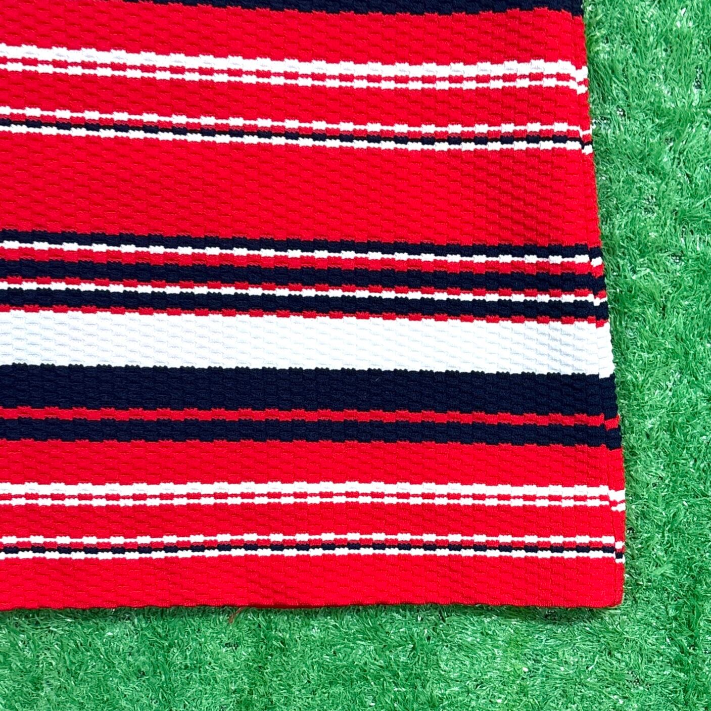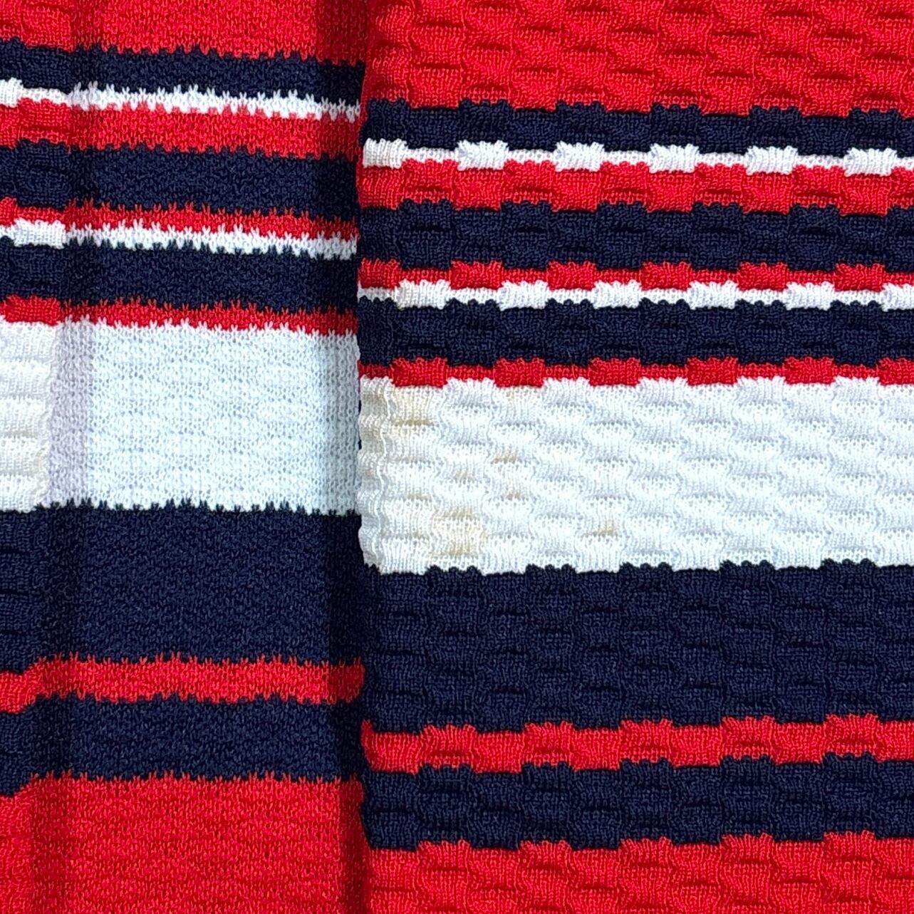鮮やかなレッドを基調に、ホワイトやネイビーのラインを組み合わせたボーダーパターンが印象的。ジャージのようなシャカッとしたポリエステル素材で、軽やかな着心地が特徴です。長めの着丈でヒップラインをしっかりカバーし、縦のラインを強調してくれるのでスタイル良く見える一着。