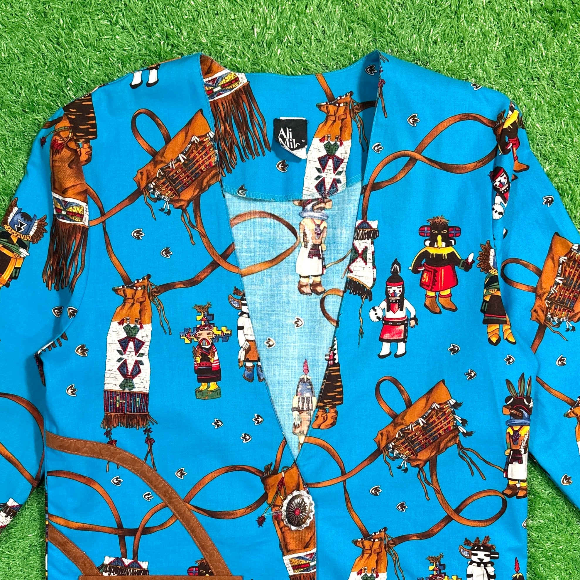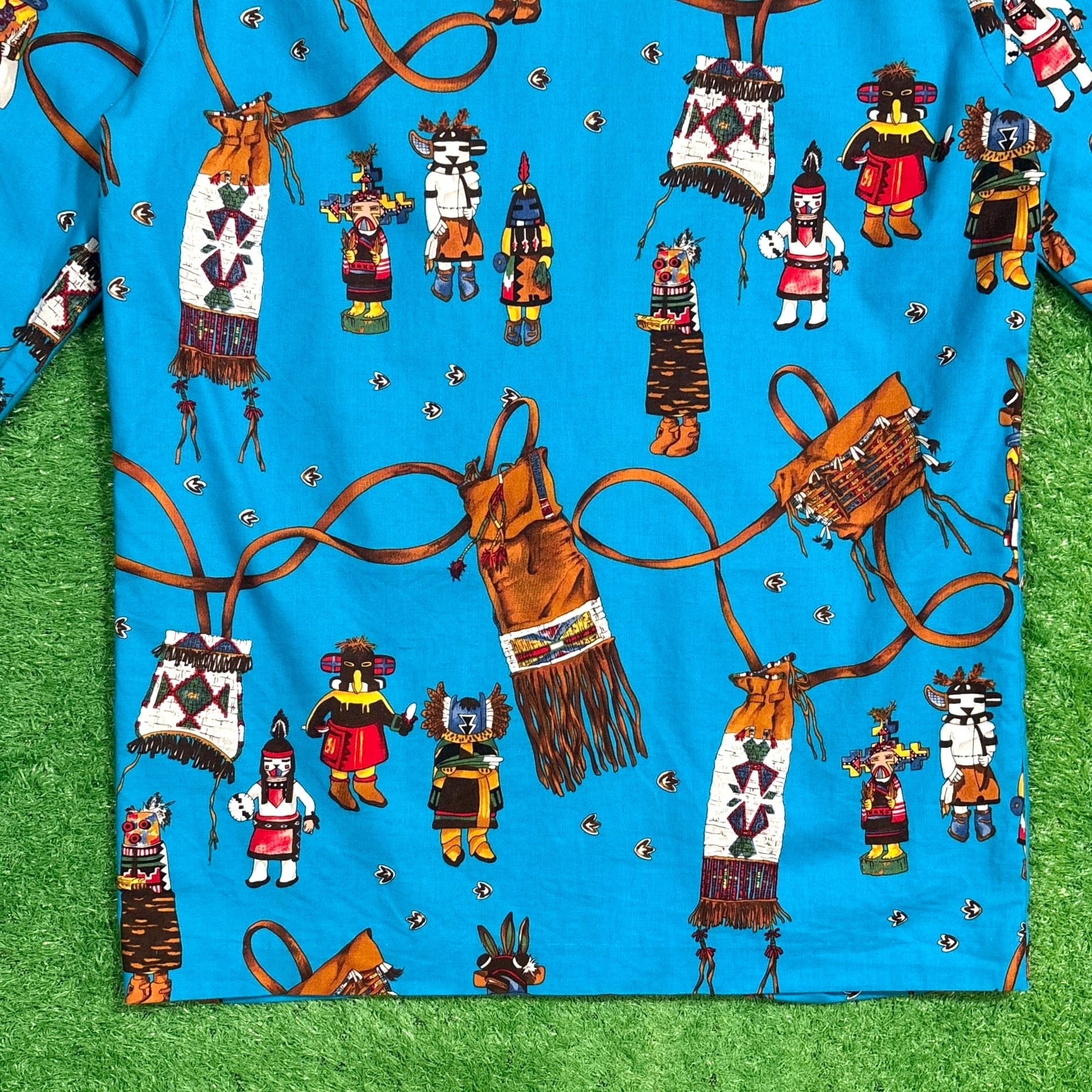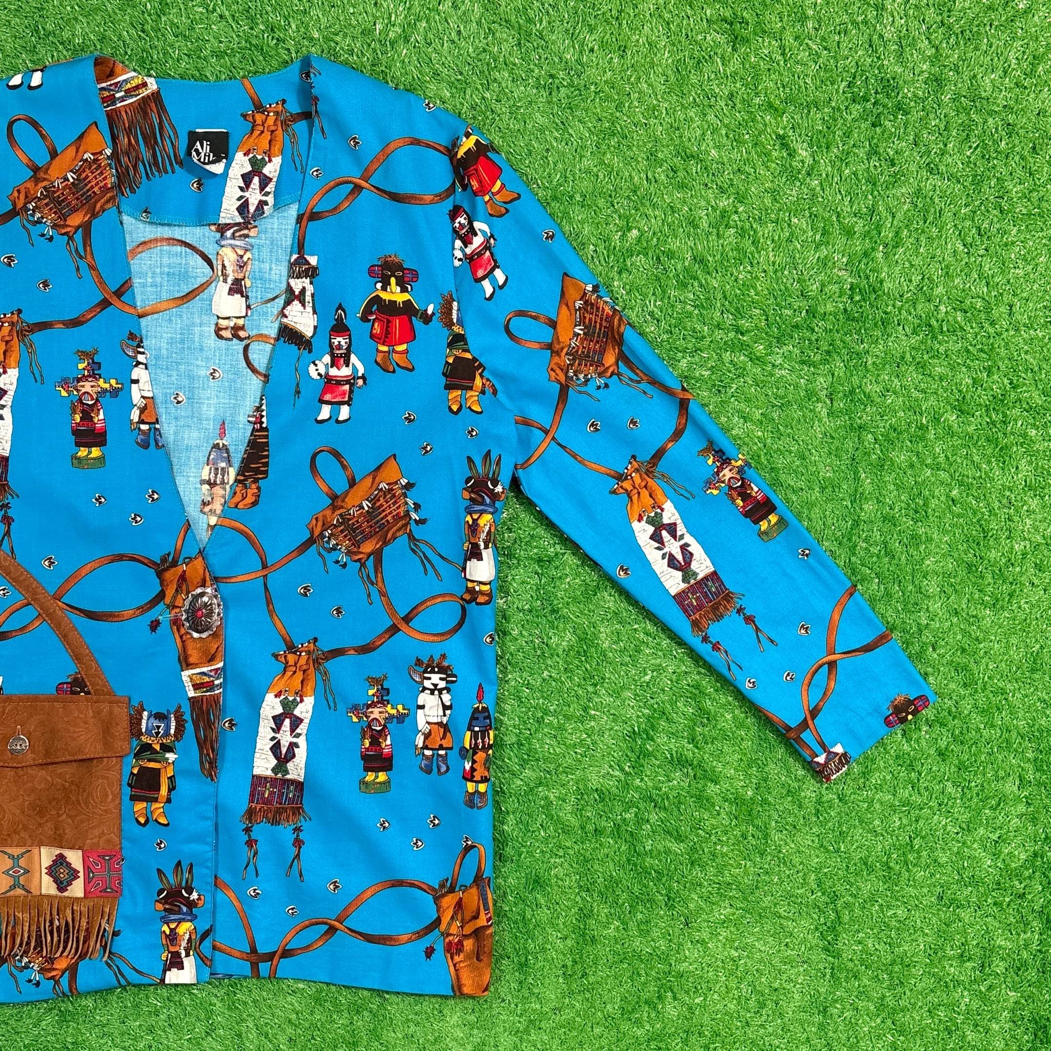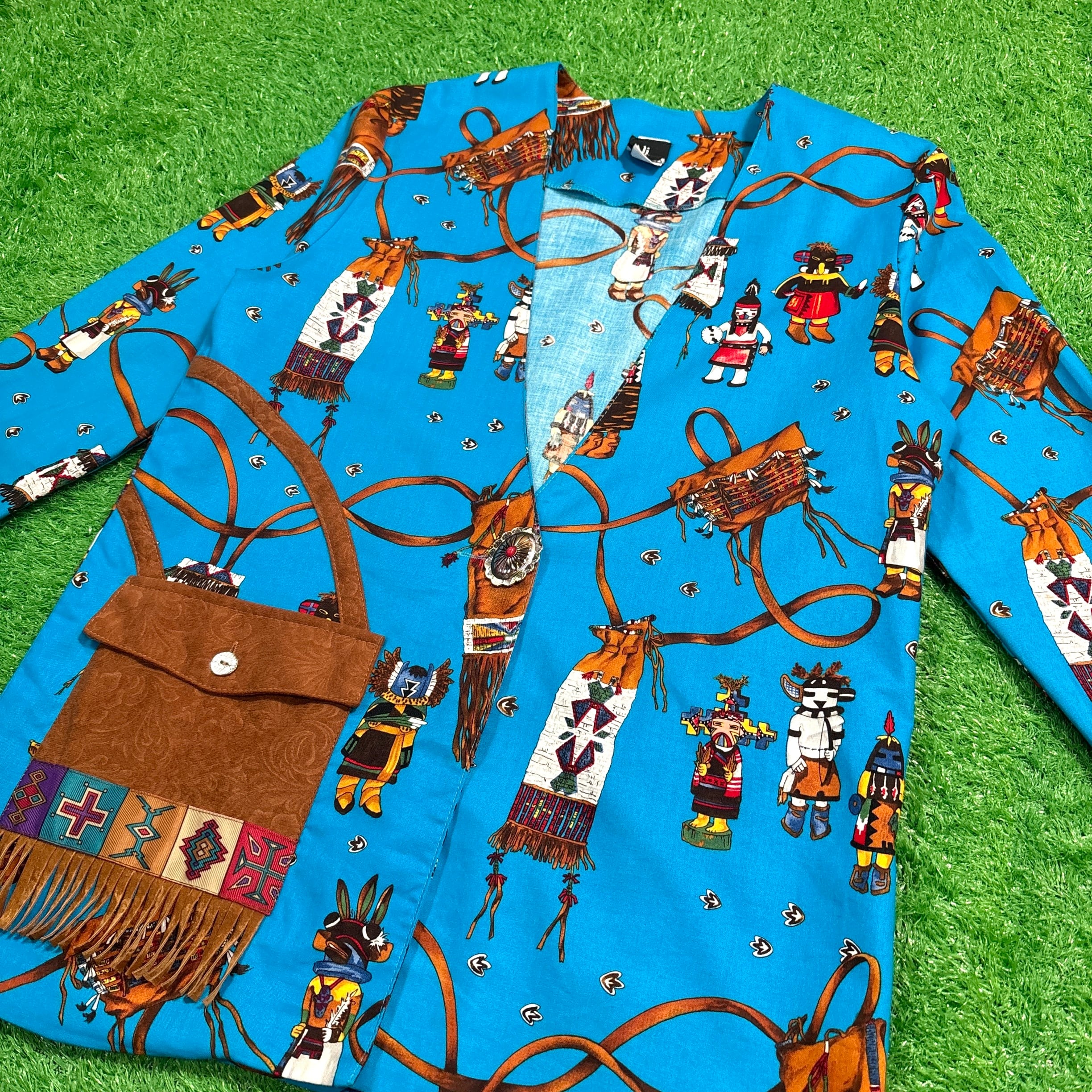 鮮やかなブルーをベースに、カチナ(カチーナ)人形のデザインが総柄でプリントされた存在感抜群の一枚。フロントにはスウェード調のフリンジ付きポケットとコンチョボタンが配され、民族調のディテールがアクセントになっています。レディースアイテムとして作られていますが、サイズが合えばユニセックスで着用可能です。