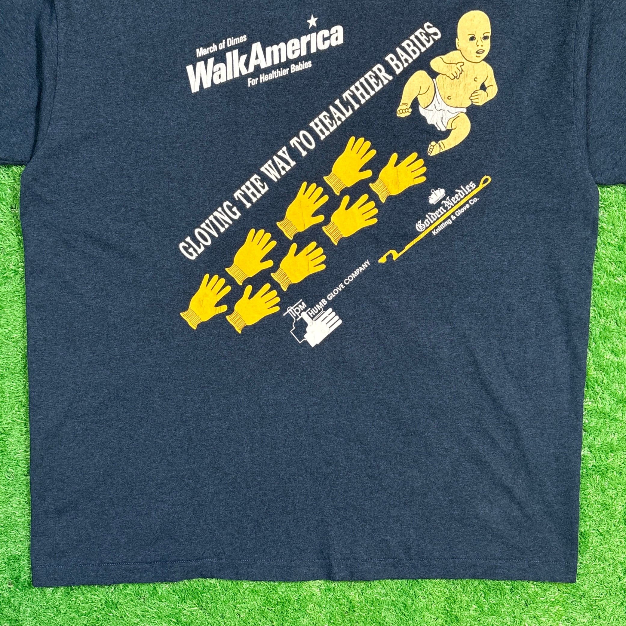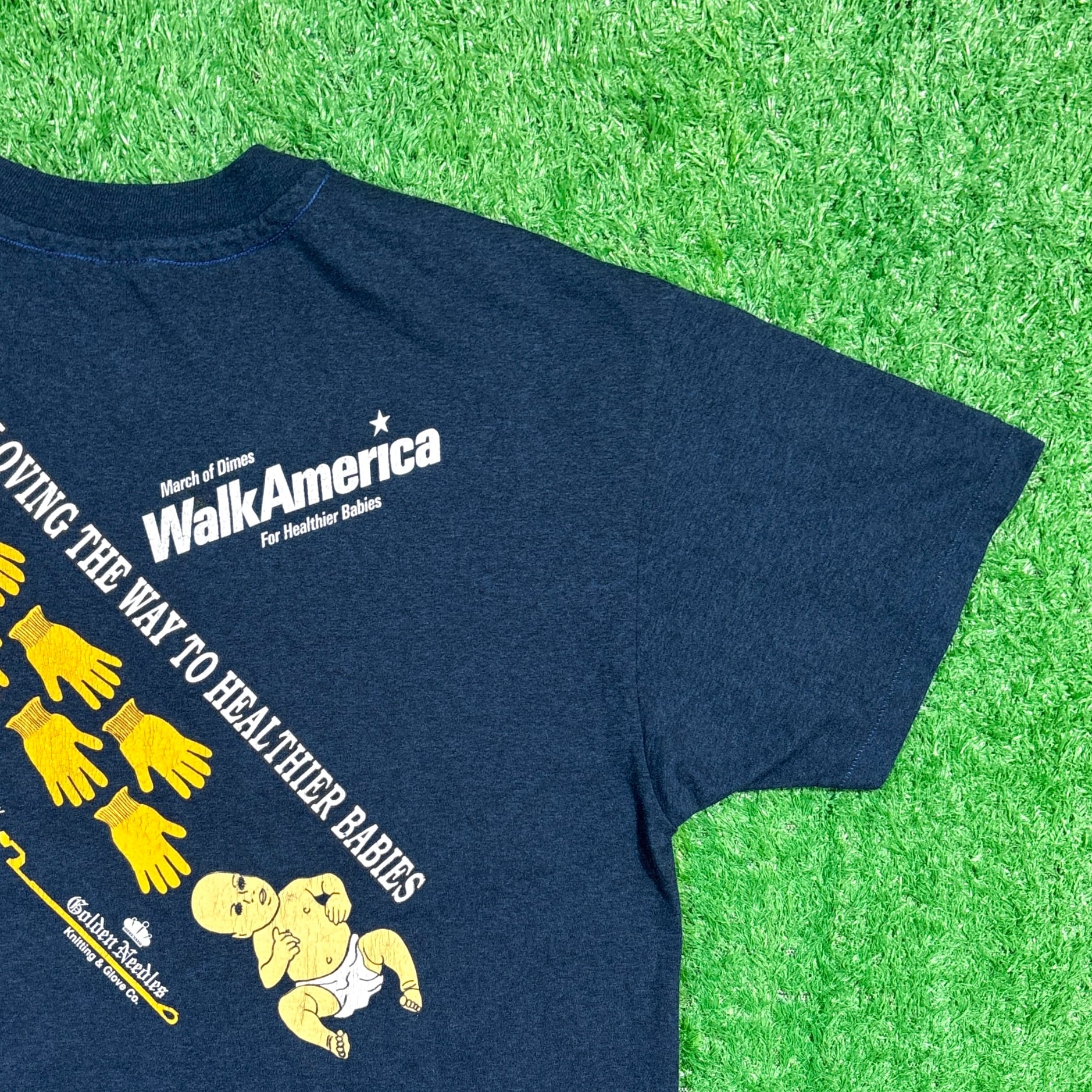 「WalkAmerica」はアメリカのチャリティウォークイベントで、健康な赤ちゃんの誕生をサポートする目的で全米各地で開催されていました。フロントとバックには、赤ちゃんと黄色い手袋のイラスト、そして「GLOVING THE WAY TO HEALTHIER BABIES(より健康な赤ちゃんのために手を差し伸べよう)」というキャッチコピーがプリントされています。ネイビーボディに映えるユニークでメッセージ性の強いデザインが魅力です。