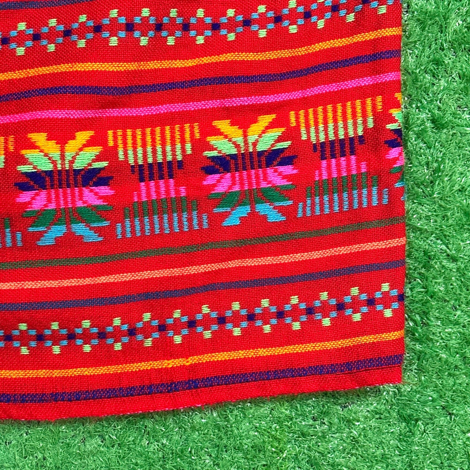 鮮やかなレッドカラーをベースに、幾何学模様や民族調のパターンが織り込まれた総柄デザイン。ニットのような柔らかい素材感で、ウエストはゴム仕様になっており、リラックスして着用できます。丈感は膝から膝下くらいで、バランスよく着こなせるシルエットです。