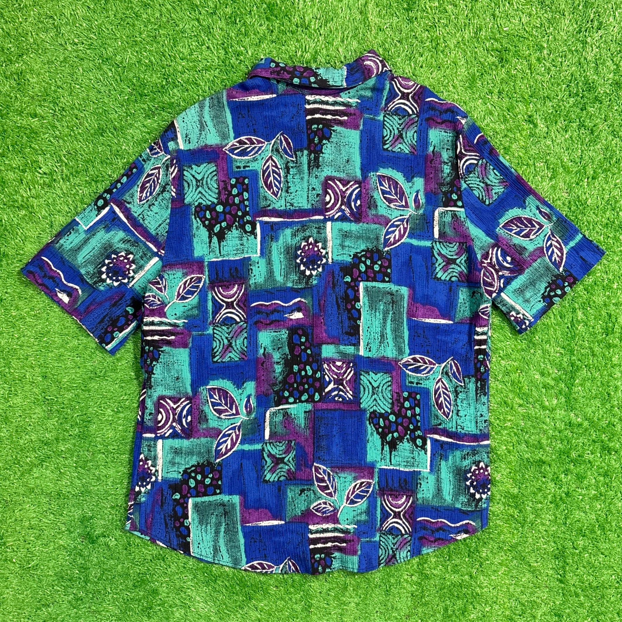 ブルー×グリーンを基調に、植物モチーフや抽象的なデザインが組み合わされた総柄デザイン。縦シワ感のあるざらっとした肌触りのレーヨン・ポリエステル素材で、涼しげな着心地が特徴です。夏らしい軽快な印象を与えてくれる一枚です。