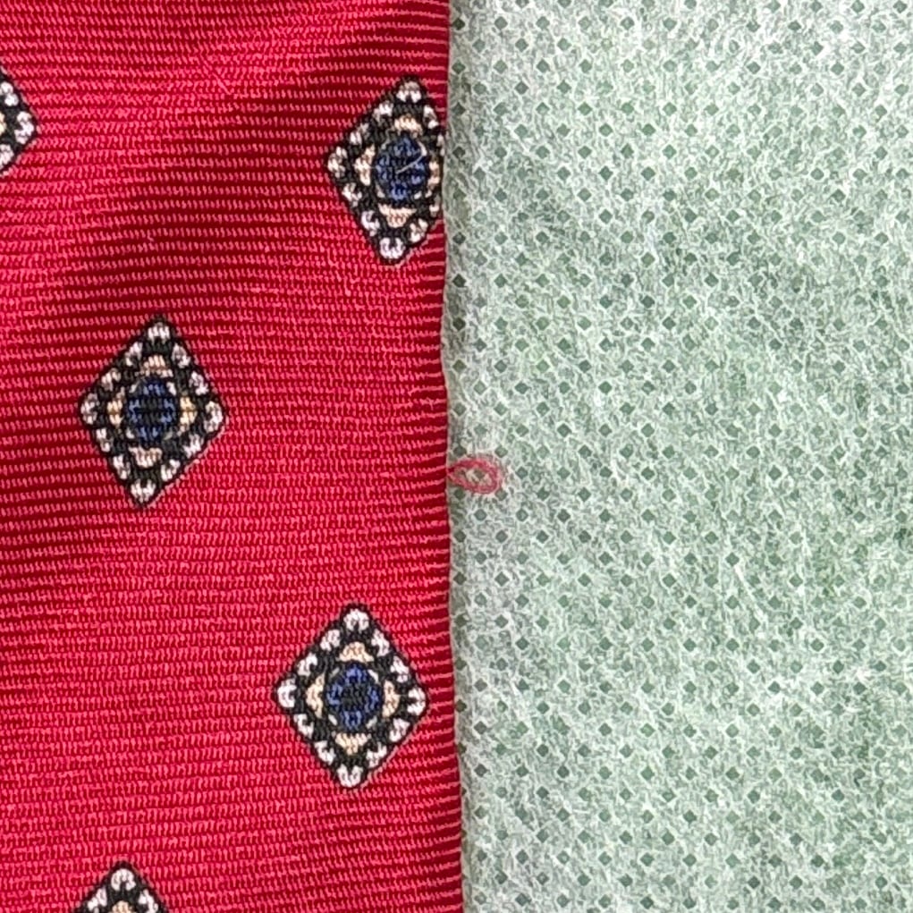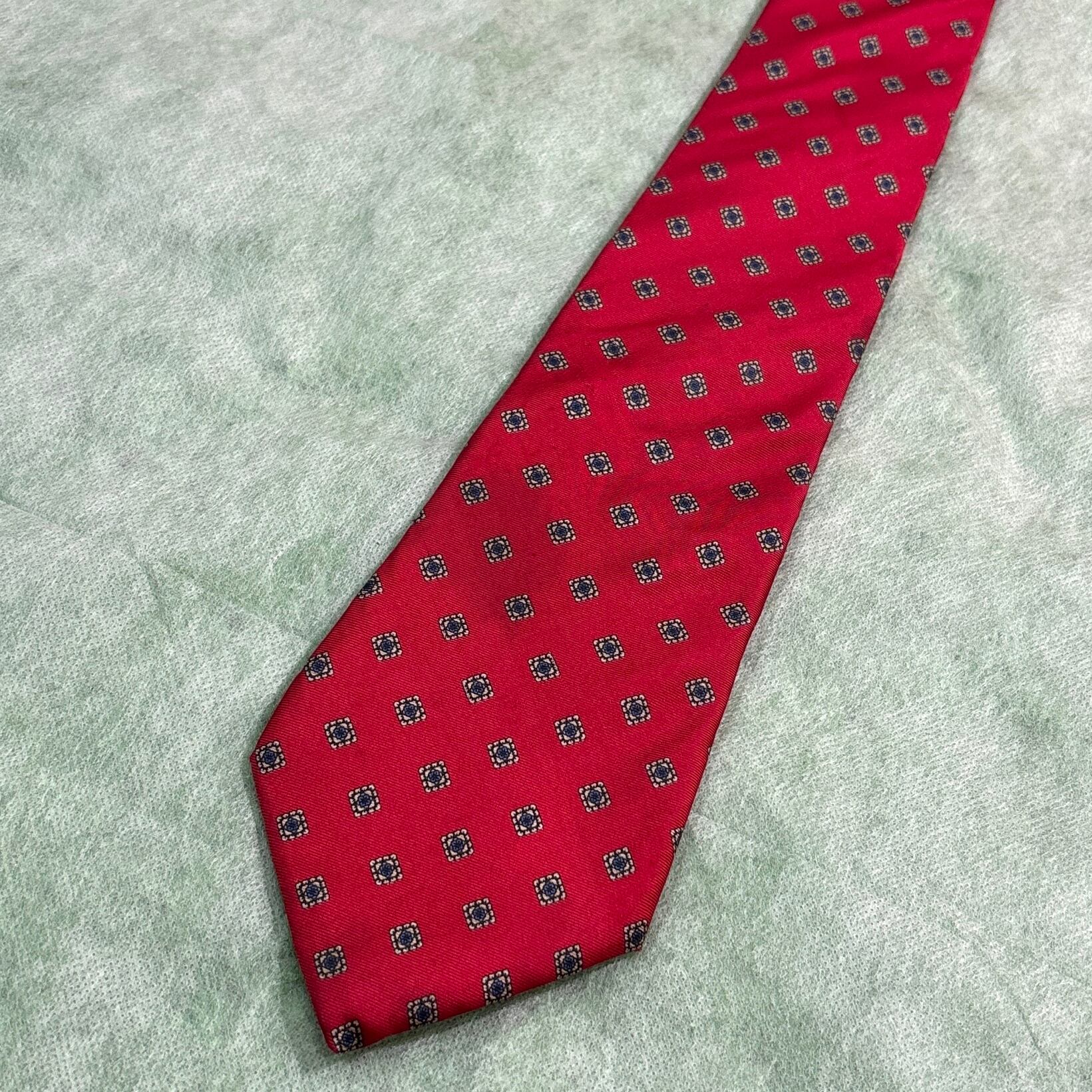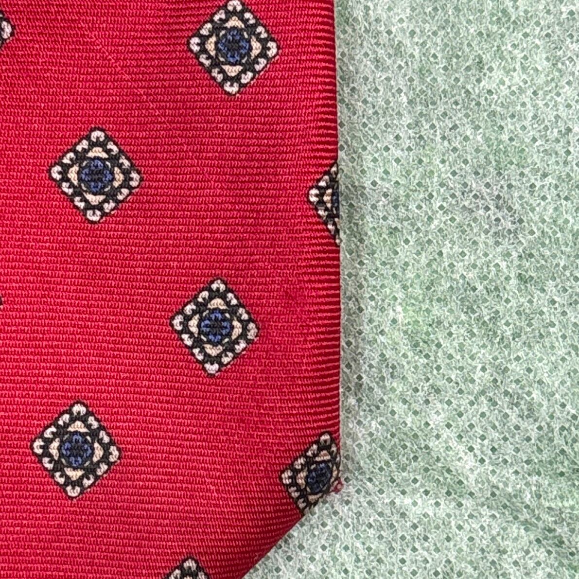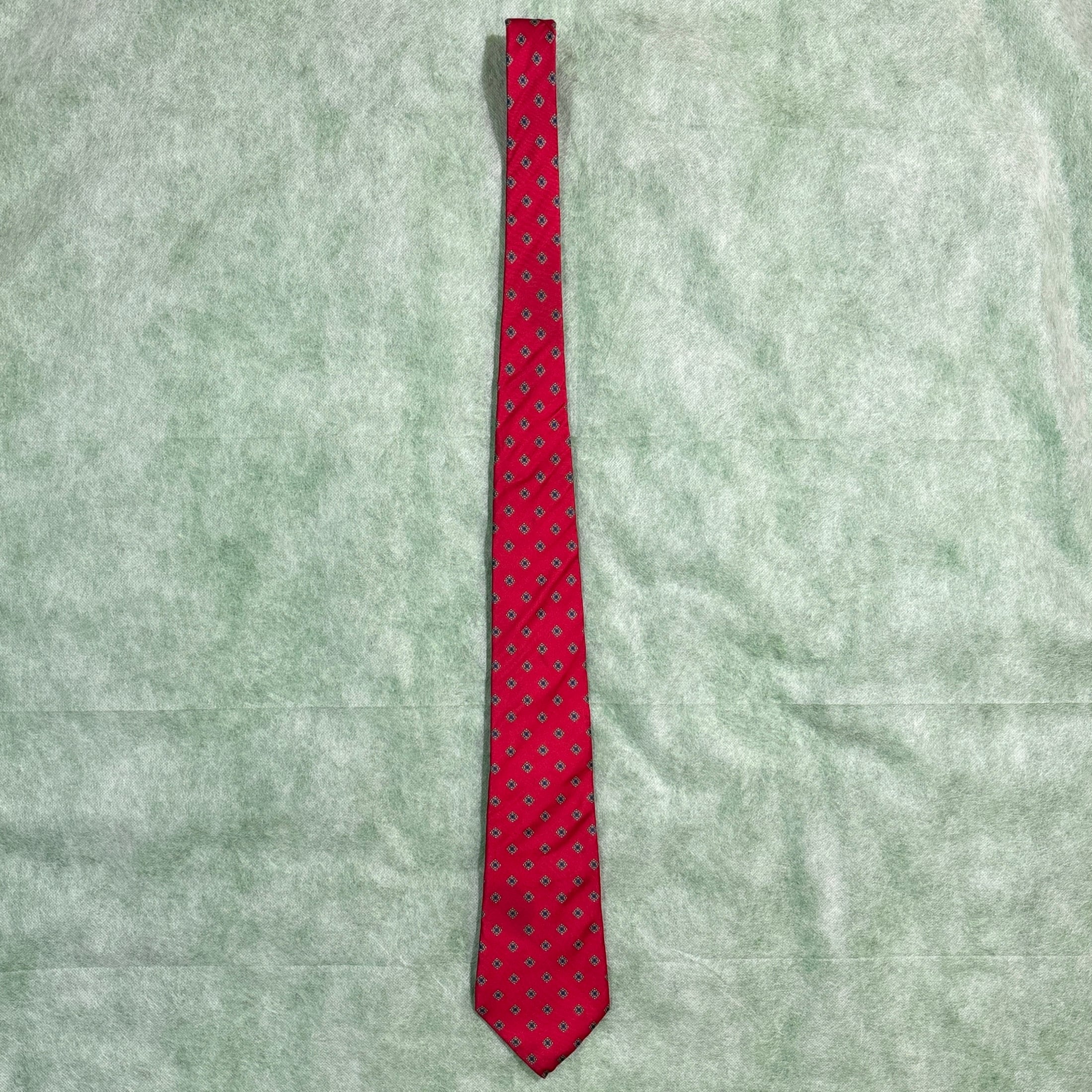 鮮やかなレッドカラーに、スクエアモチーフを規則的に並べた幾何学的なデザインが特徴。上品さと存在感を兼ね備えたクラシカルな雰囲気の一本で、ビジネスからフォーマルまで幅広く活躍します。
