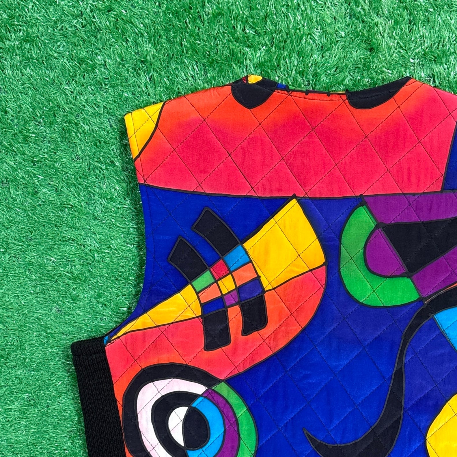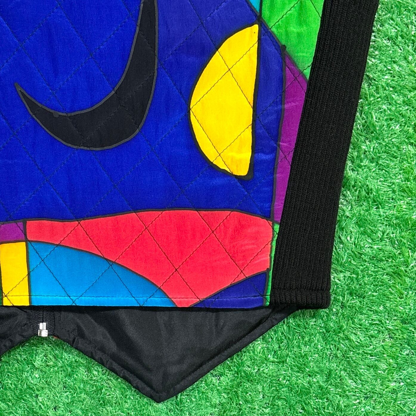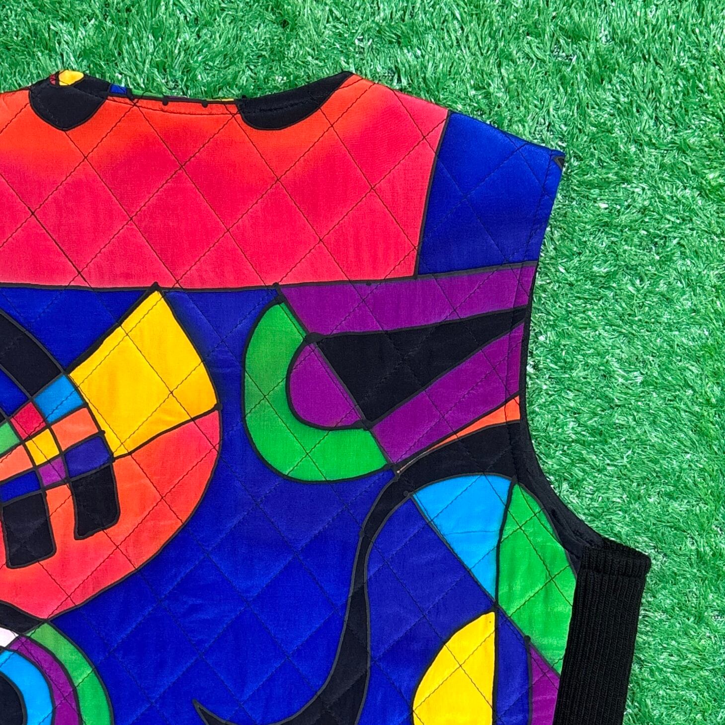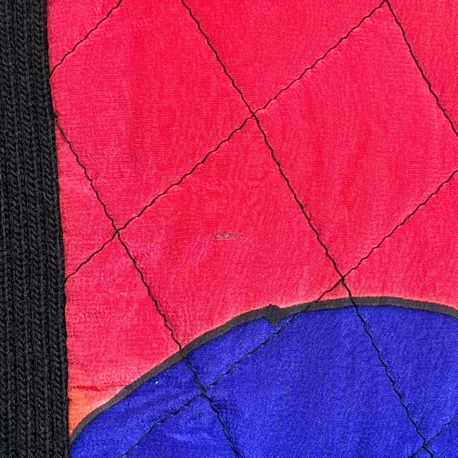 マルチカラーのキルティングボディに、ヒッピーアート感のあるのイラストが印象的。薄手のキルティング仕様で、両サイドの黒い部分は伸縮性のあるニット生地になっており、着心地の良さも魅力です。素材表記はありませんが、シルクのような軽く滑らかな質感が感じられる一着です。