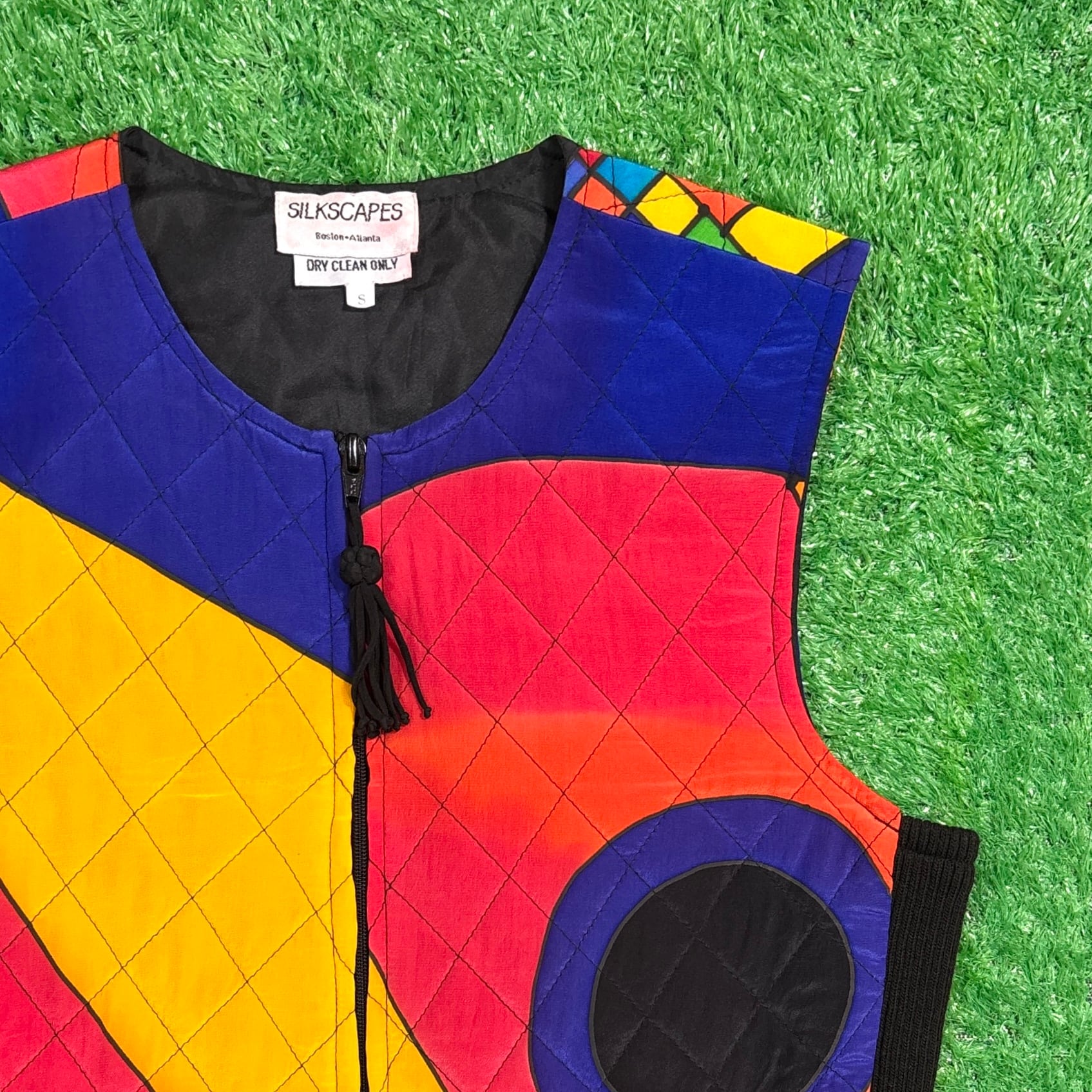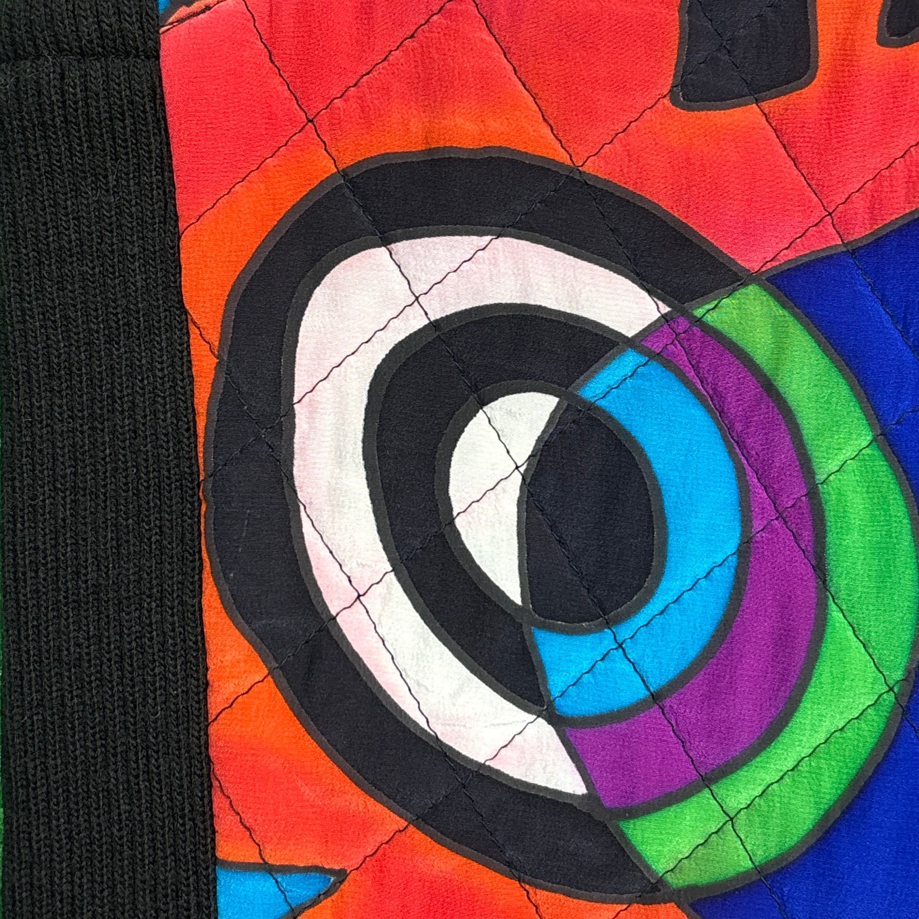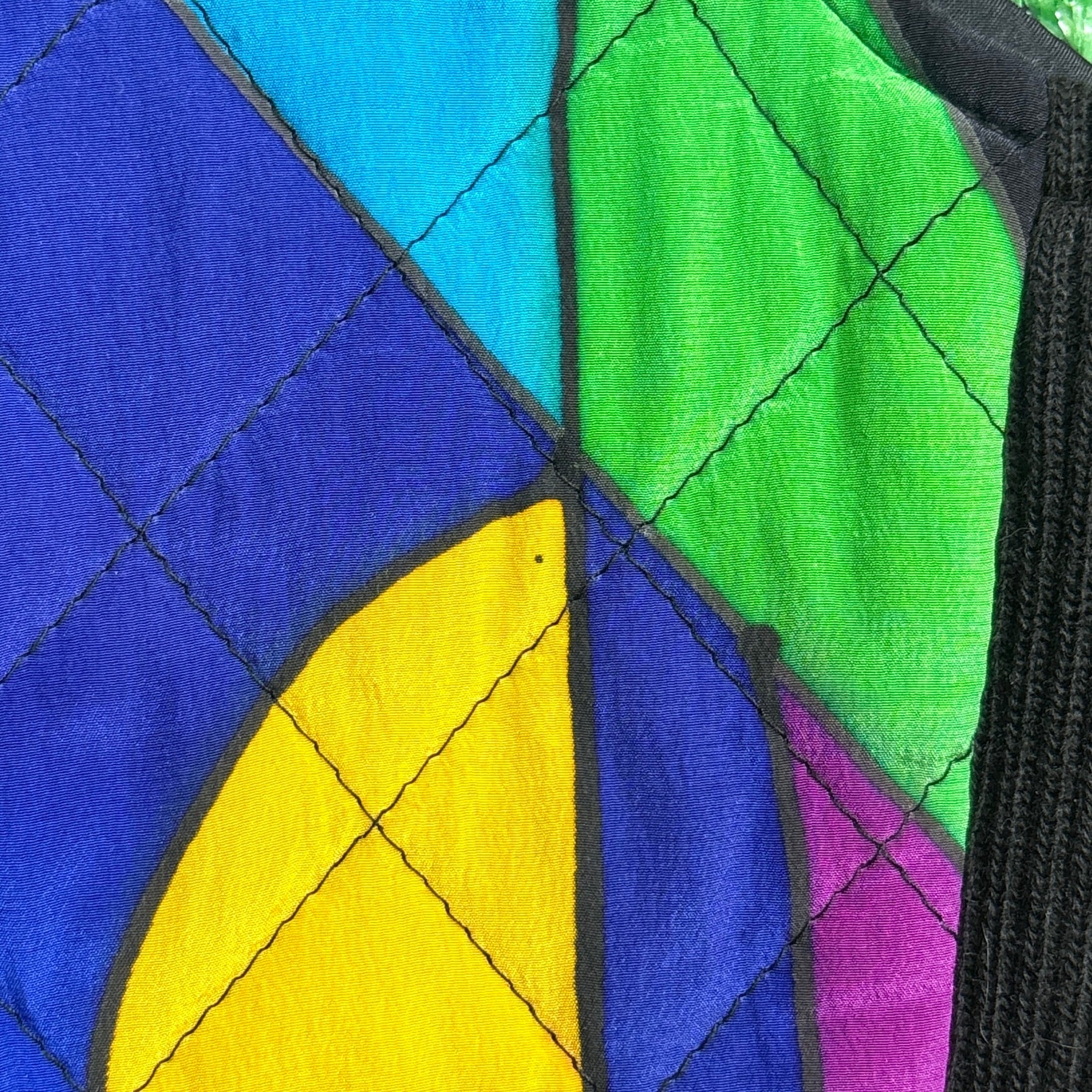 マルチカラーのキルティングボディに、ヒッピーアート感のあるのイラストが印象的。薄手のキルティング仕様で、両サイドの黒い部分は伸縮性のあるニット生地になっており、着心地の良さも魅力です。素材表記はありませんが、シルクのような軽く滑らかな質感が感じられる一着です。