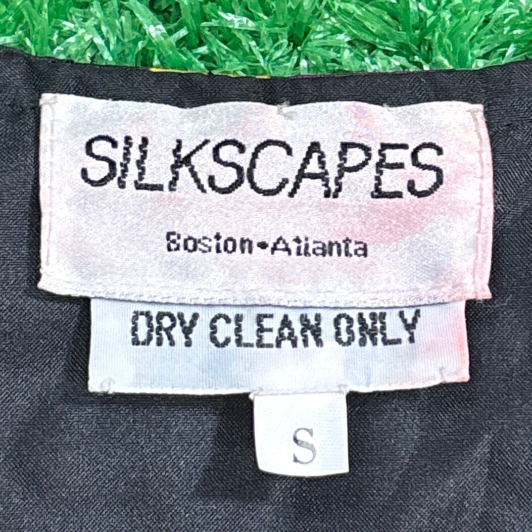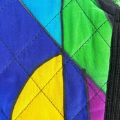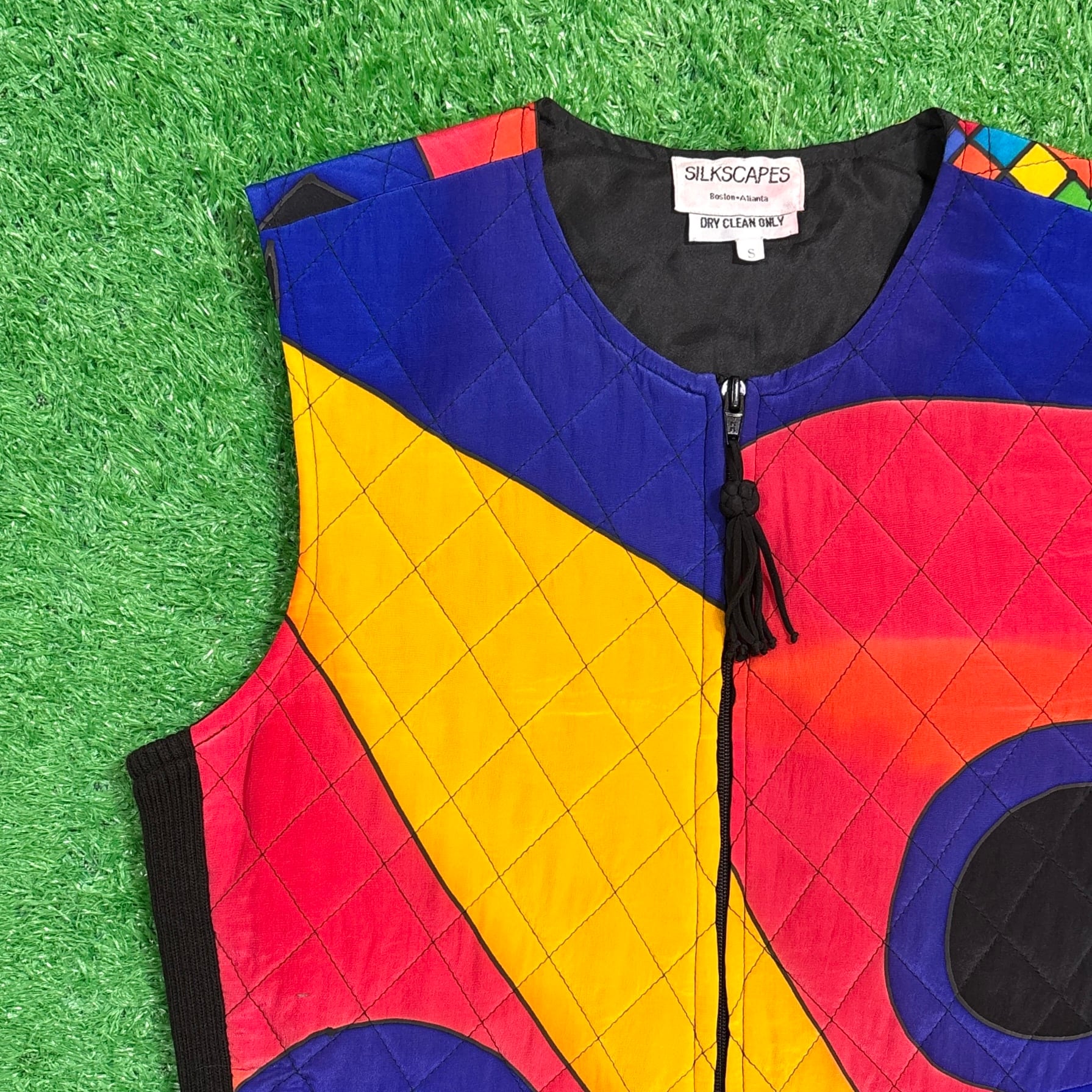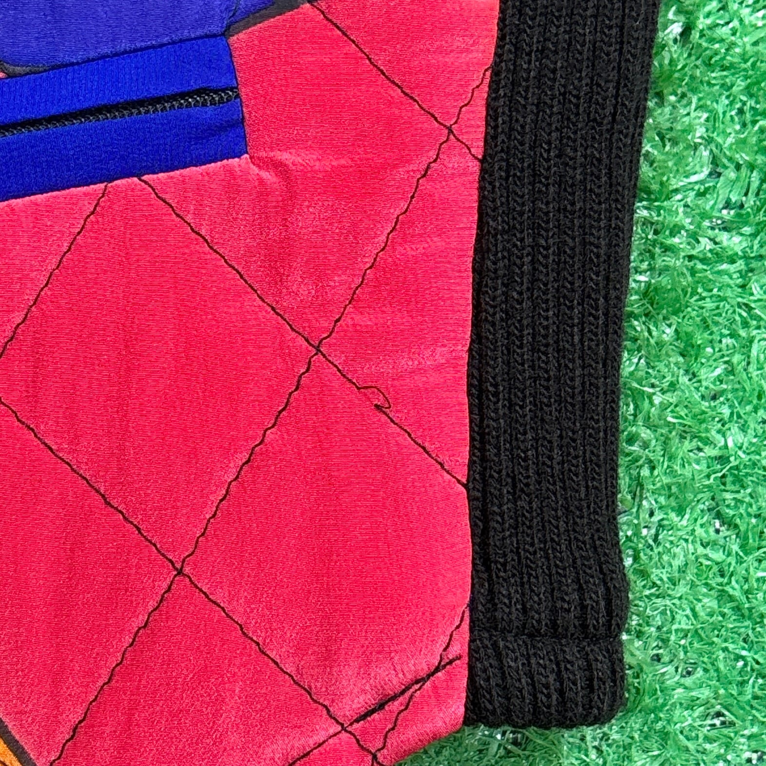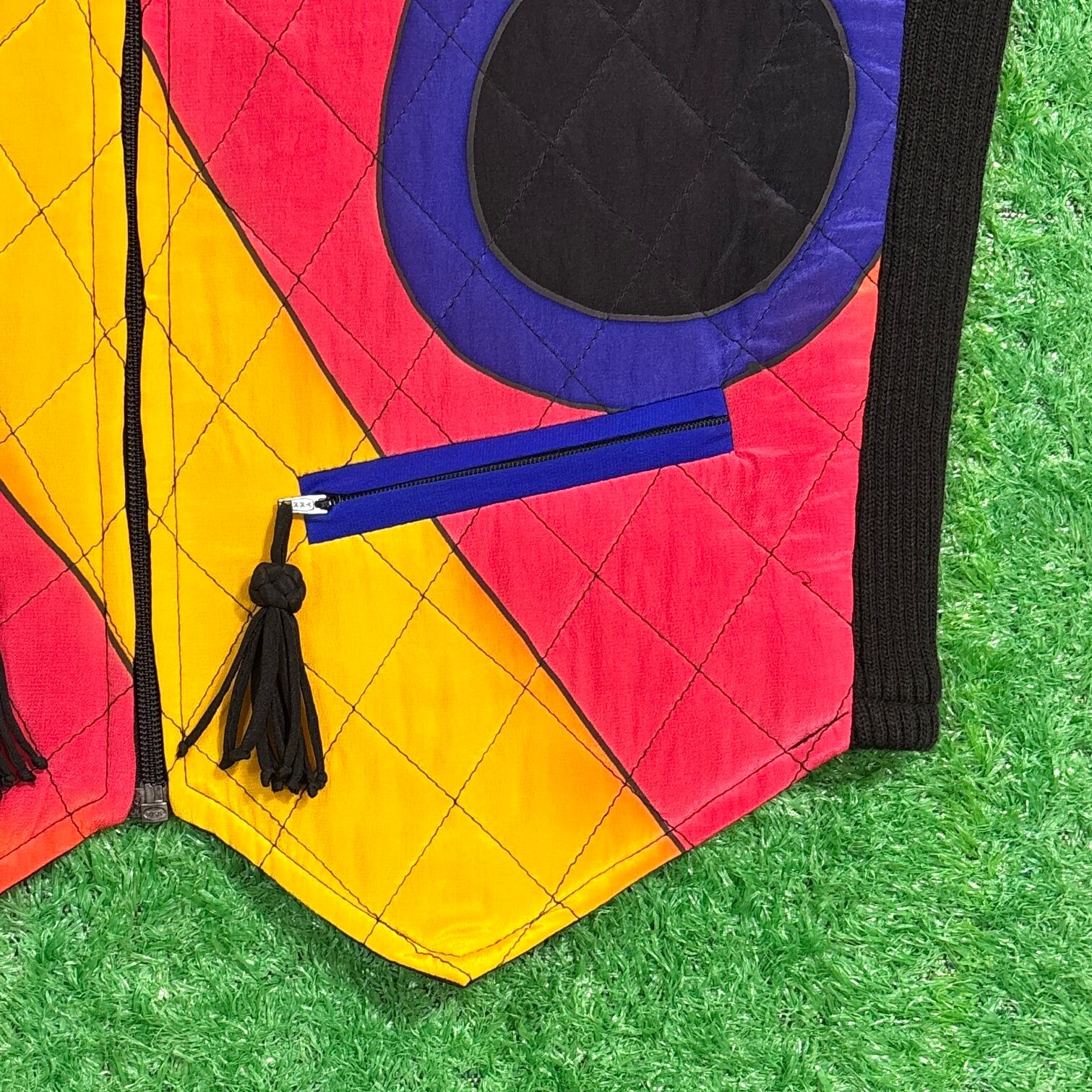 マルチカラーのキルティングボディに、ヒッピーアート感のあるのイラストが印象的。薄手のキルティング仕様で、両サイドの黒い部分は伸縮性のあるニット生地になっており、着心地の良さも魅力です。素材表記はありませんが、シルクのような軽く滑らかな質感が感じられる一着です。